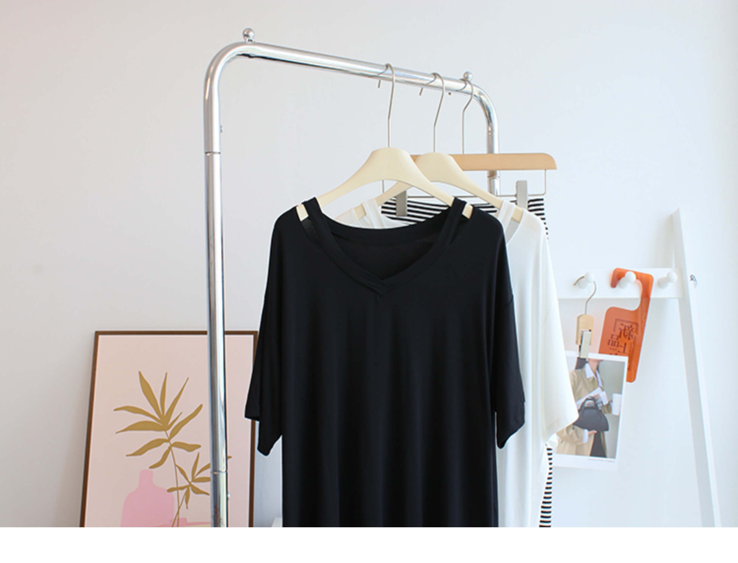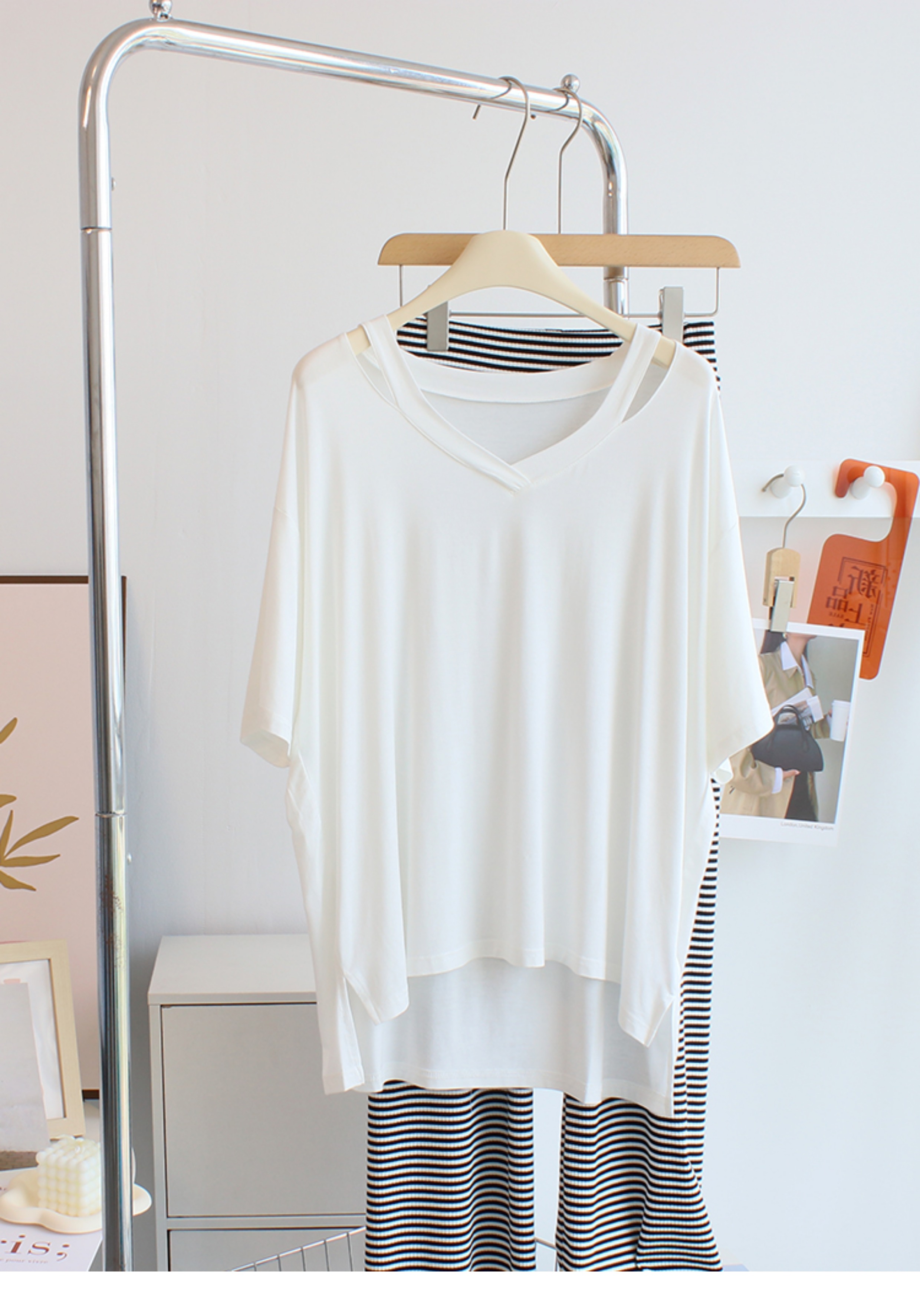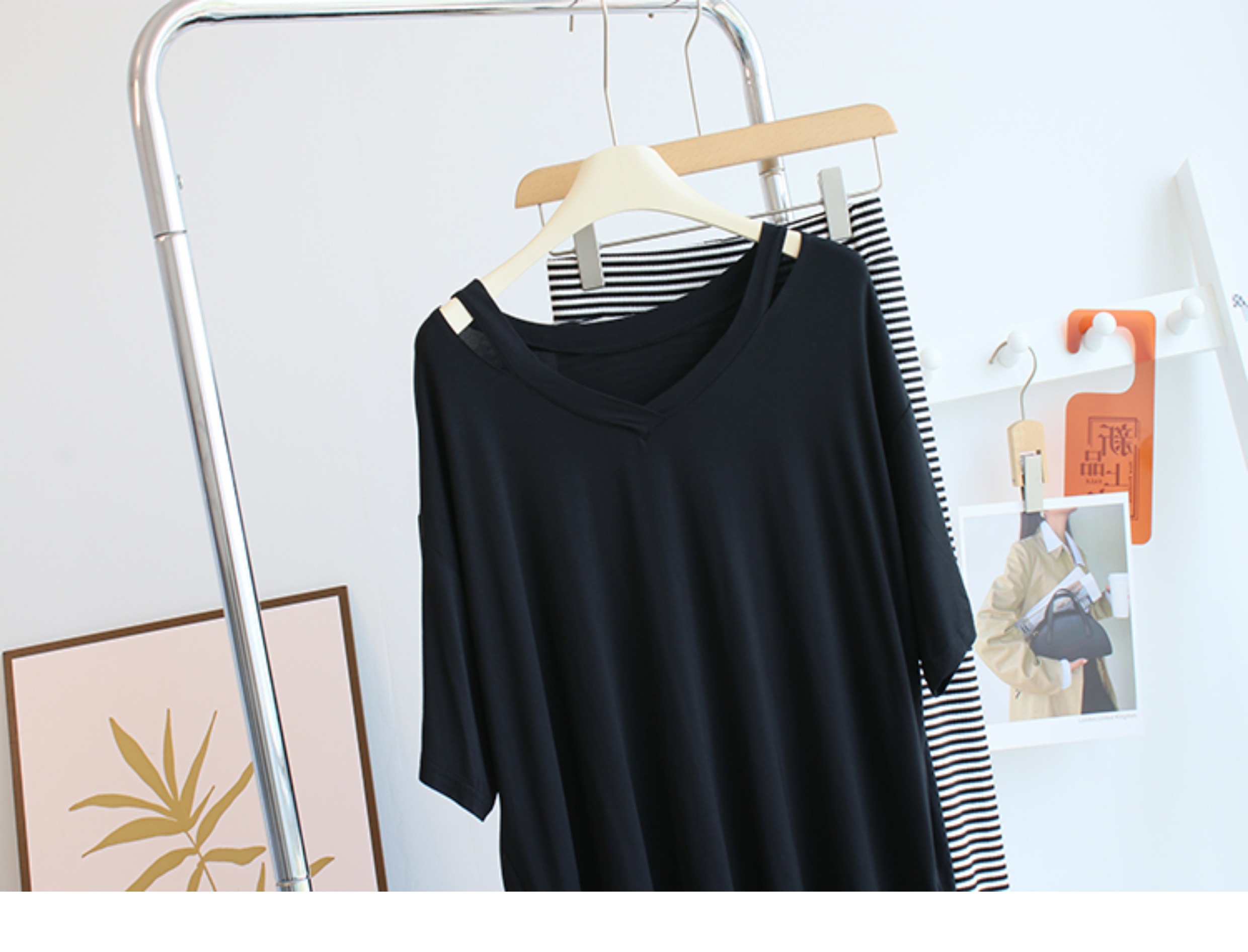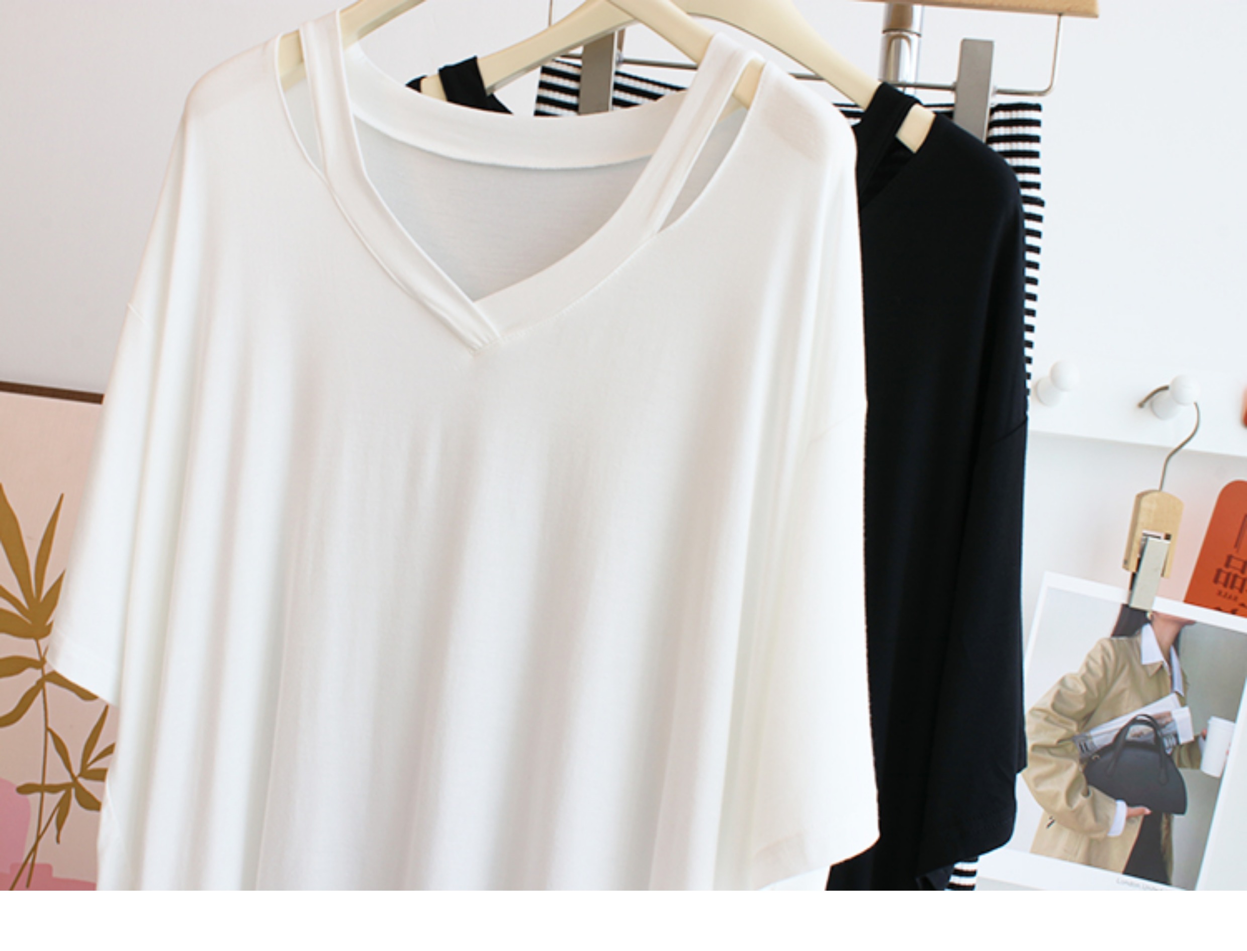 设计感~柔软V领莫代尔t恤女夏季薄款宽松短袖体恤衫开叉运动上衣
