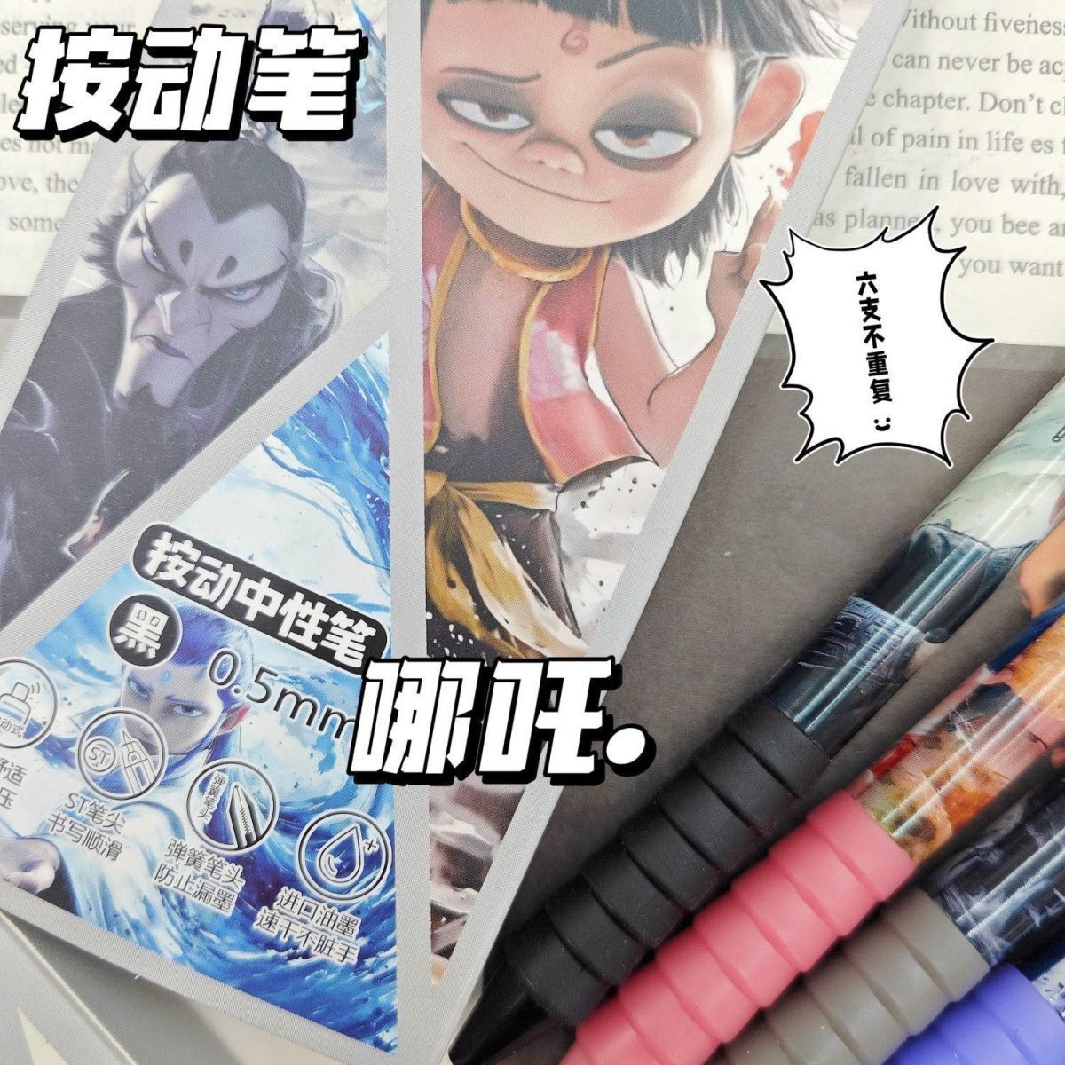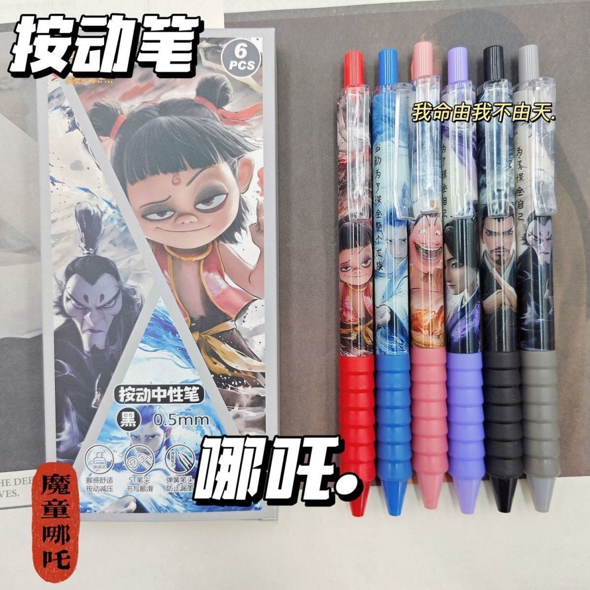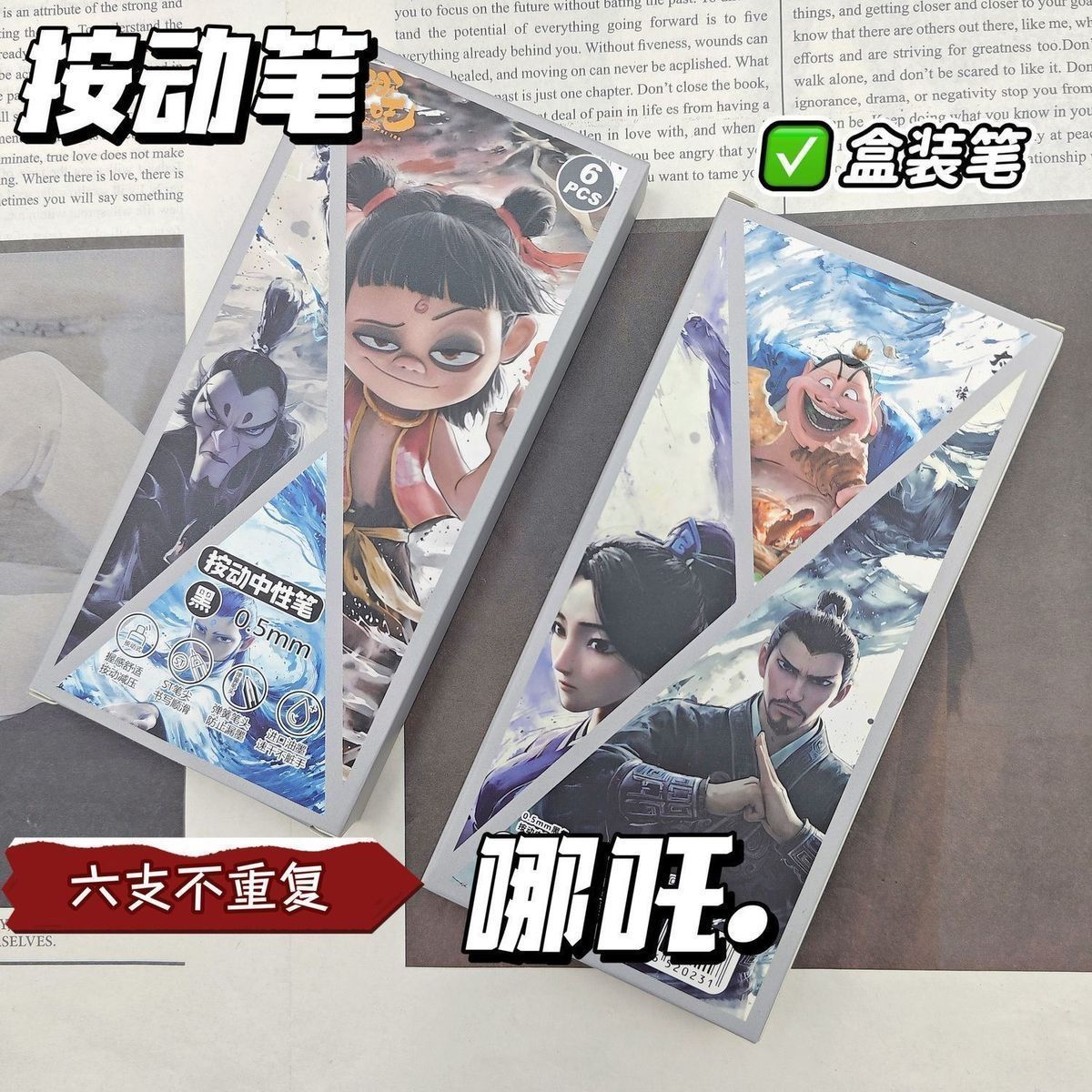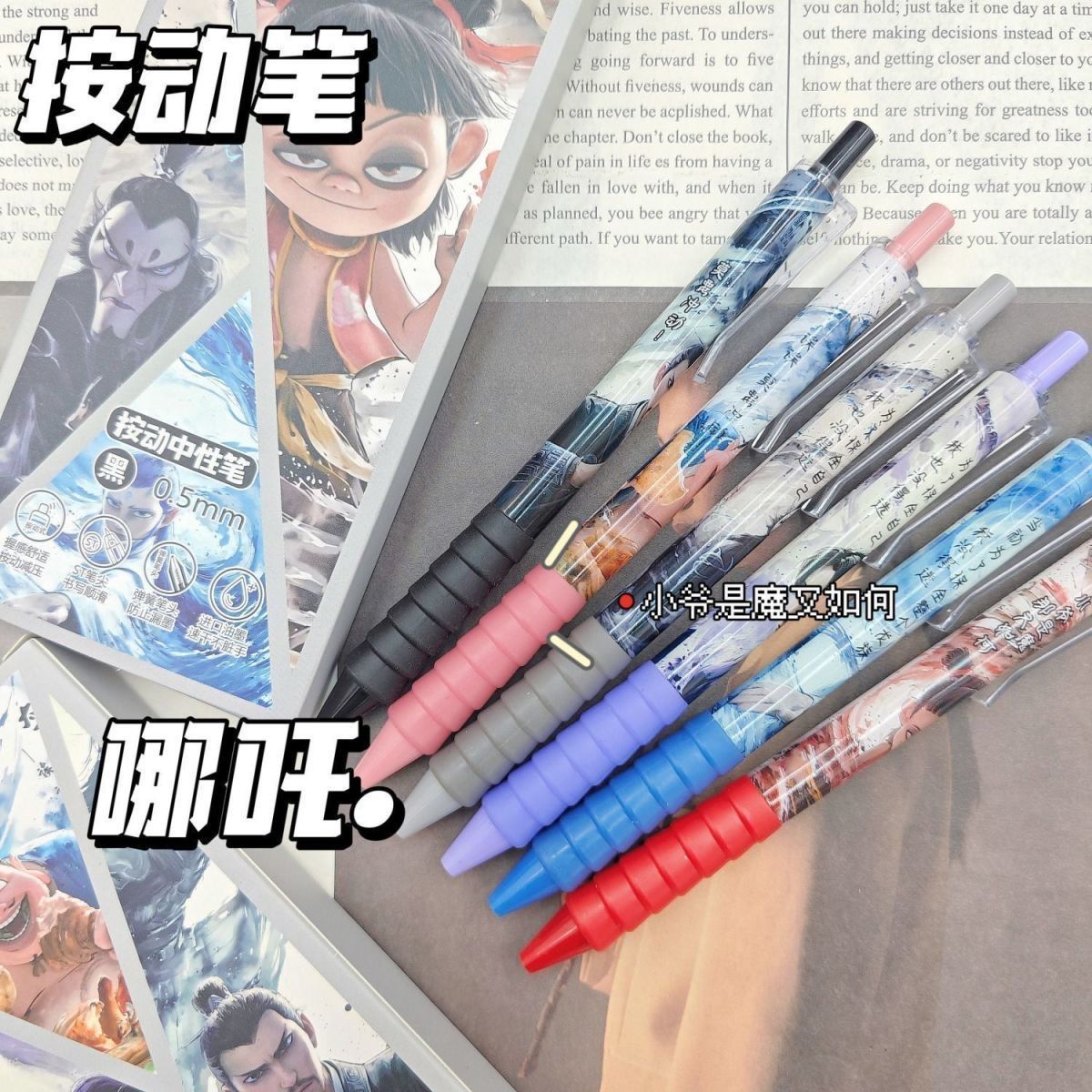 新款超值哪吒盲盒笔按动式中性笔高颜值速干黑色水笔学生哪吒笔