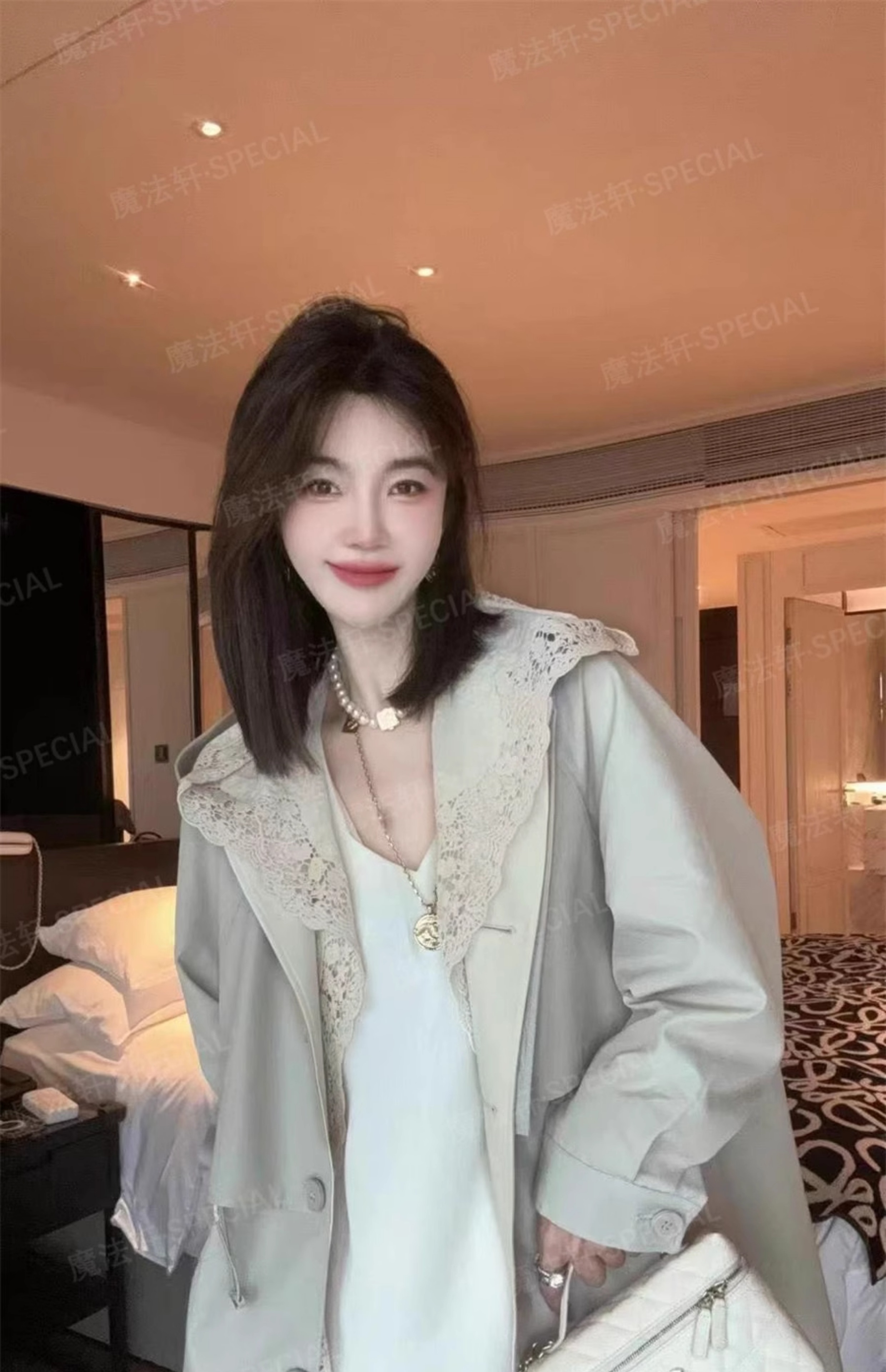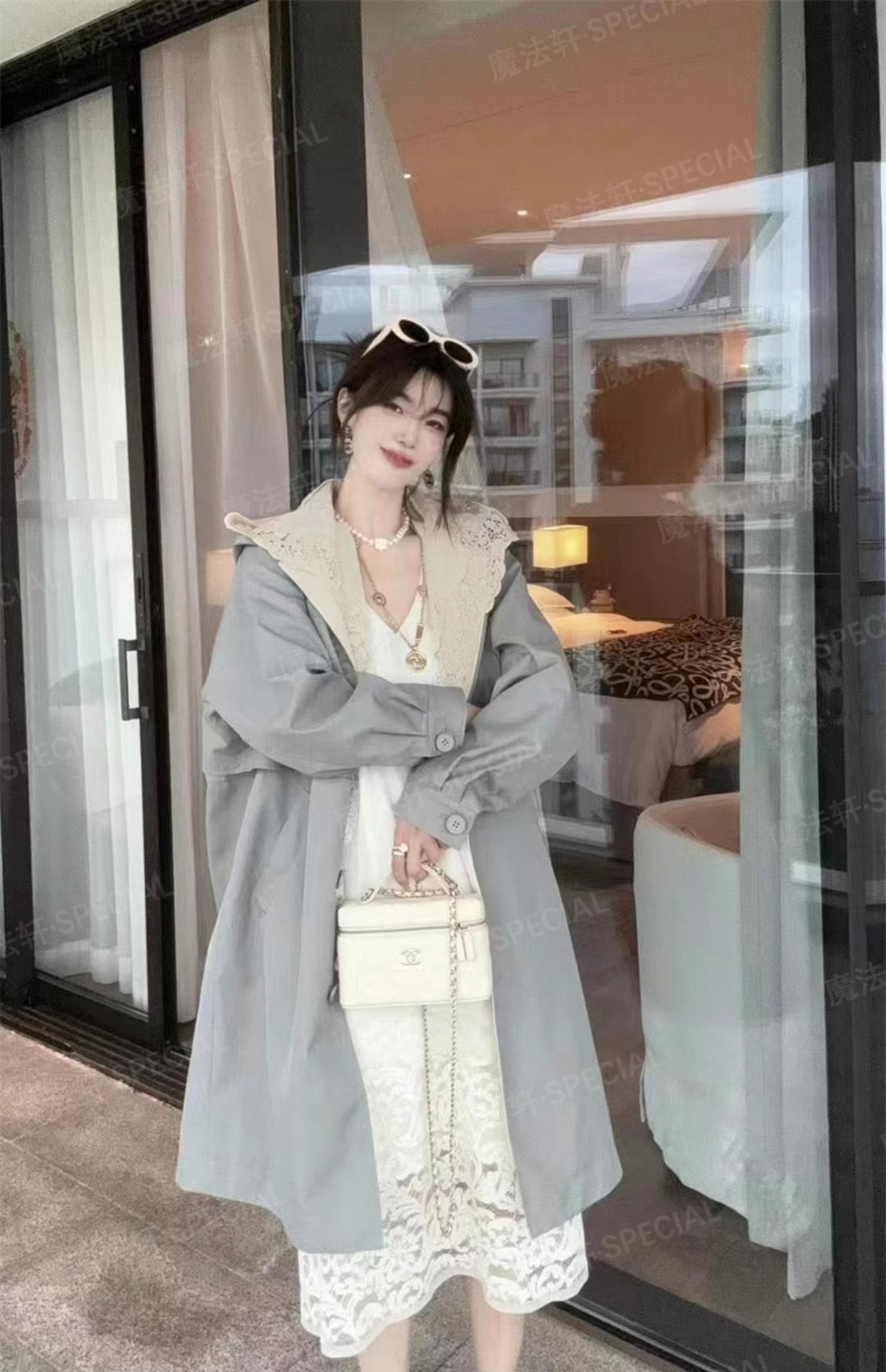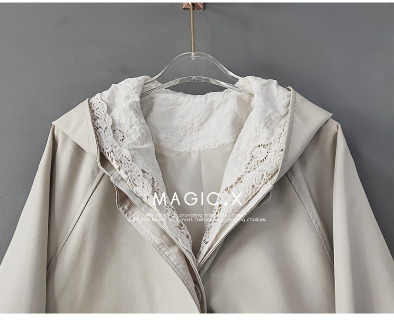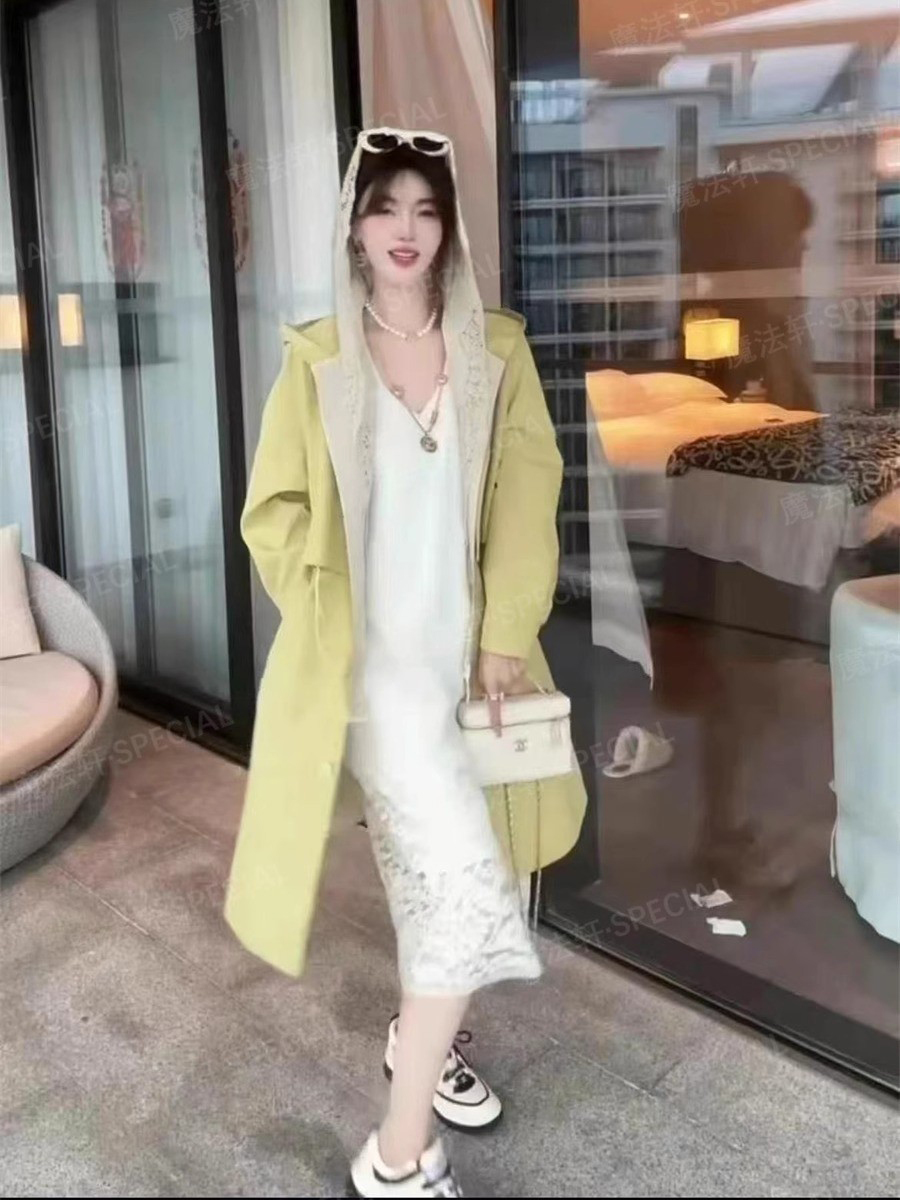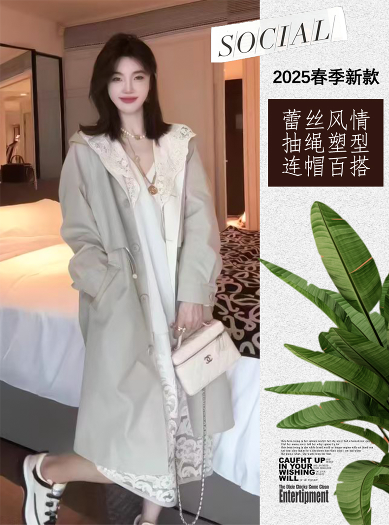 拼色蕾丝假两件风衣外套女2025早春新款连帽中长款上衣欧洲站潮q