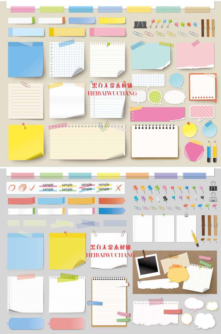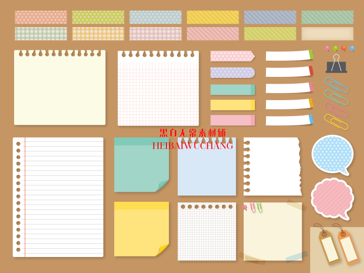 卡通文具便签线圈本纸张作业本胶带夹子别针手账PNG美工装饰素材