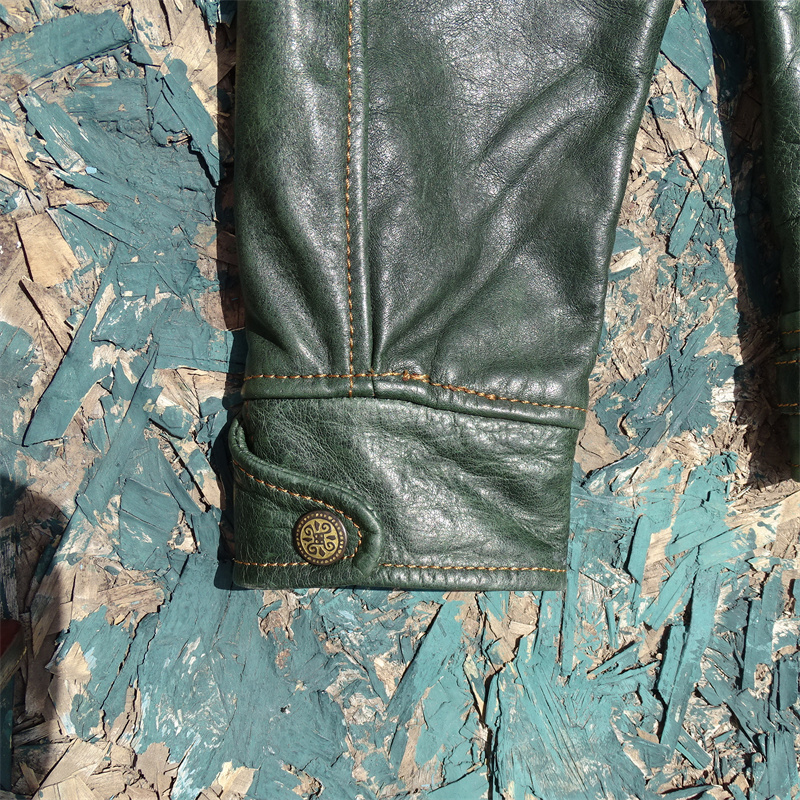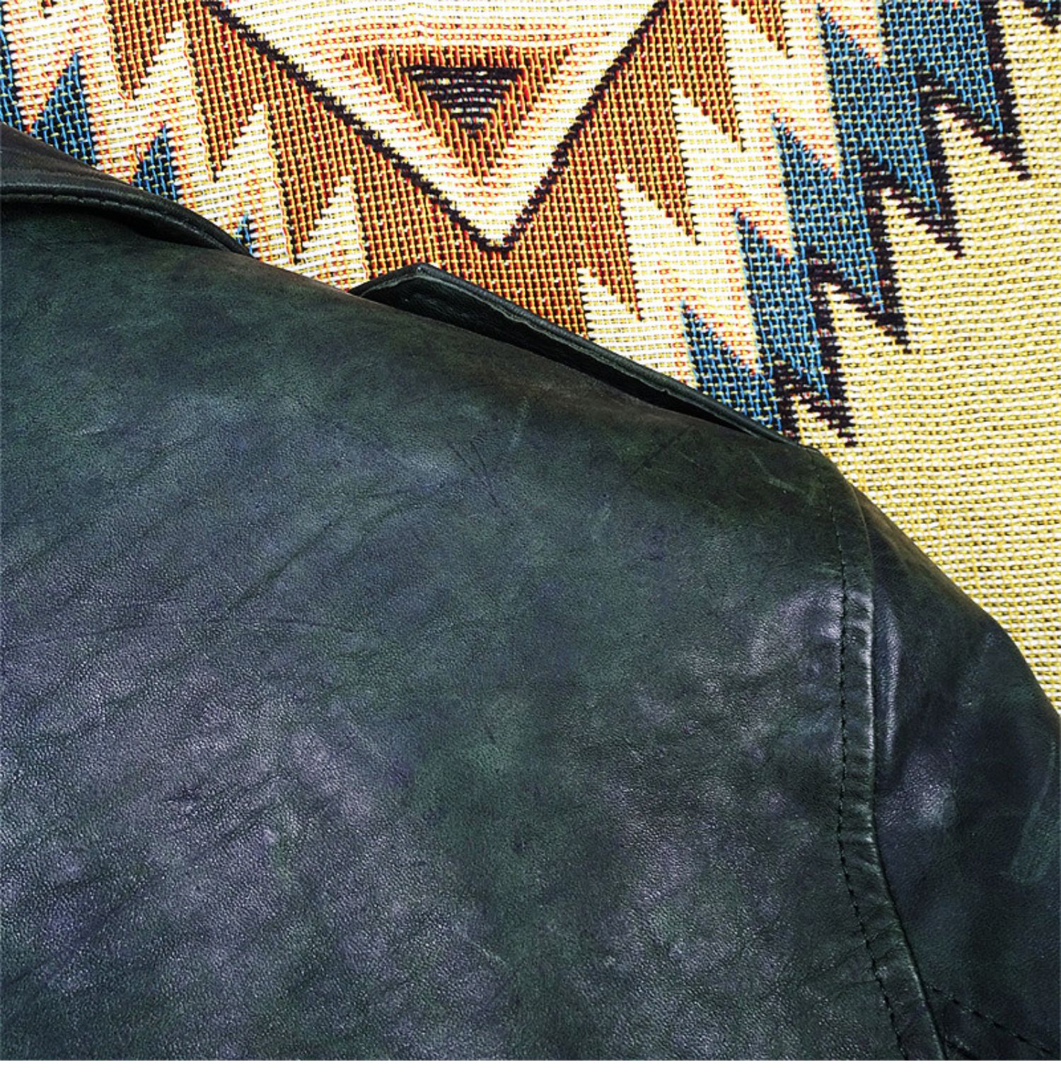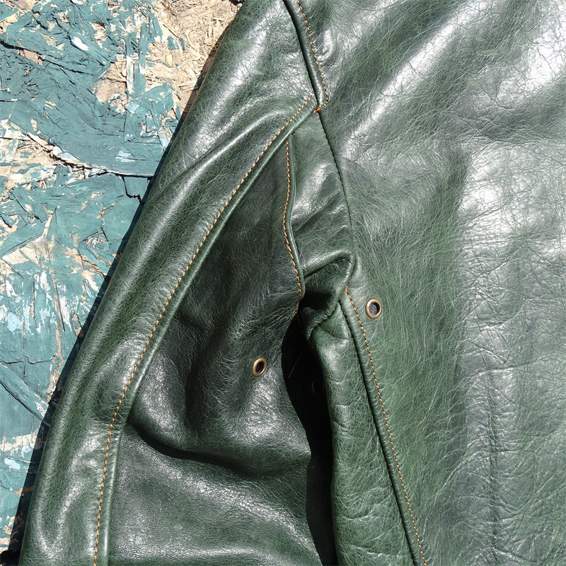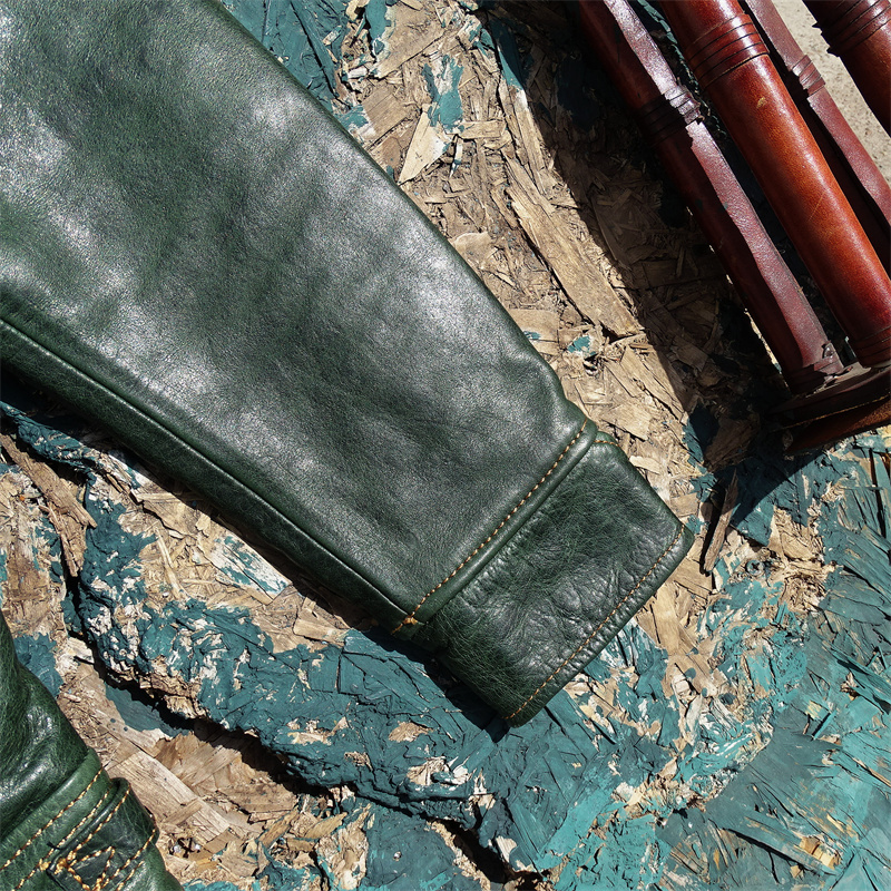 穆赫兰道原版!植鞣蜡染无涂油绿色小幼马皮真皮皮衣男翻领修身款