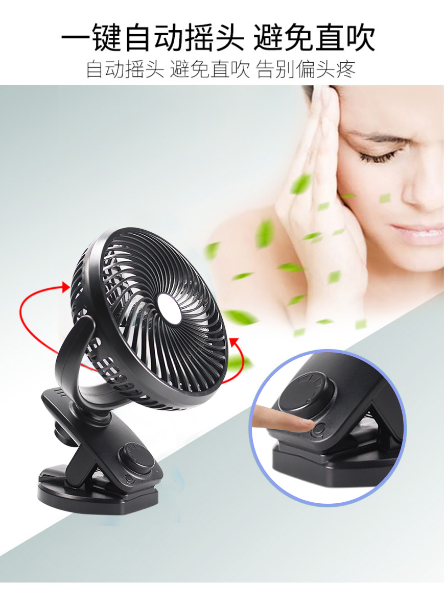 睿量自动摇头USB桌面小风扇迷你便携可充电夹式婴儿车宝宝专用静音办公室学生宿舍教室户外露营床头超长续航