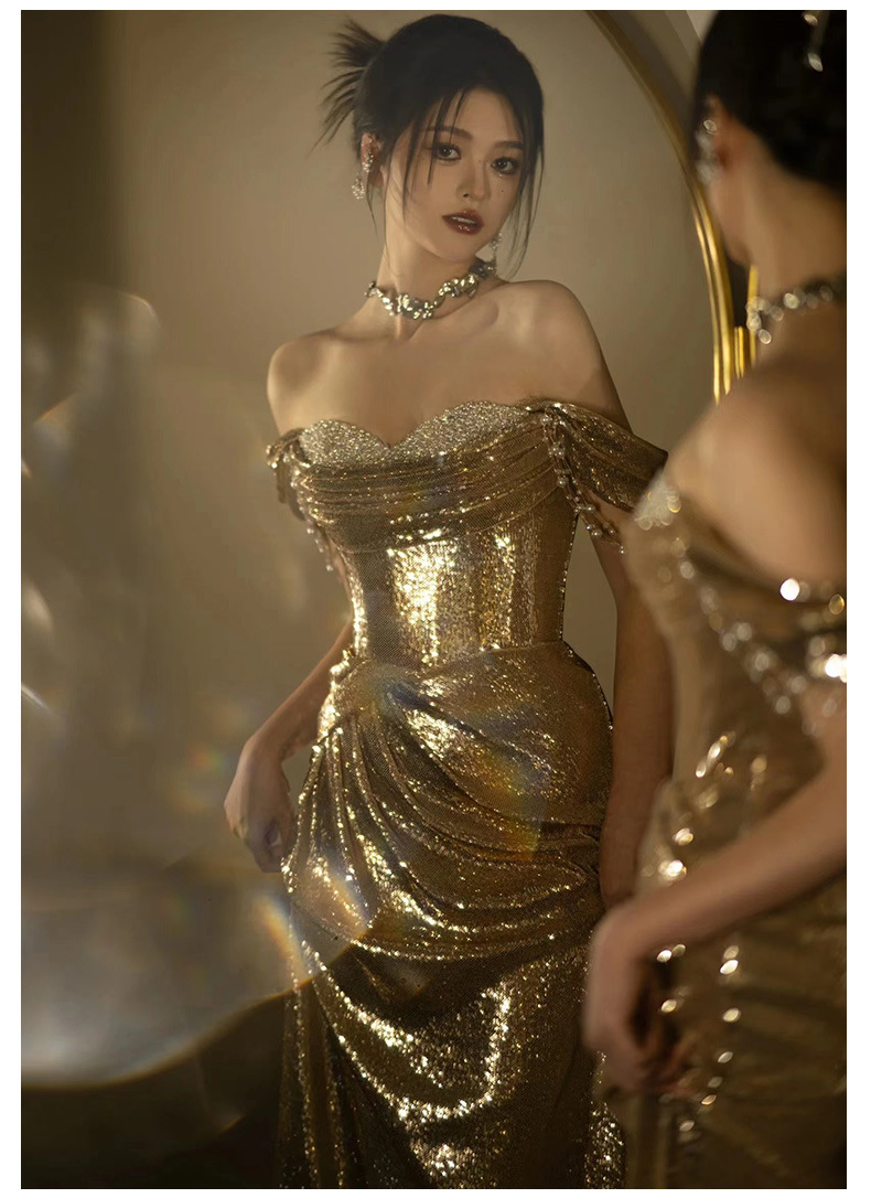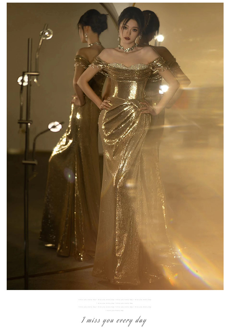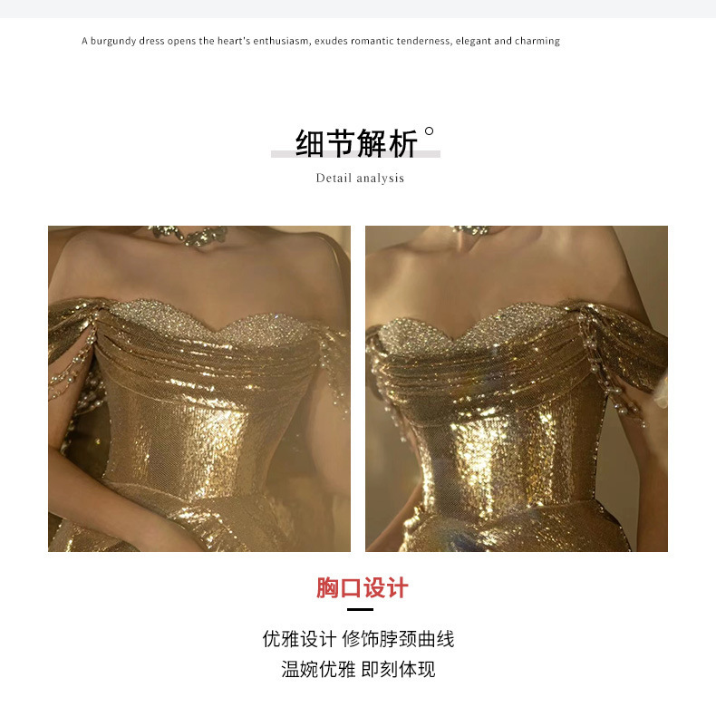 金色晚礼服女高级感亮片主持人一字肩抹胸敬酒服新娘鱼尾裙小拖尾