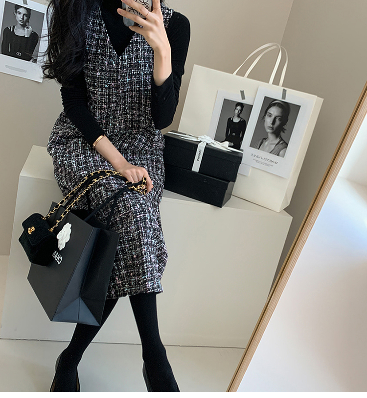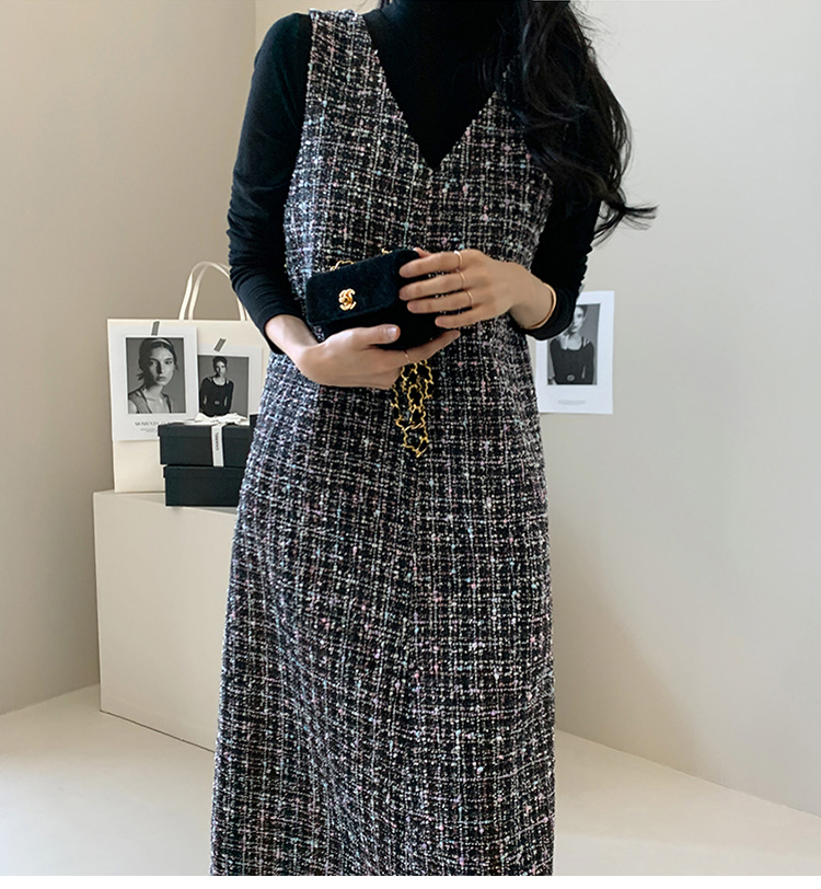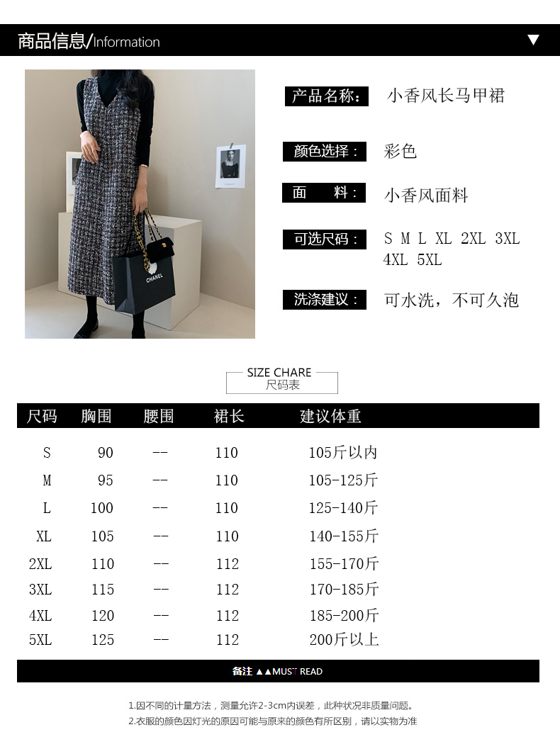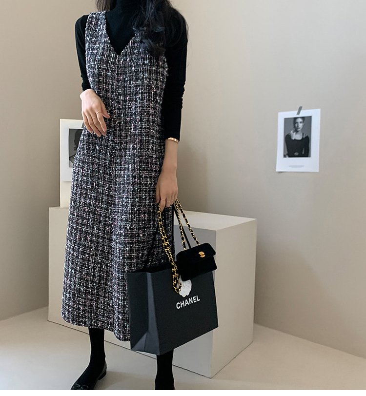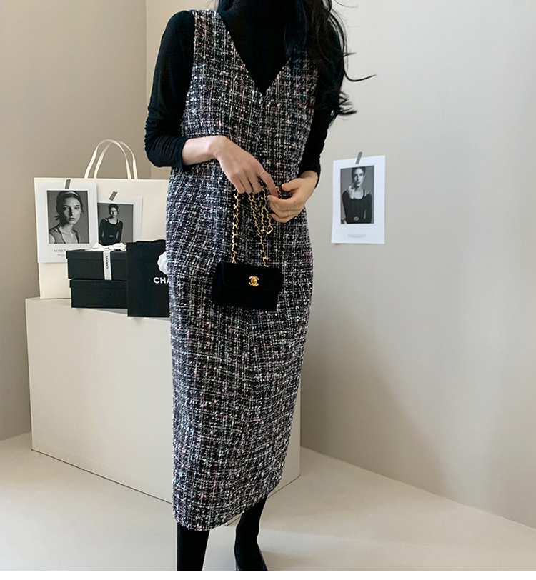 秋冬装大V领长裙小香风毛呢背心裙大码女装宽松中长款无袖连衣裙