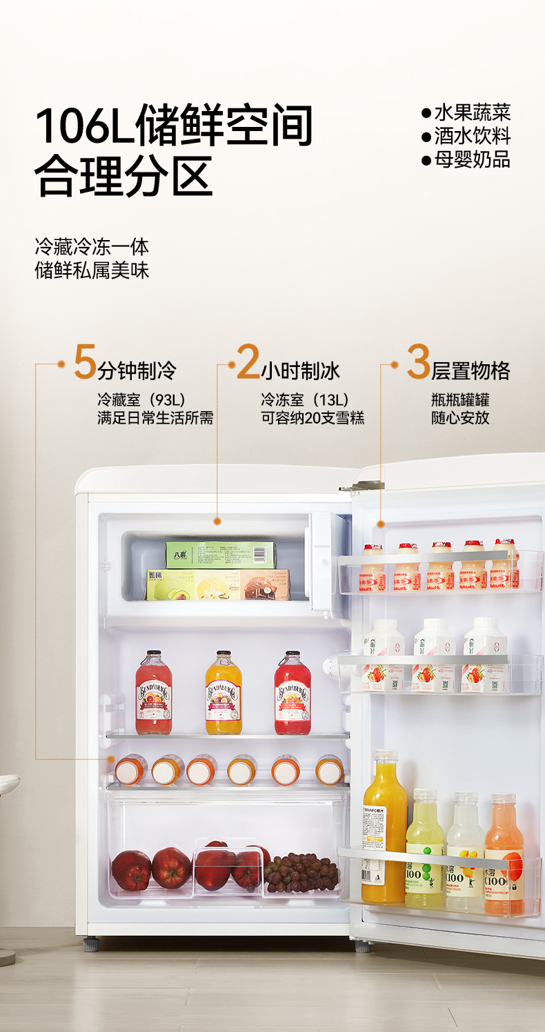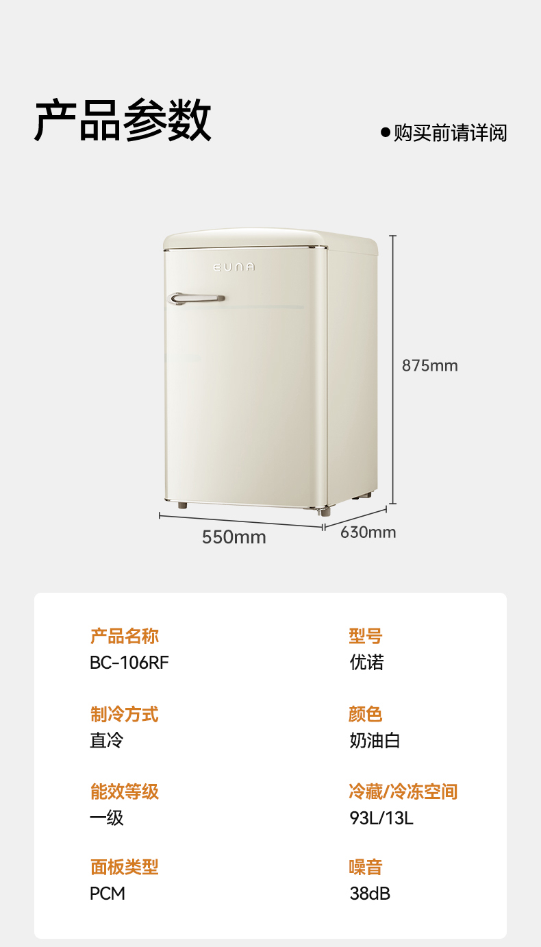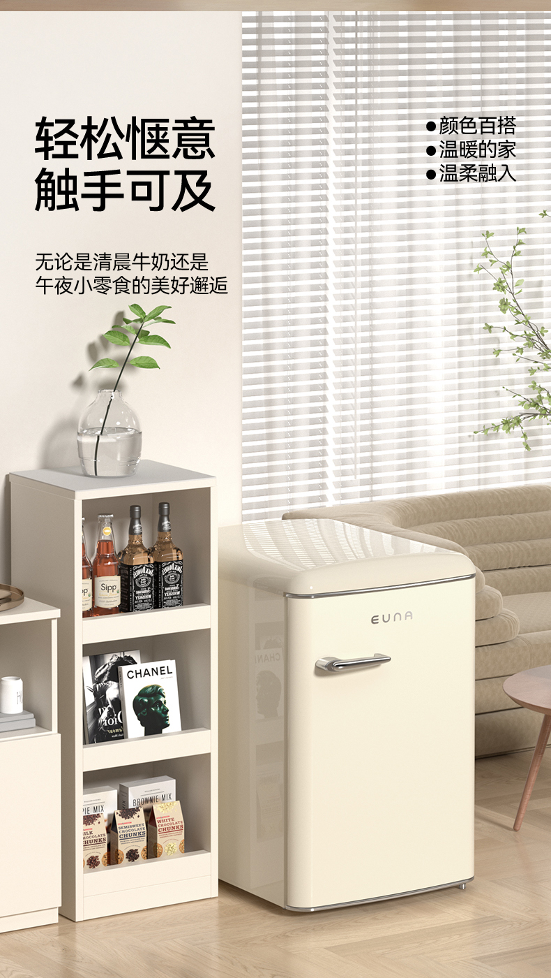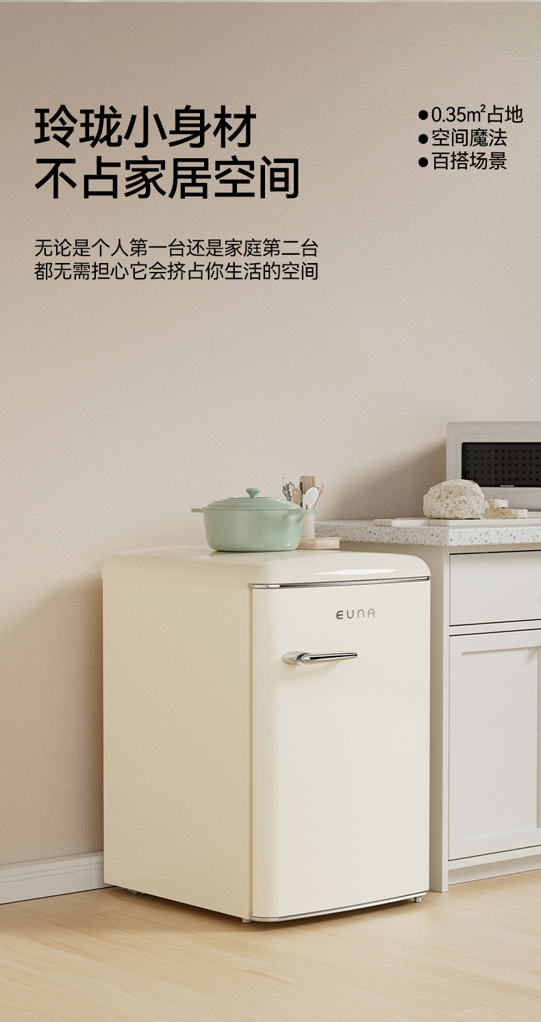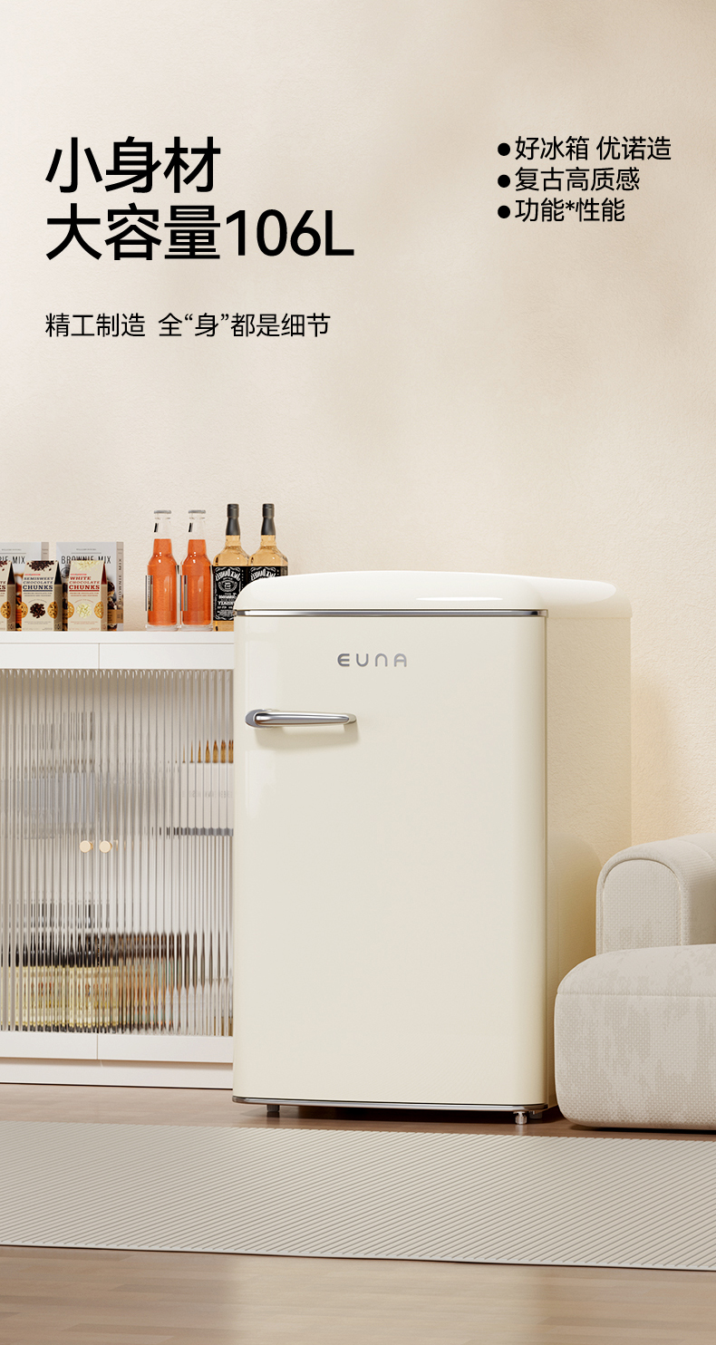 euna优诺106升迷你家用小型可爱冷藏冷冻一体高颜值复古饮料冰箱