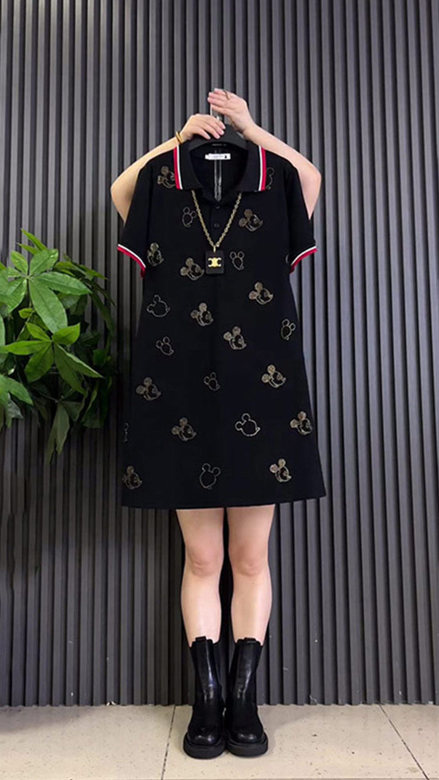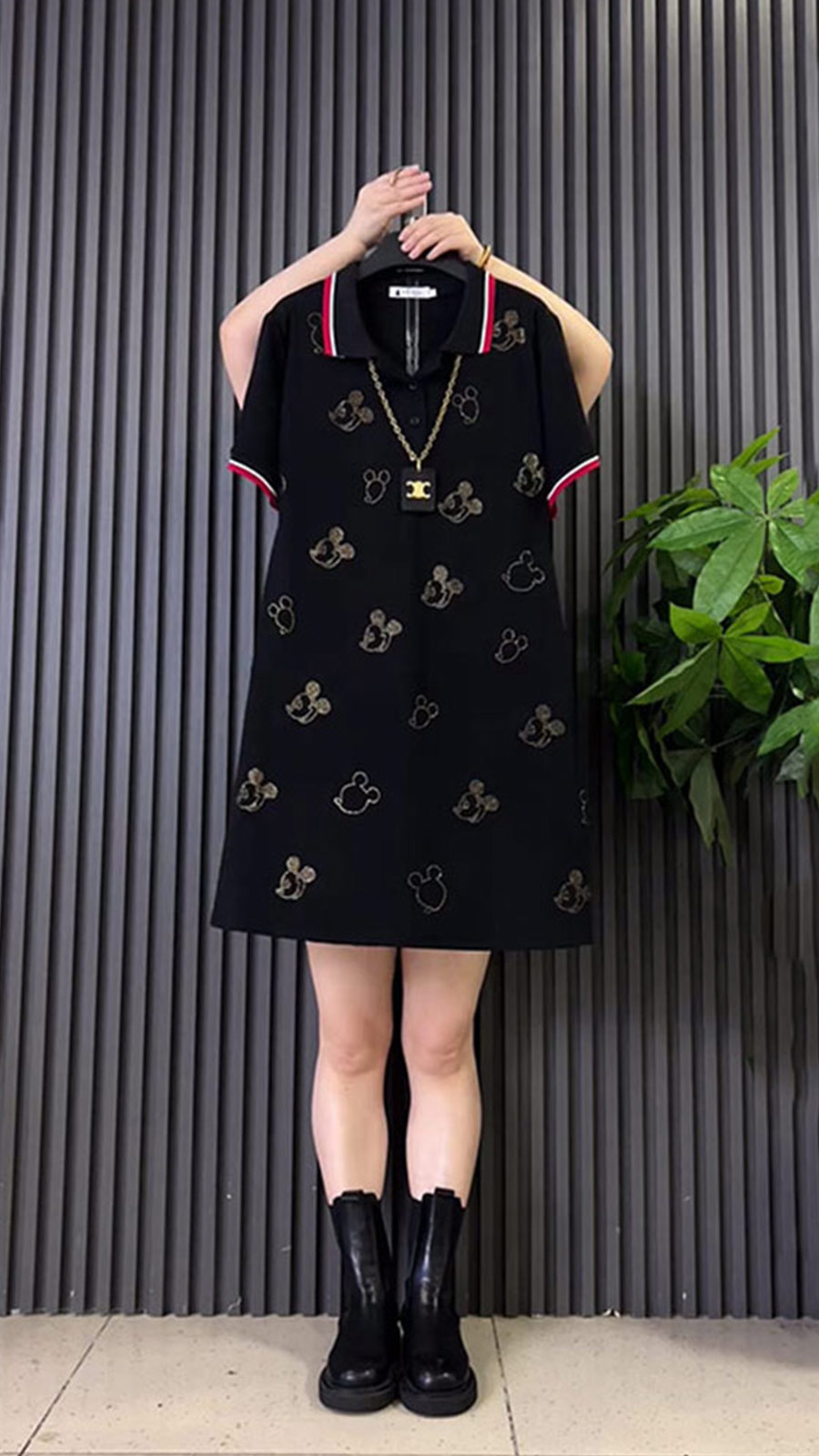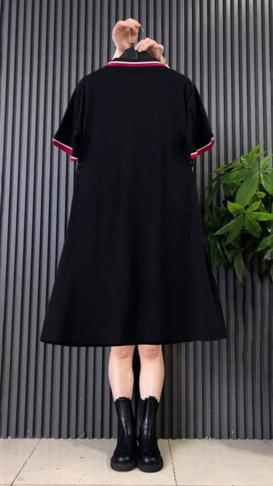 大码女装翻领拼色边卡通图案短袖休闲裙胖妹妹黑色显瘦宽松连衣裙