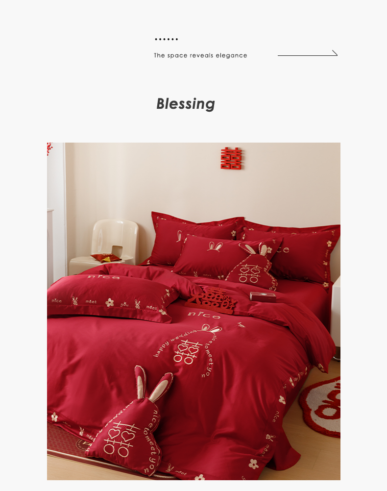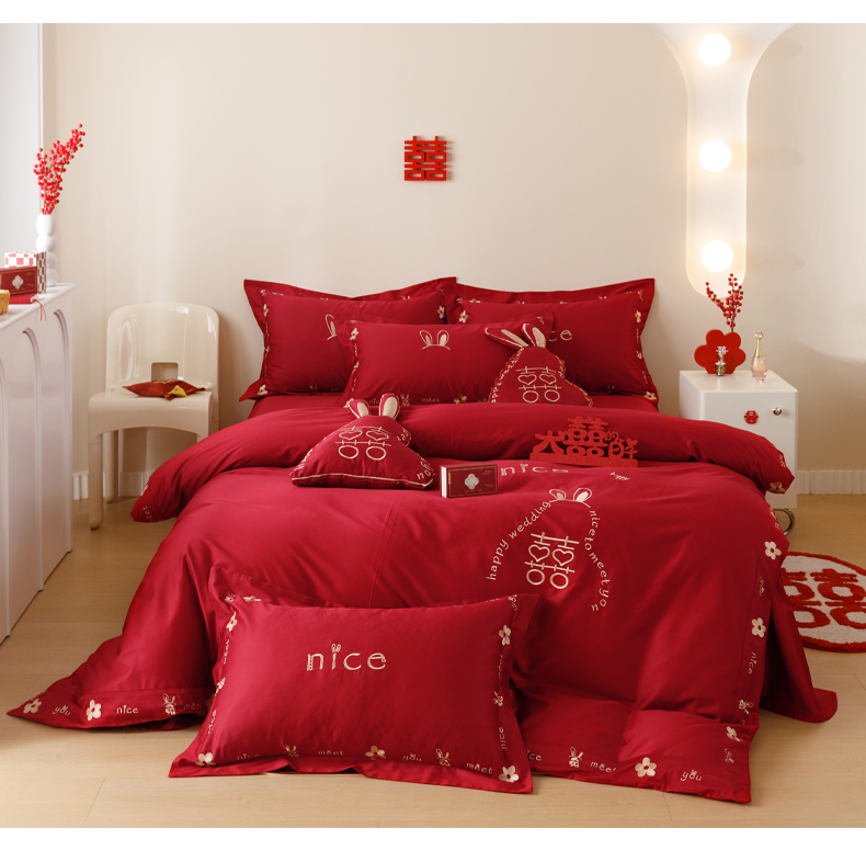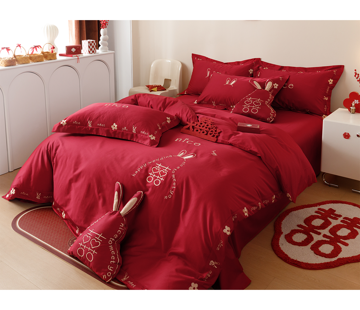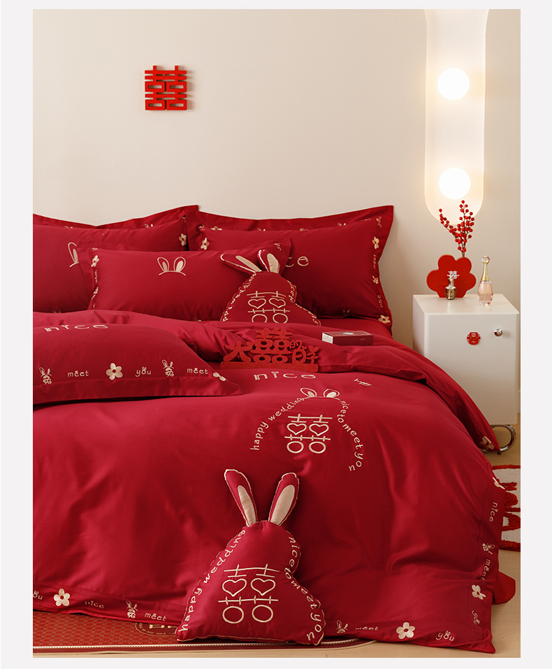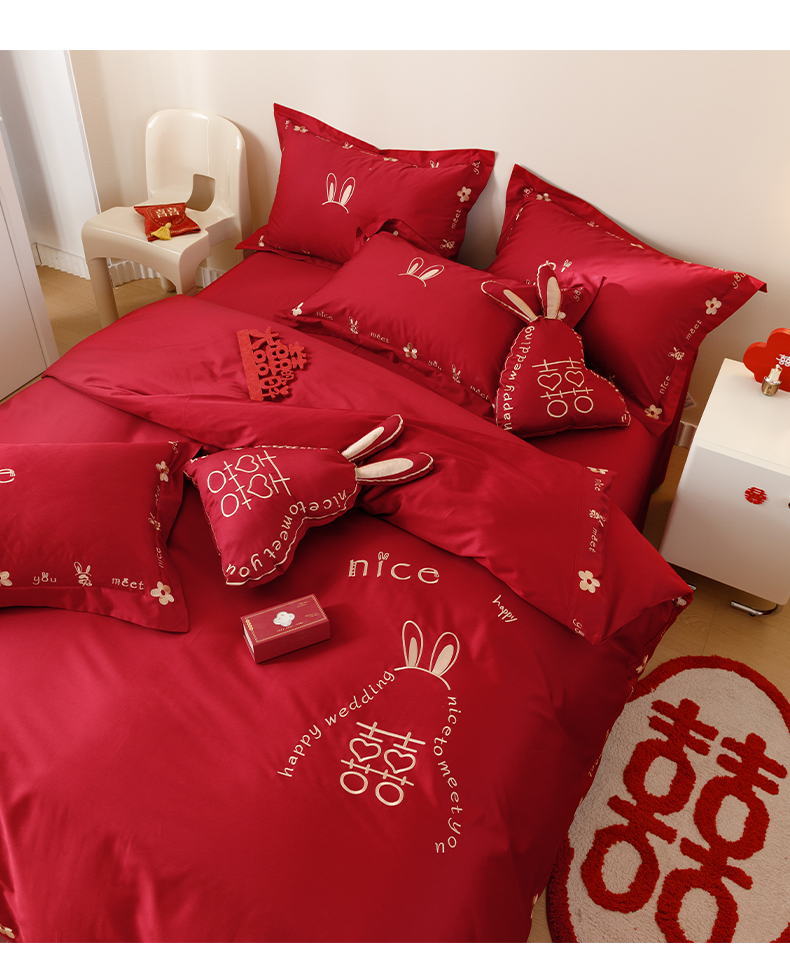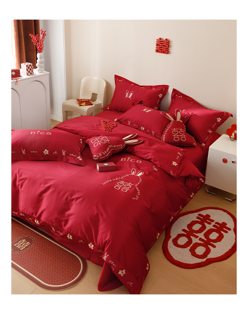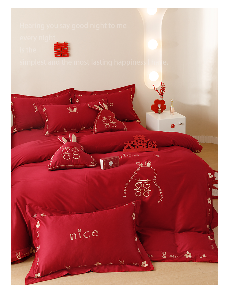 简约新婚庆床品四件套全棉100s兔子刺绣红色结婚被套双人床单床笠