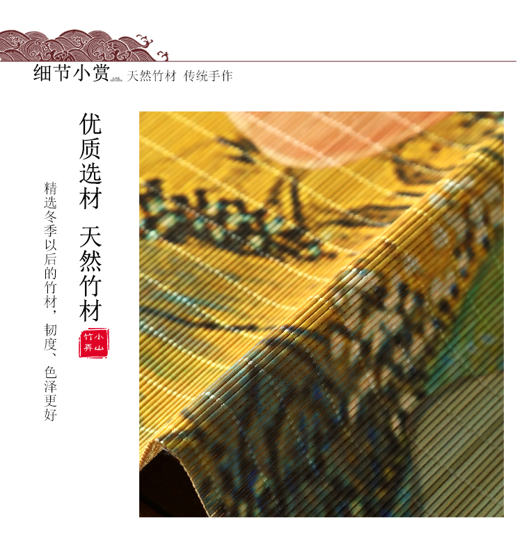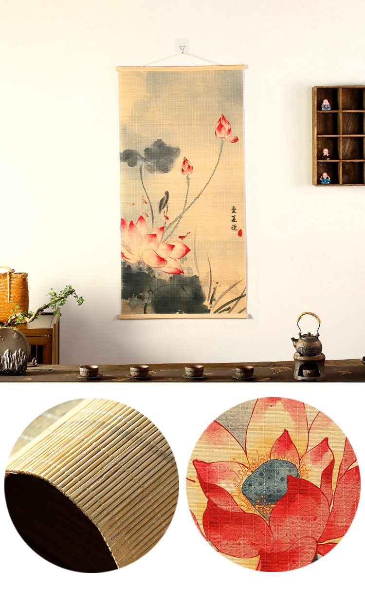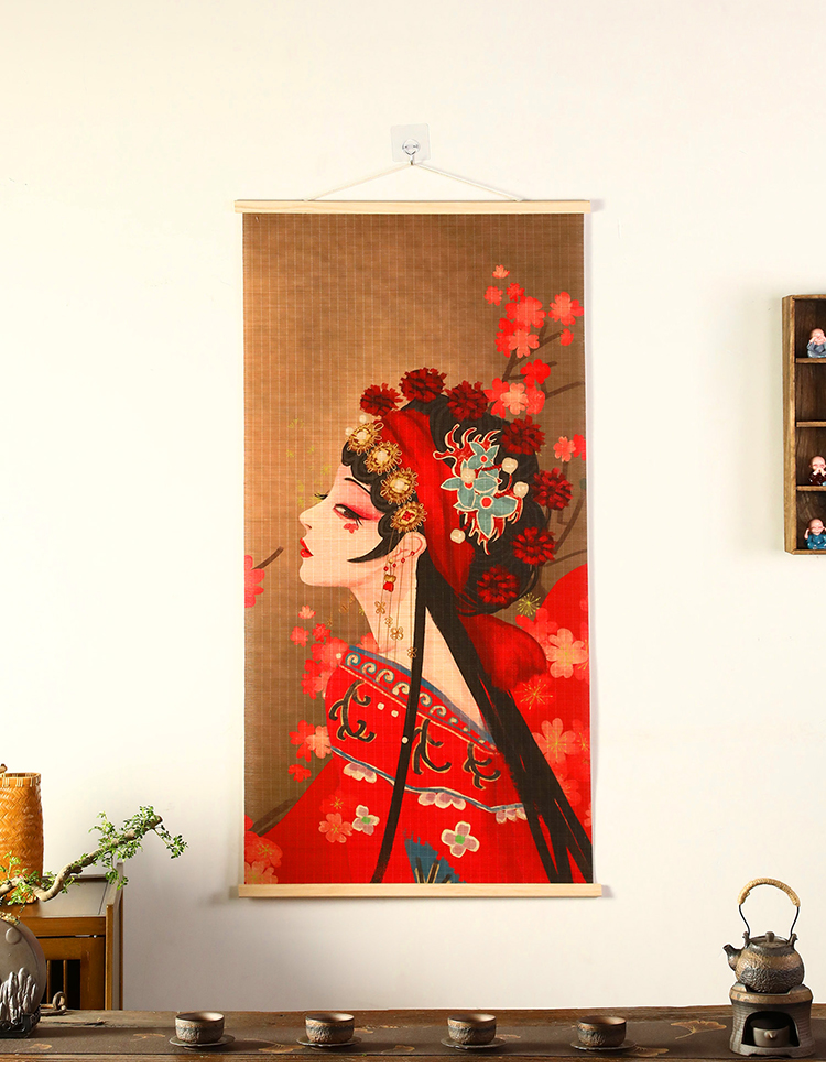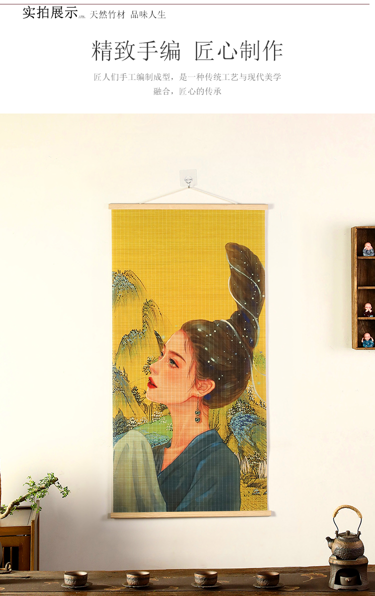 复古印花卷帘子虔诚竹帘片卷轴挂画仕女图茶室壁画背景玄关装饰画