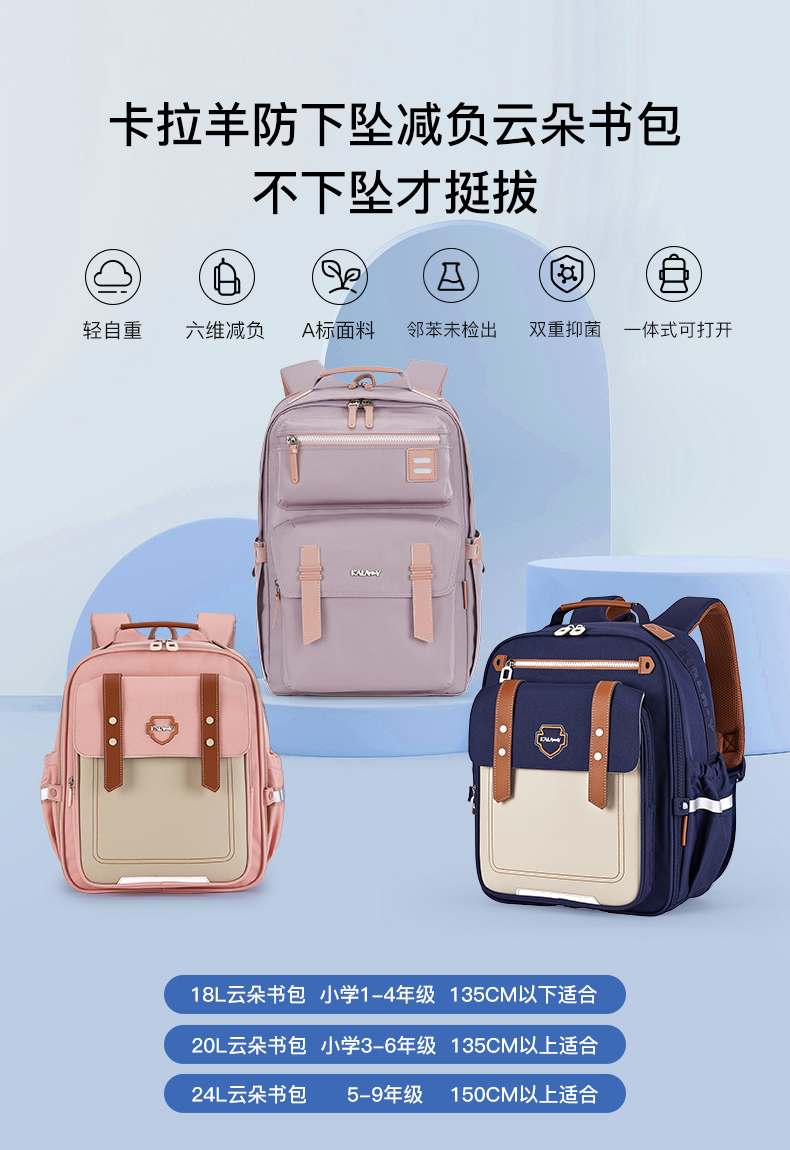 卡拉羊小学生云朵书包减负防下坠儿童背包初中大容量双肩包中学生