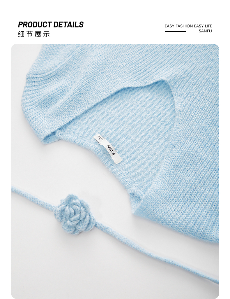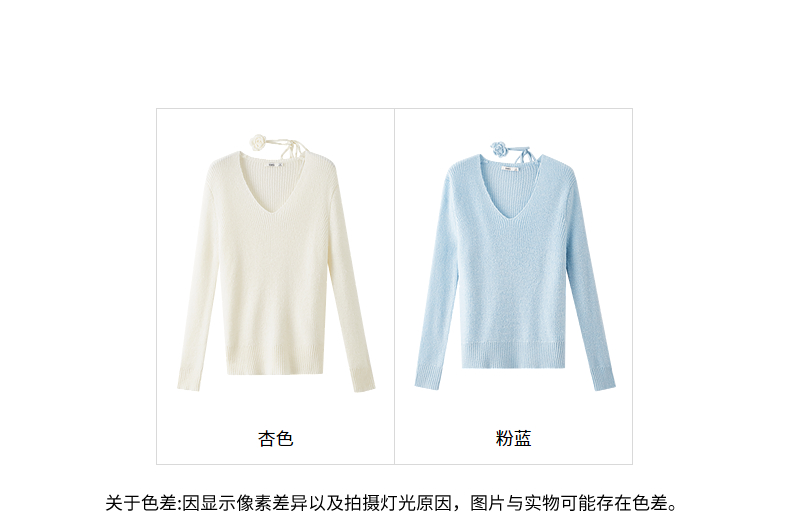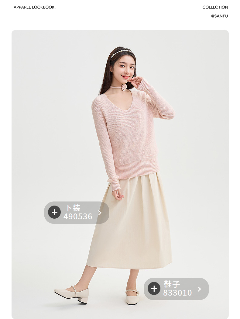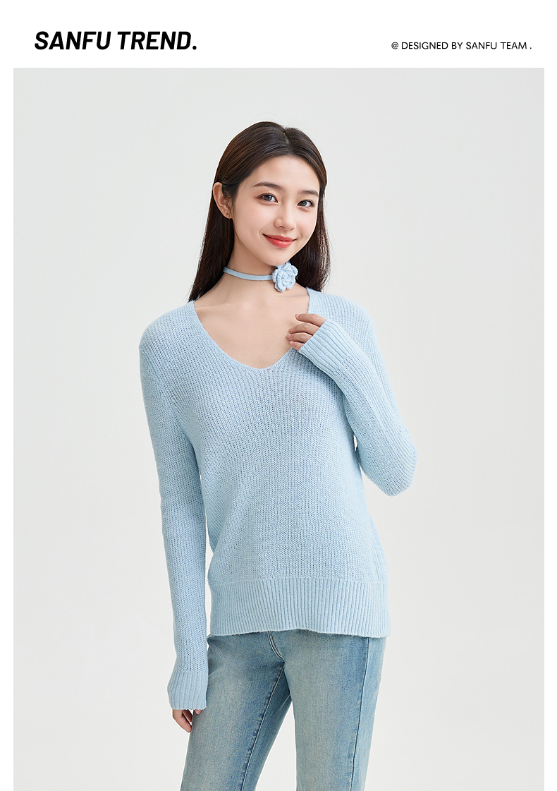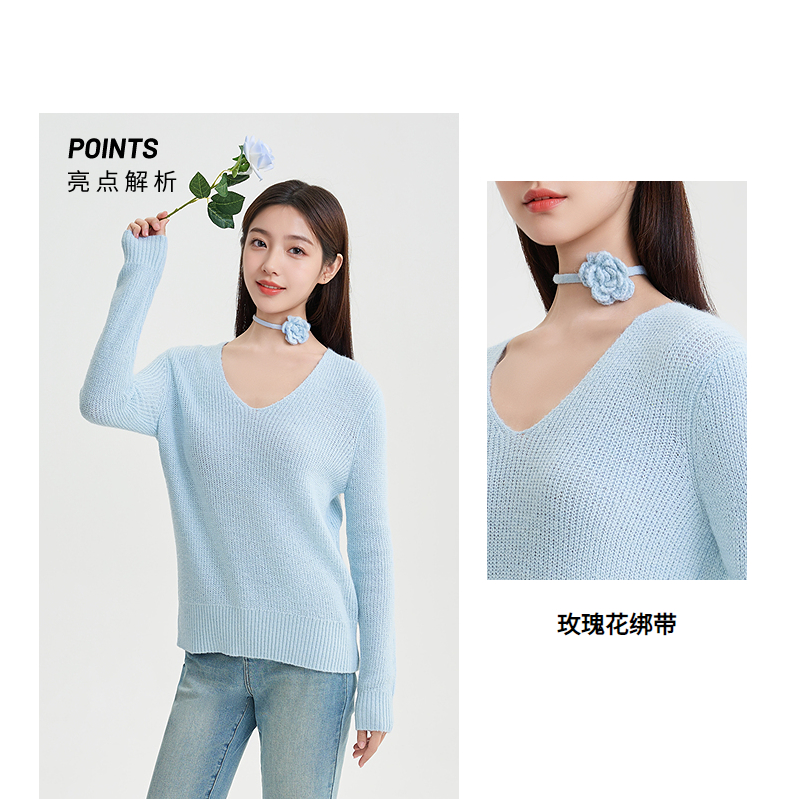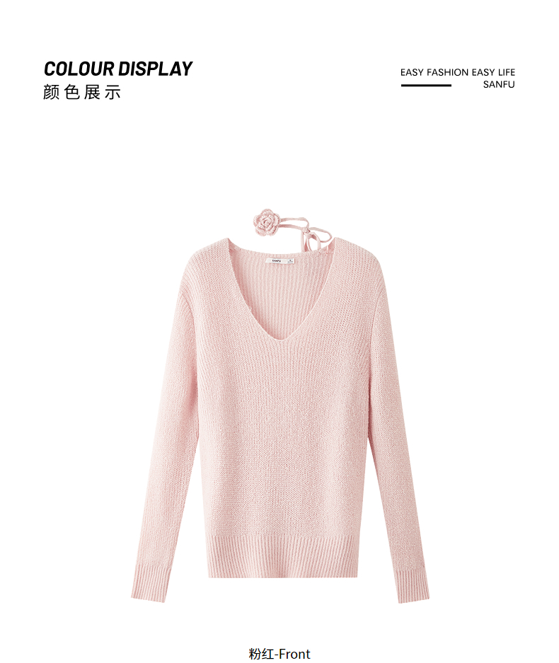 三福毛衣2025 春季玫瑰花绑带V领宽松时尚上衣女装490513