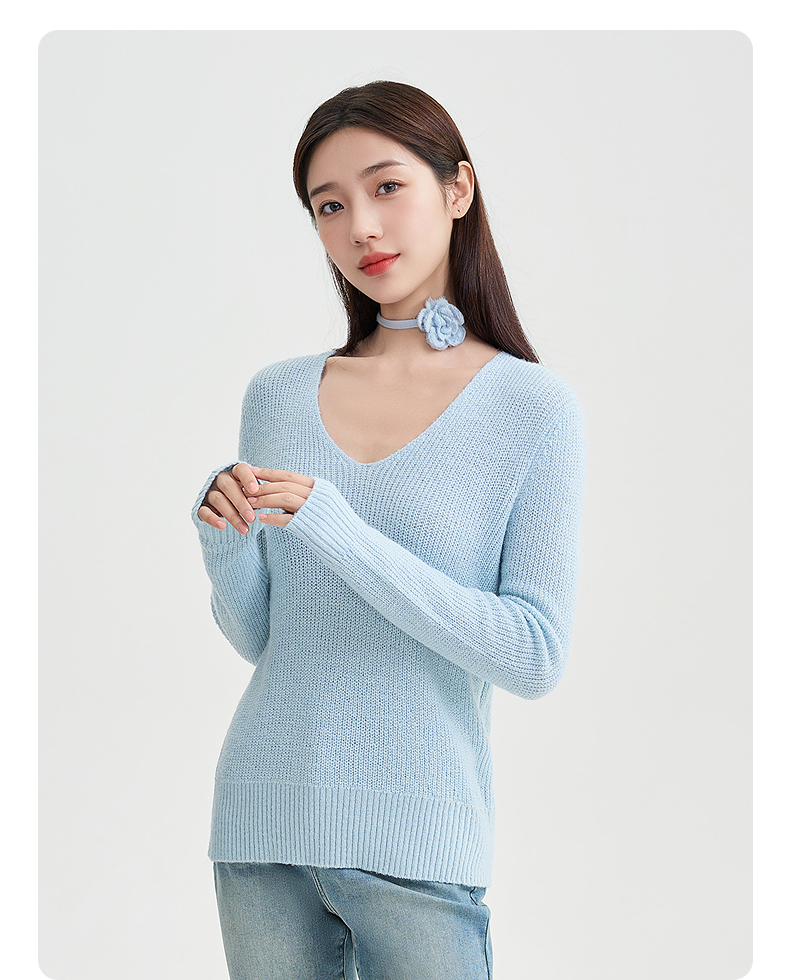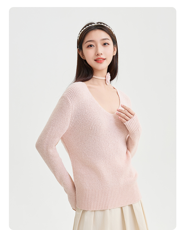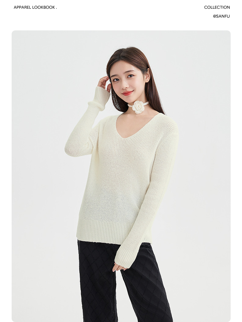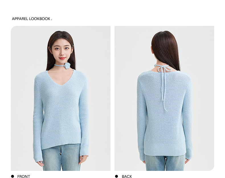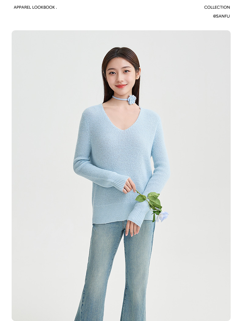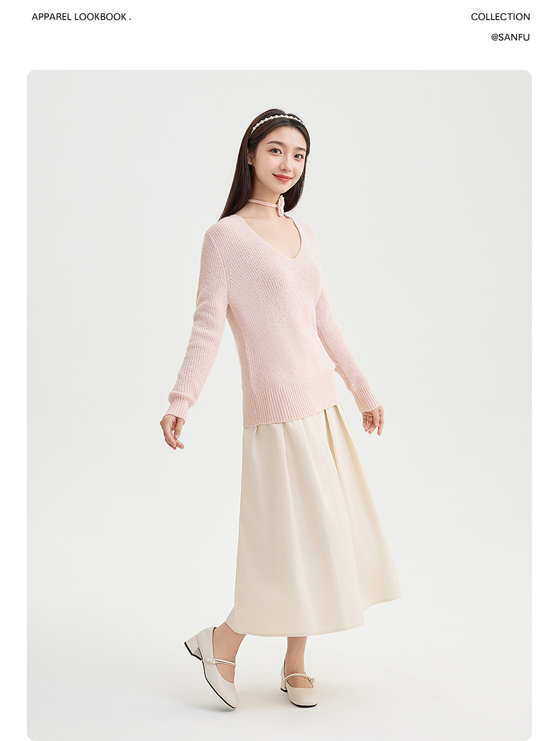 三福毛衣2025 春季玫瑰花绑带V领宽松时尚上衣女装490513