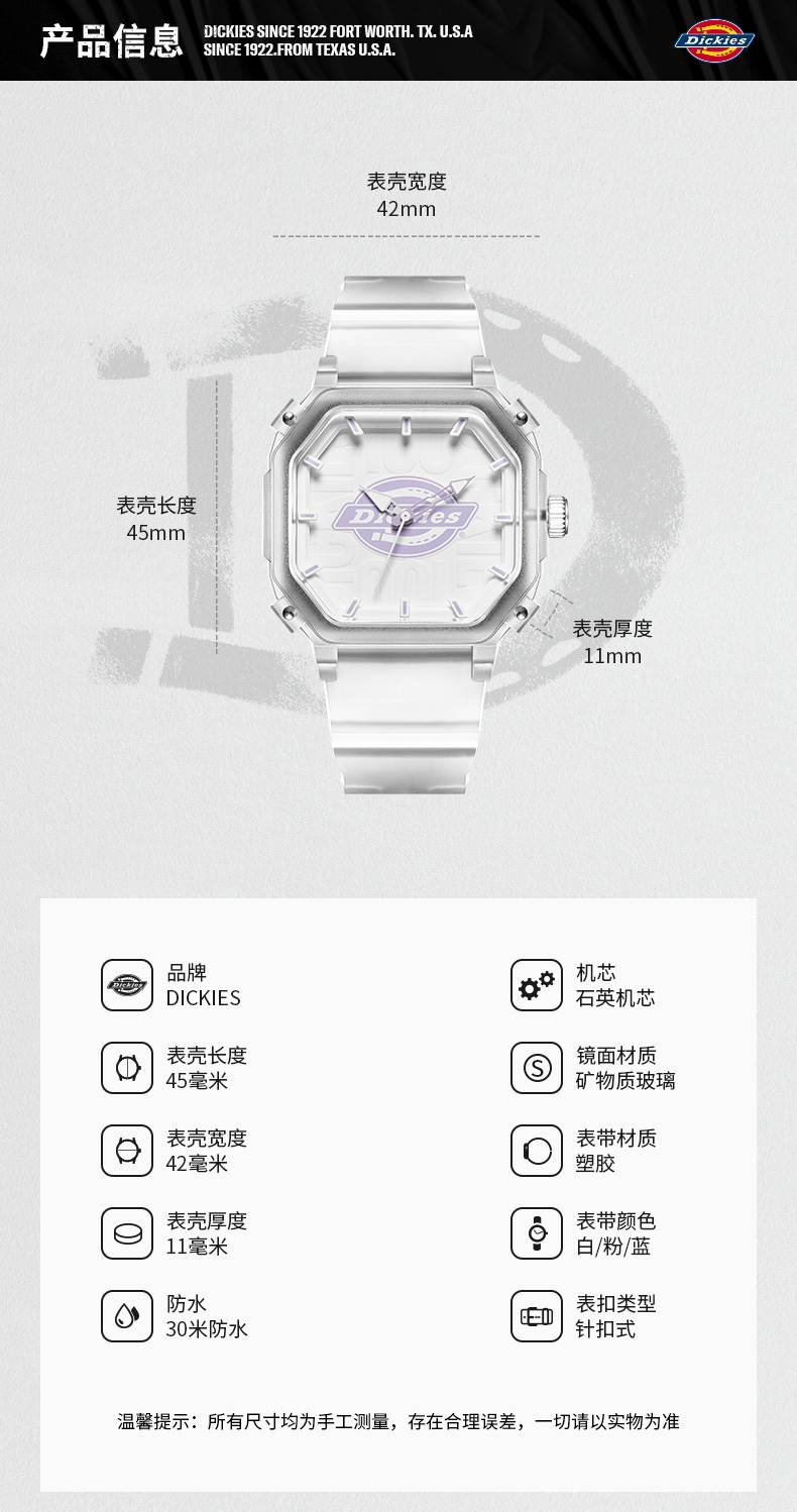 Dickies手表小冰块月白星紫男女款潮流学生初高中礼物100年限量版