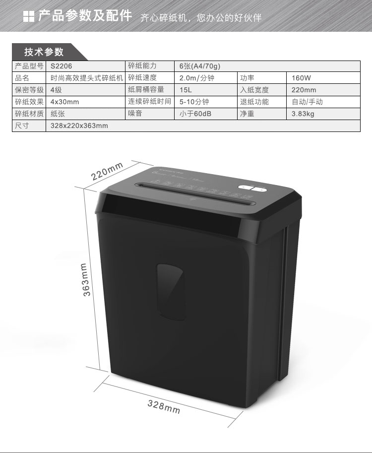 齐心S2206碎纸机办公室迷你家用颗粒电动小型大功率纸张文件粉碎机商用便携废纸廉碎机17L容量保密碎纸