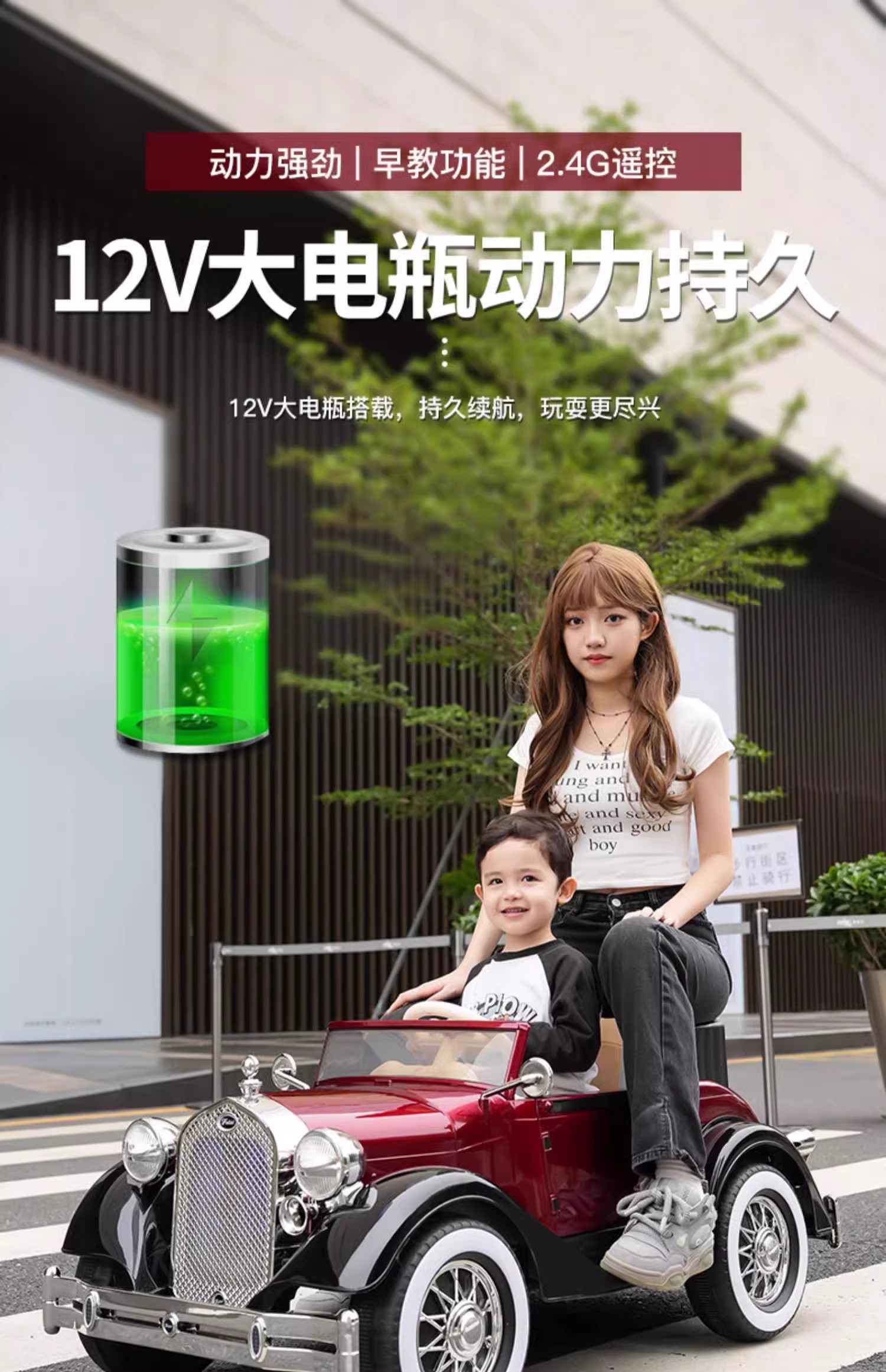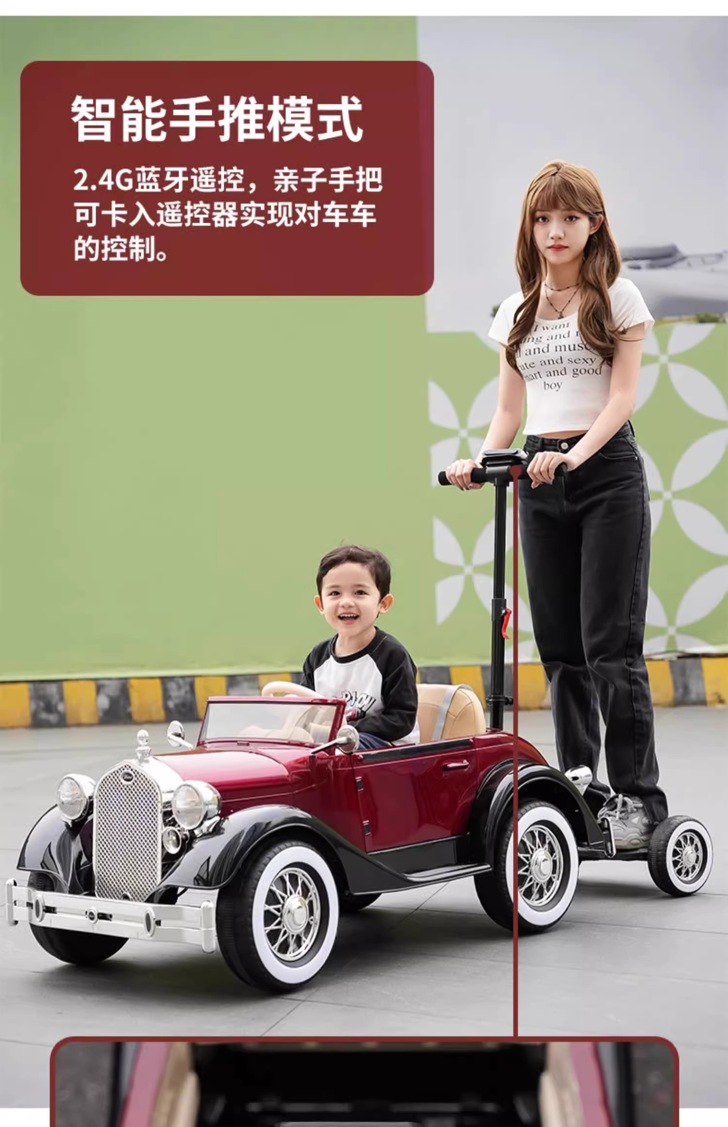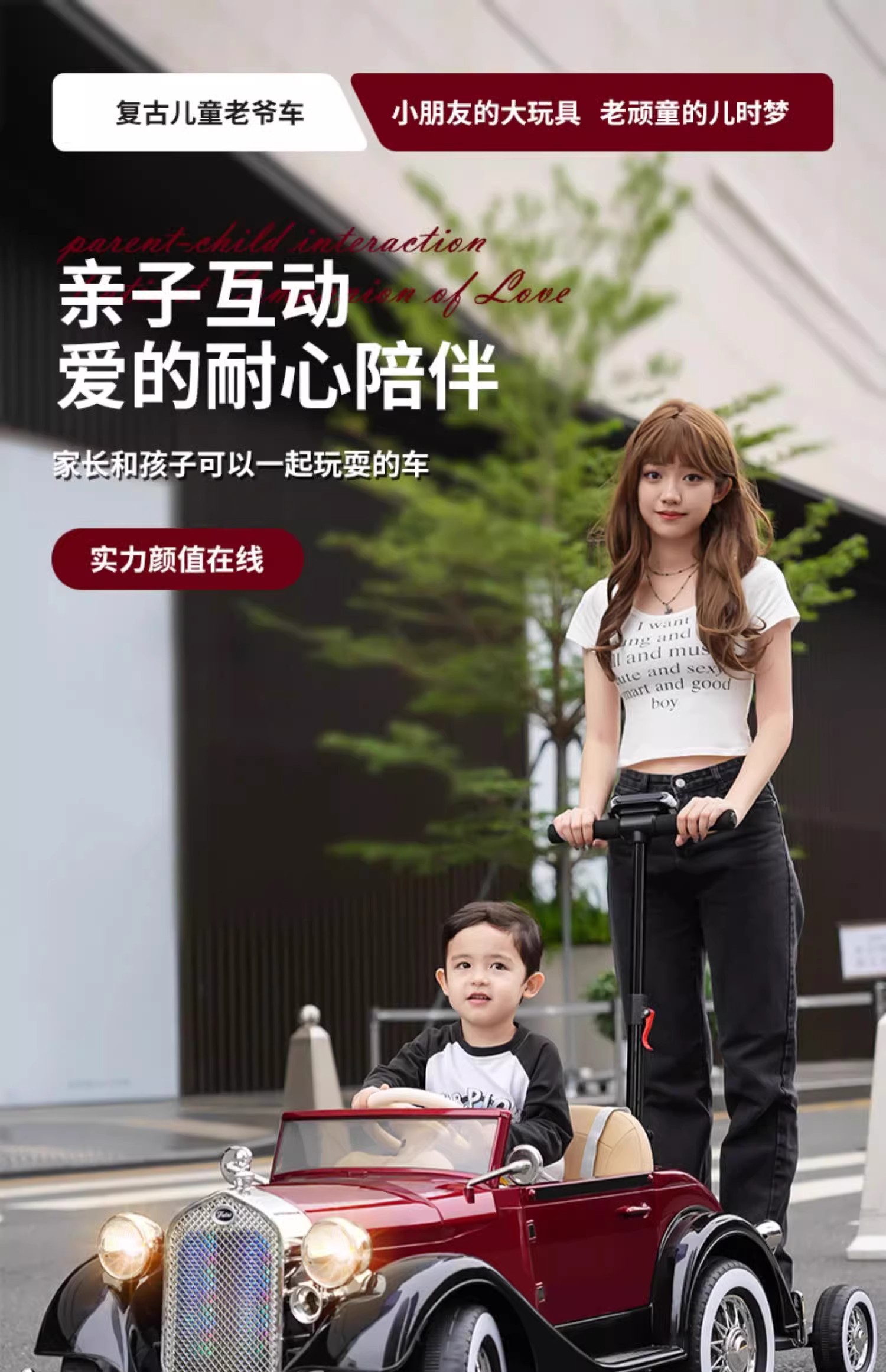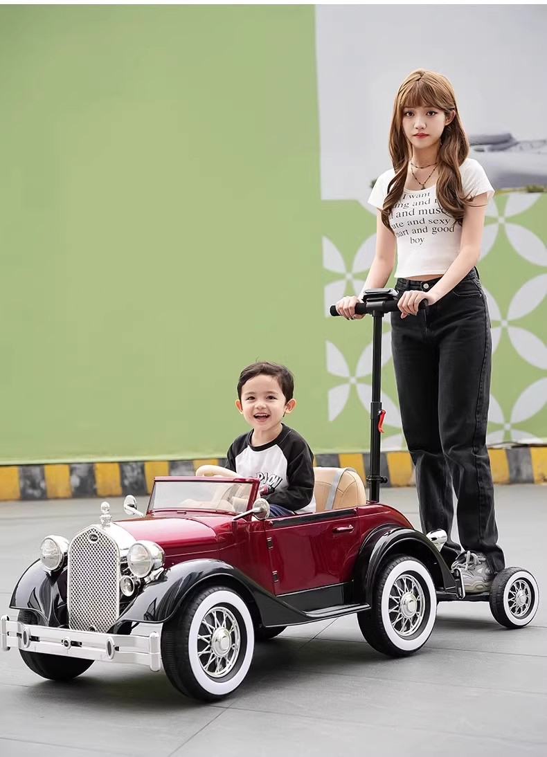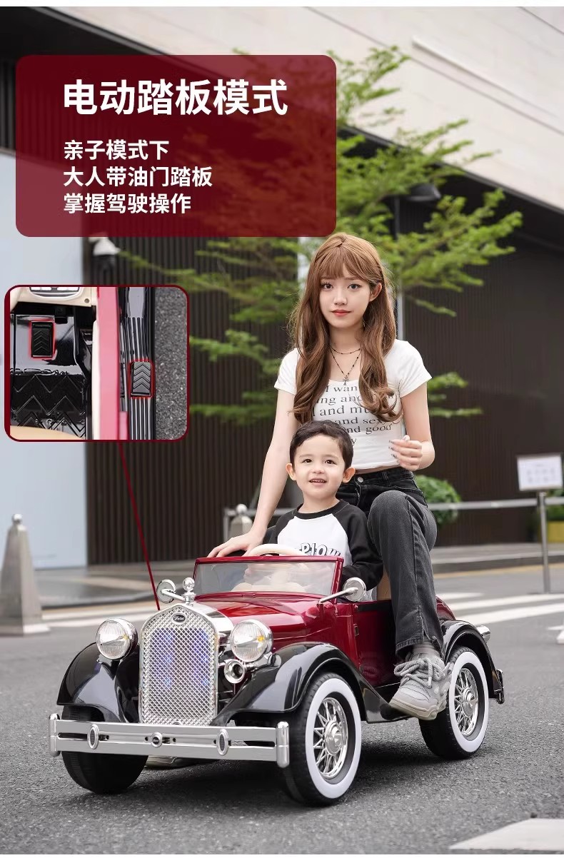 复古老爷车儿童电动车亲子四轮四驱汽车带成人拖车可遥控早教玩具