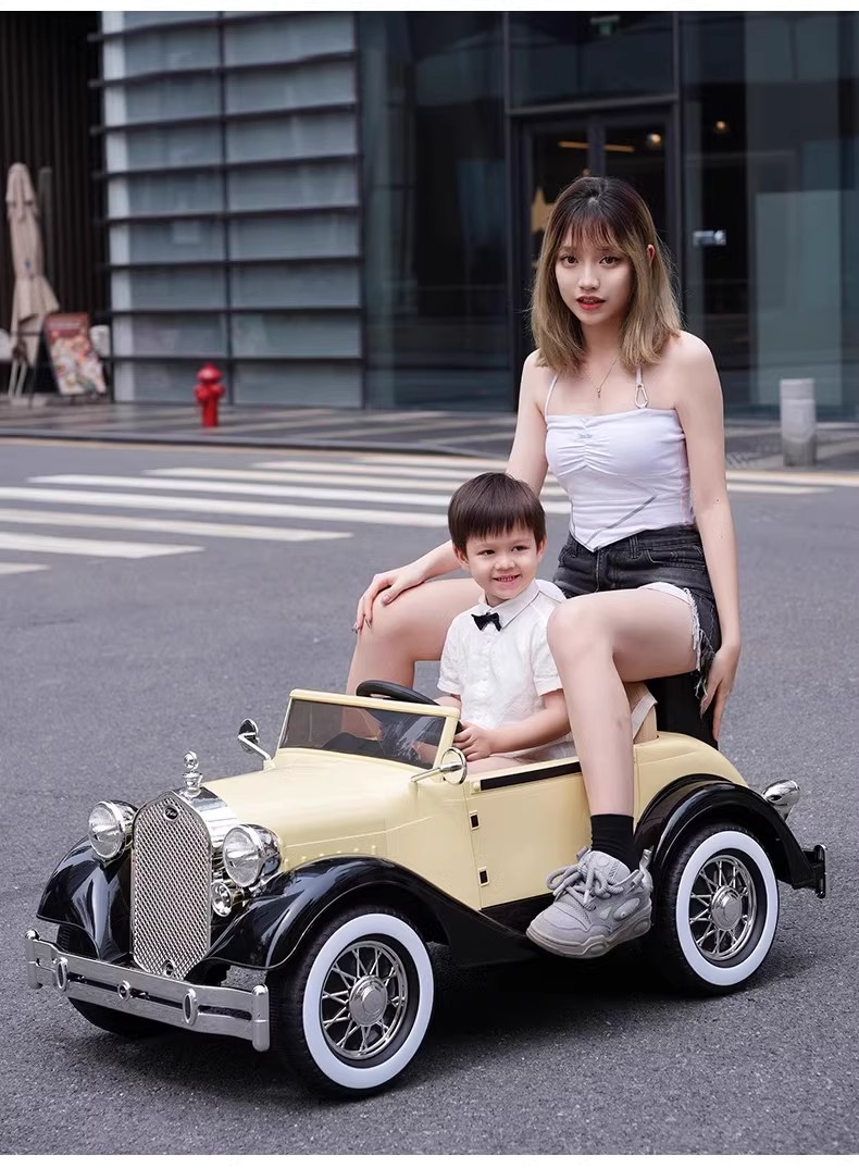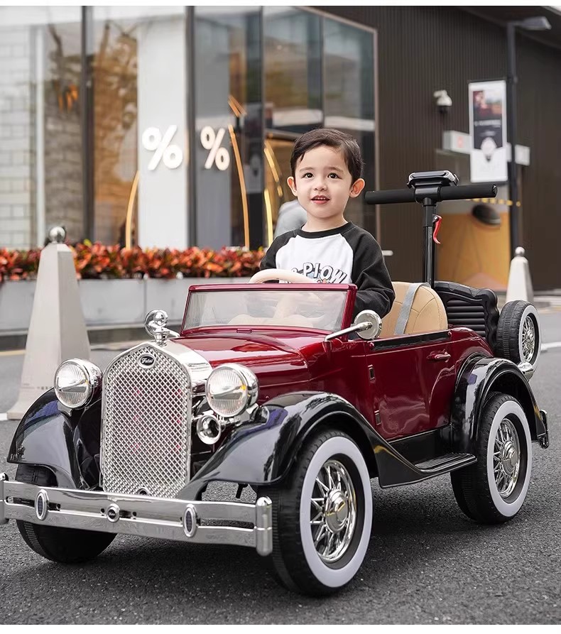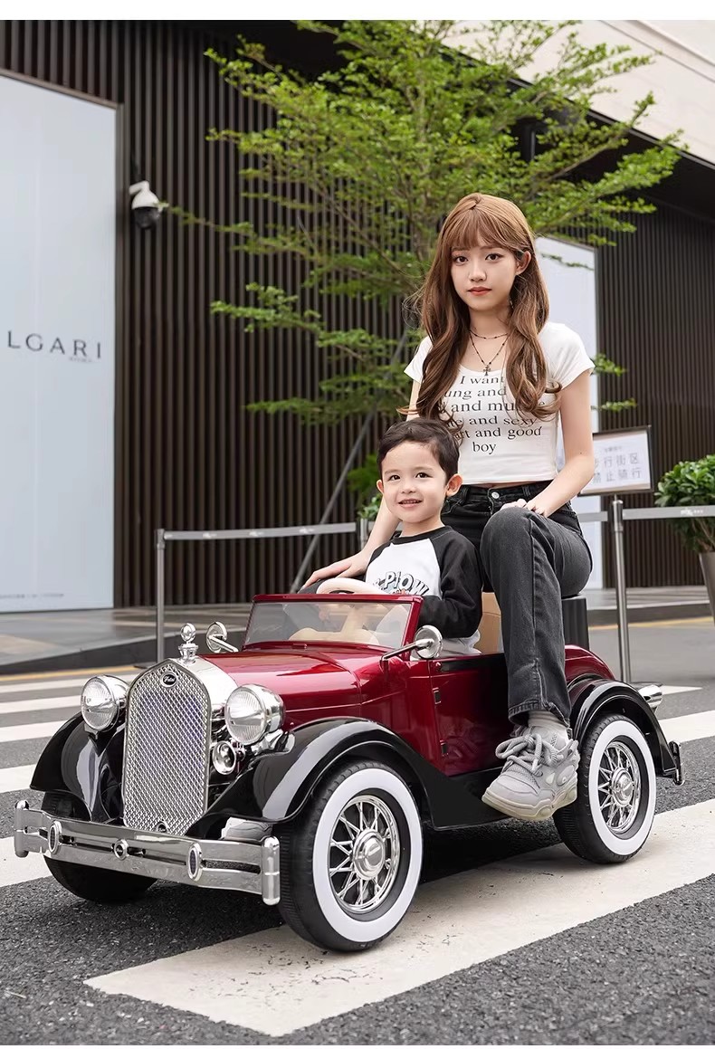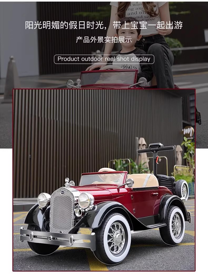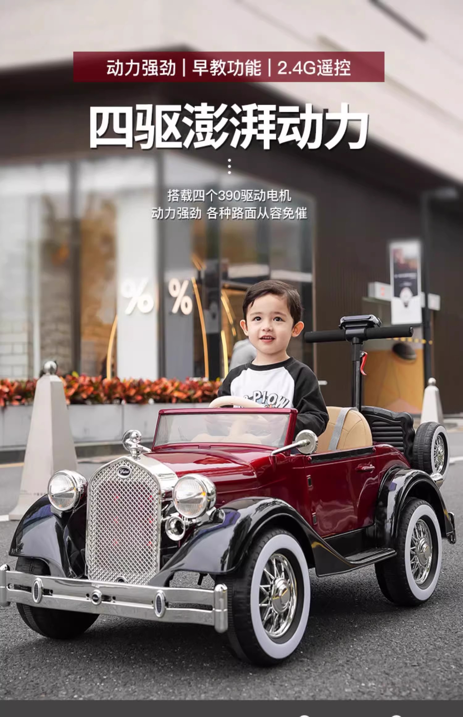 复古老爷车儿童电动车亲子四轮四驱汽车带成人拖车可遥控早教玩具