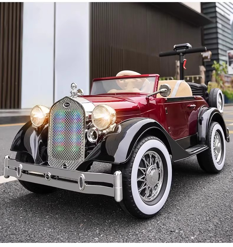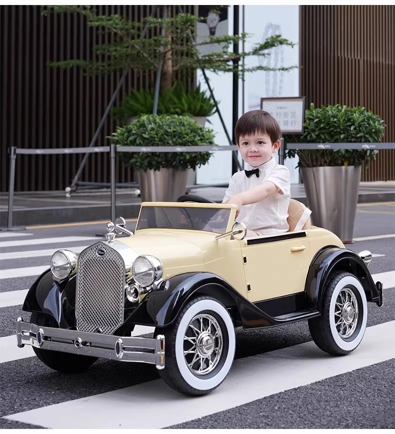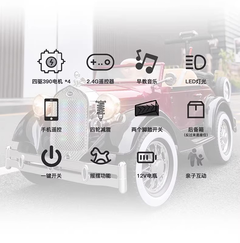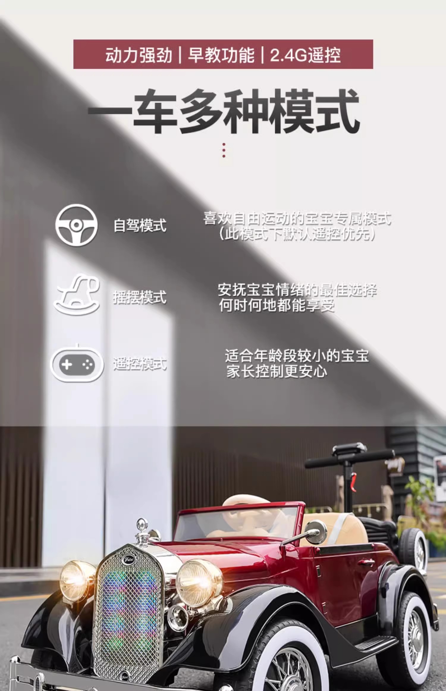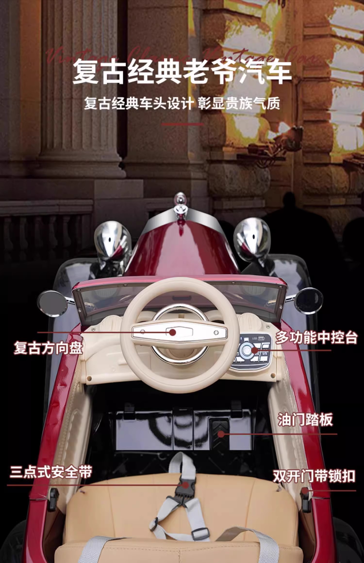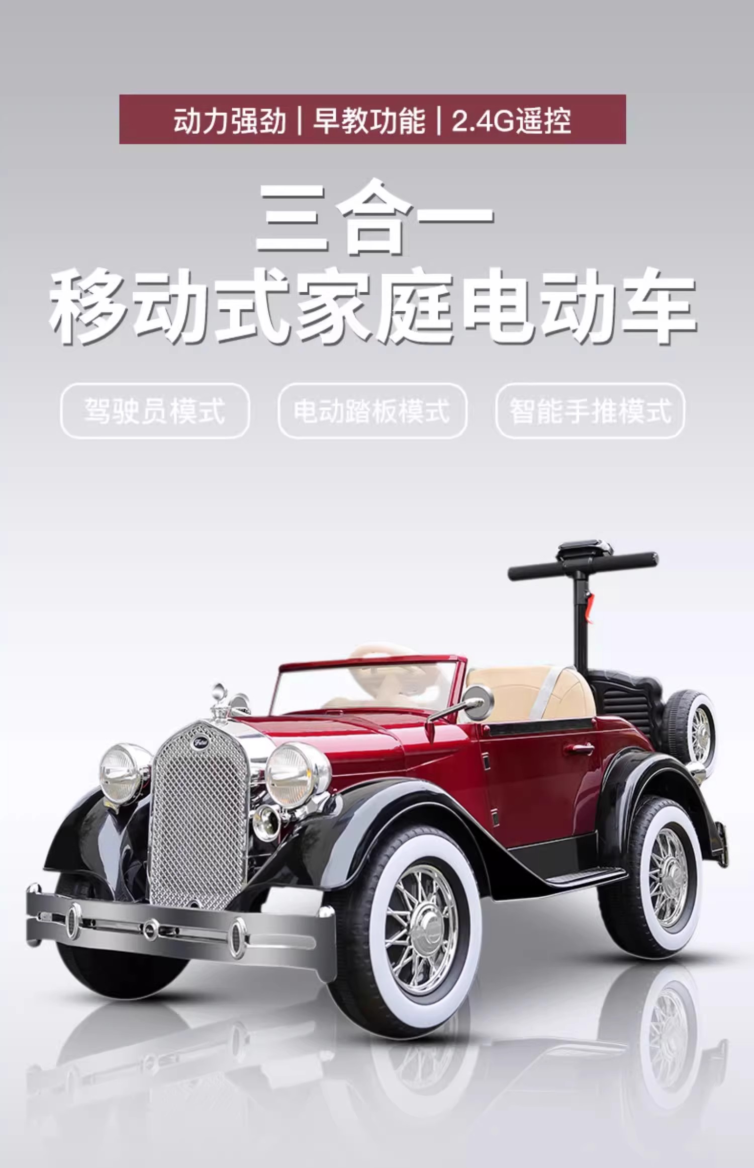 复古老爷车儿童电动车亲子四轮四驱汽车带成人拖车可遥控早教玩具