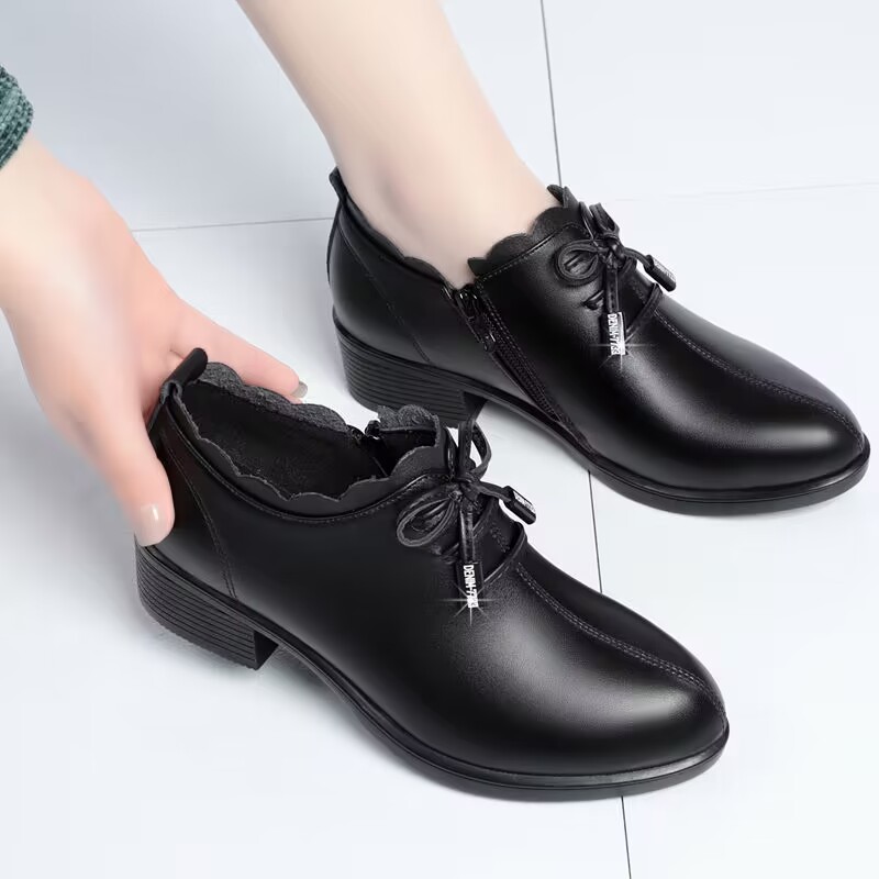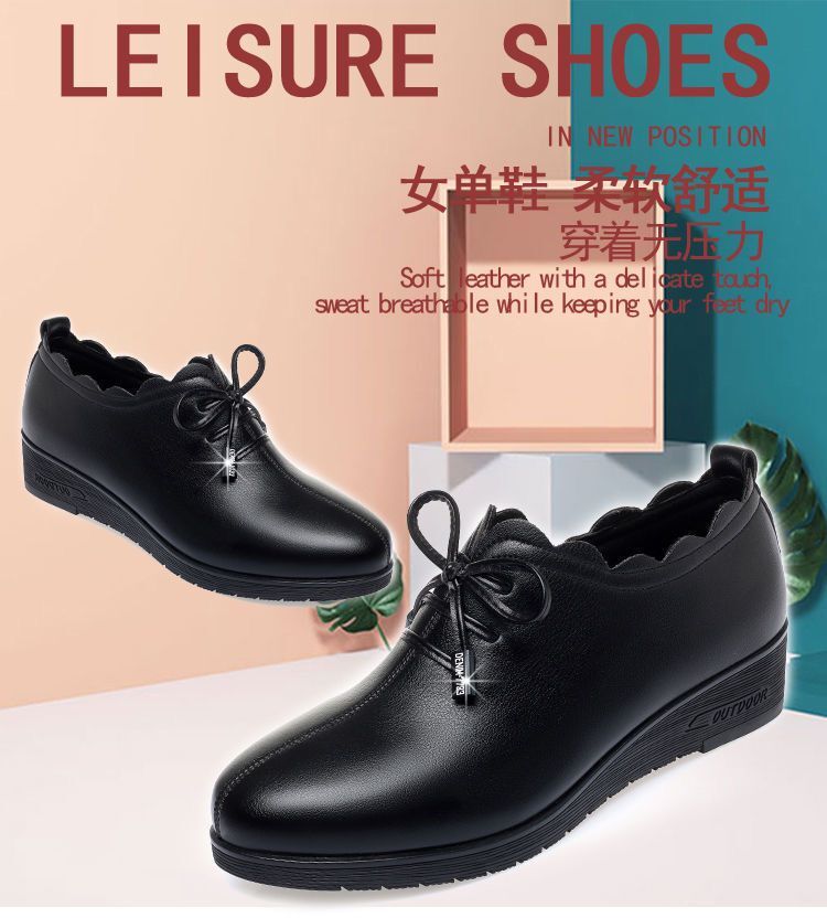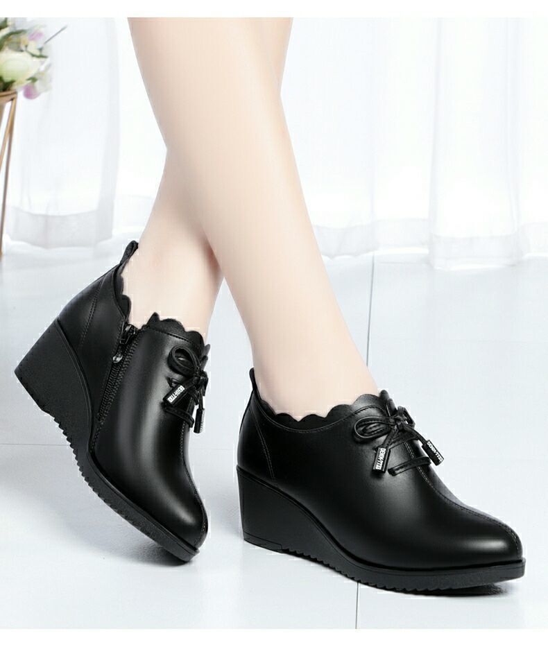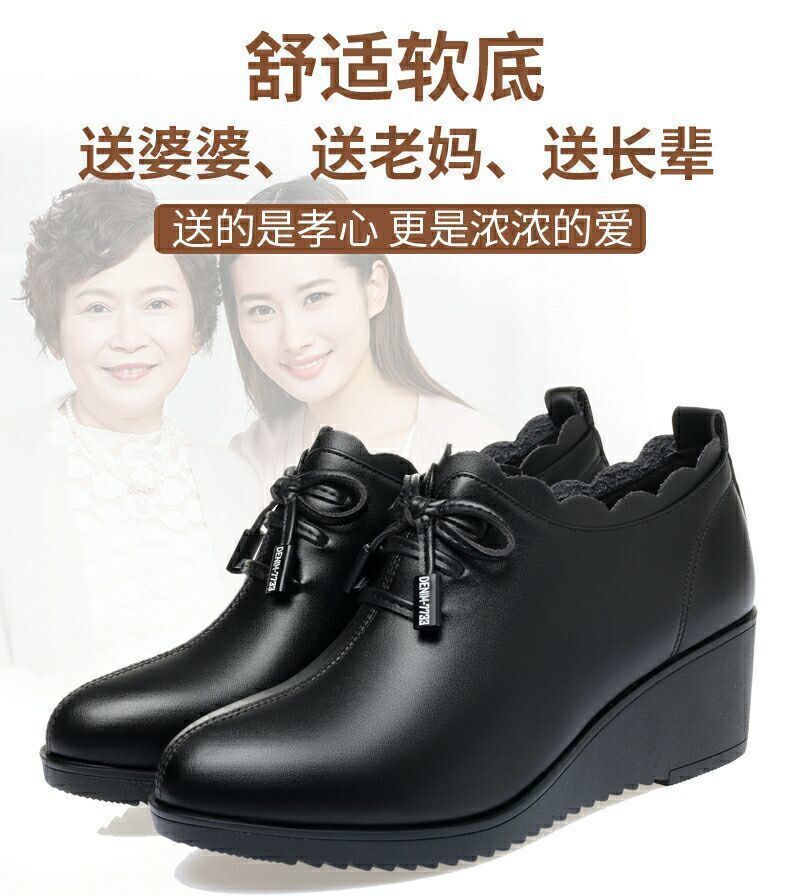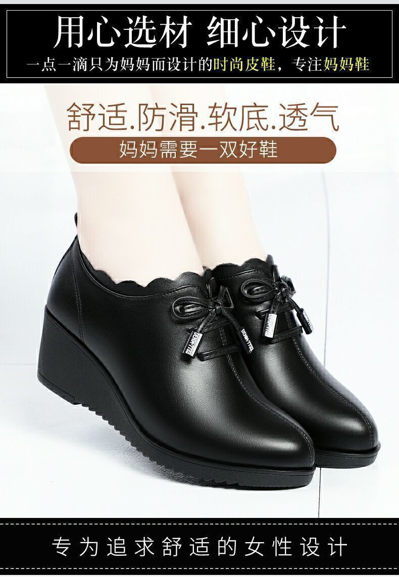 妈妈鞋春秋新款真皮深口舒适侧拉链坡跟防滑女单鞋中老年中跟皮鞋