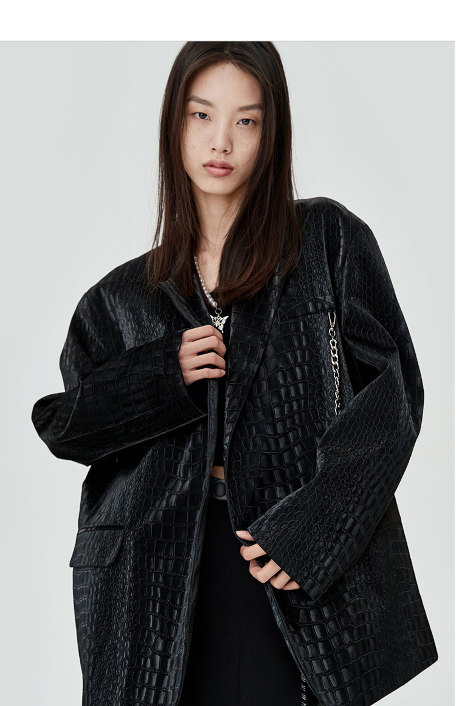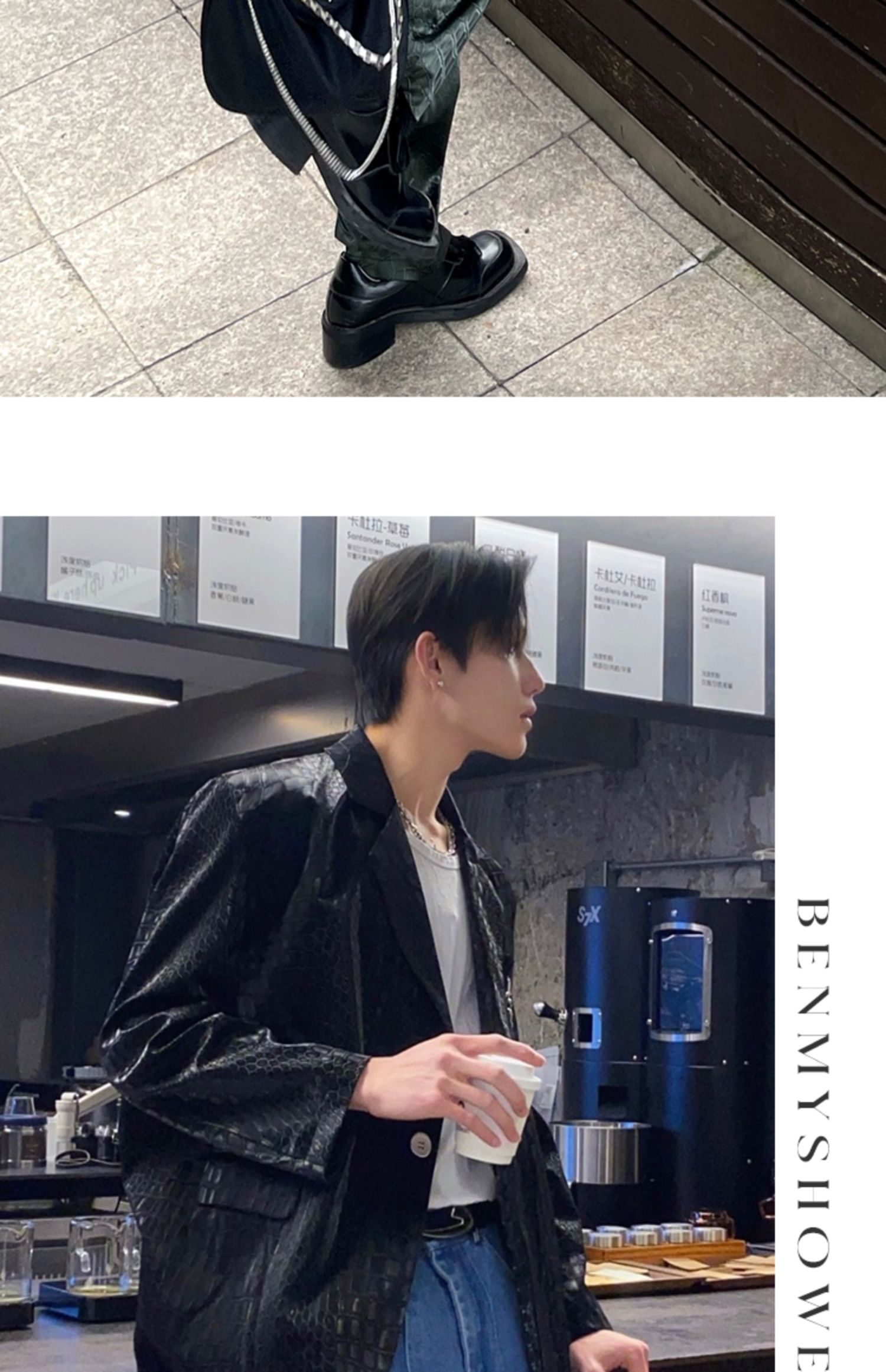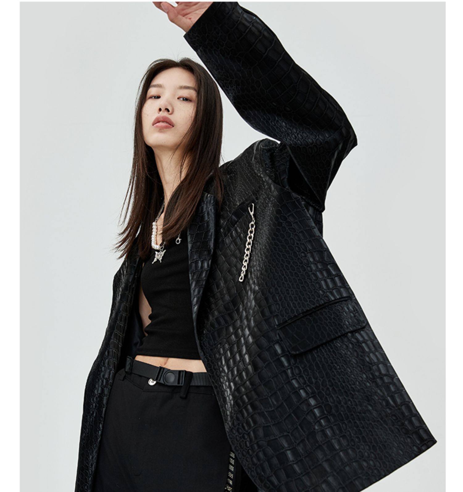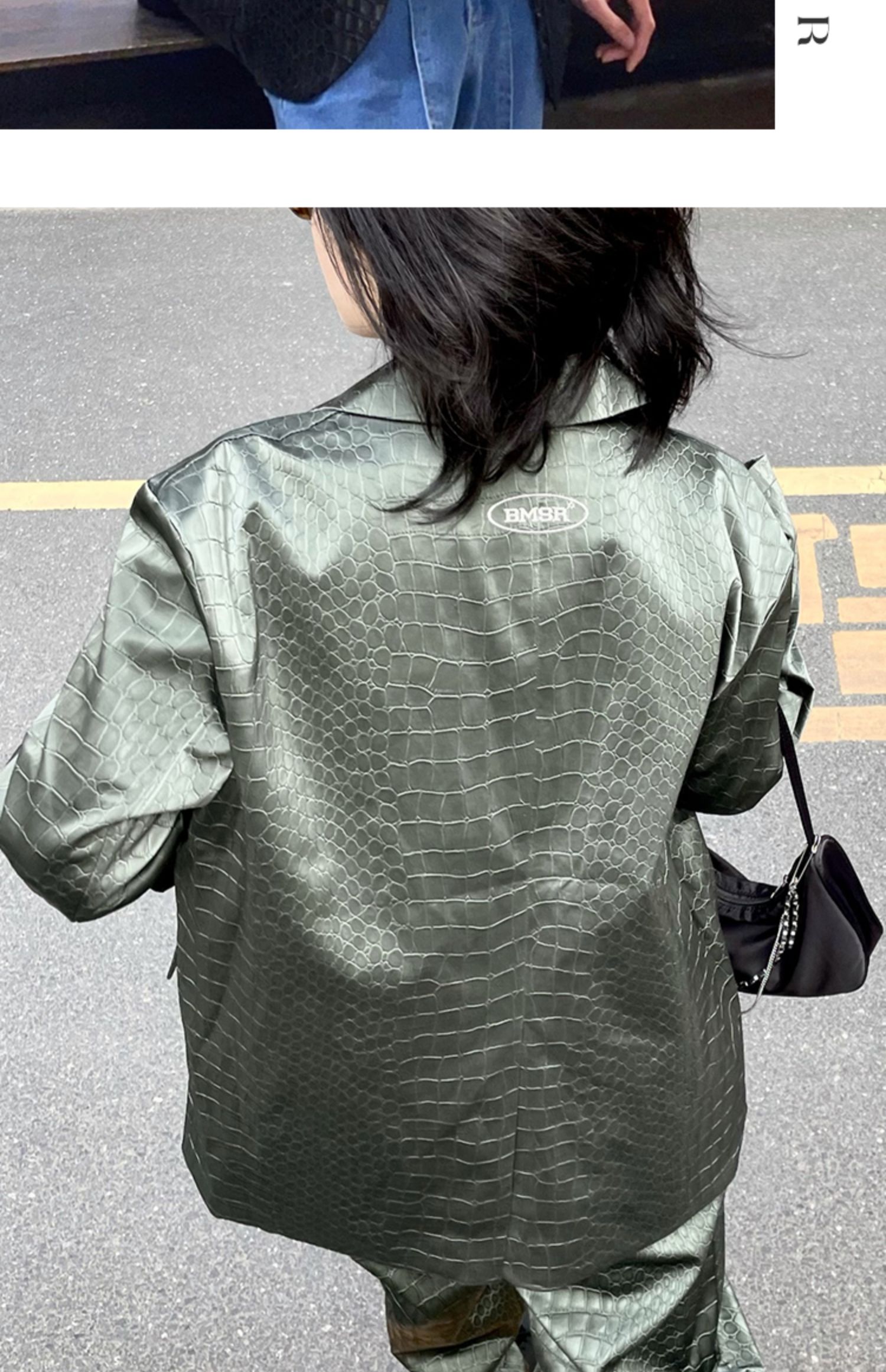 benmyshower国潮鳄鱼纹皮衣夹克潮牌宽松炸街廓形皮西装外套男女