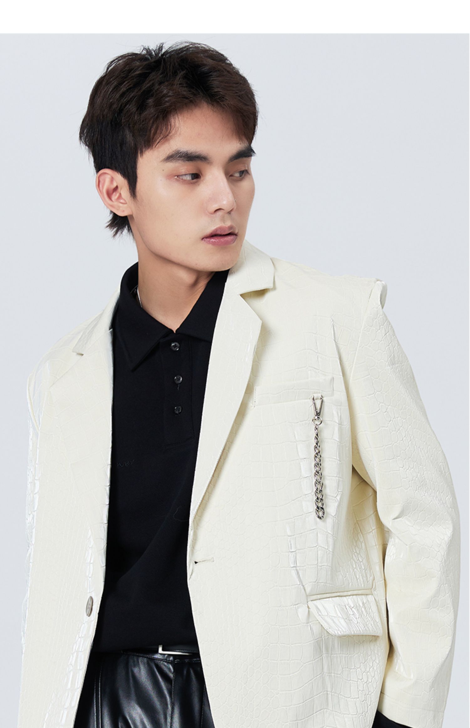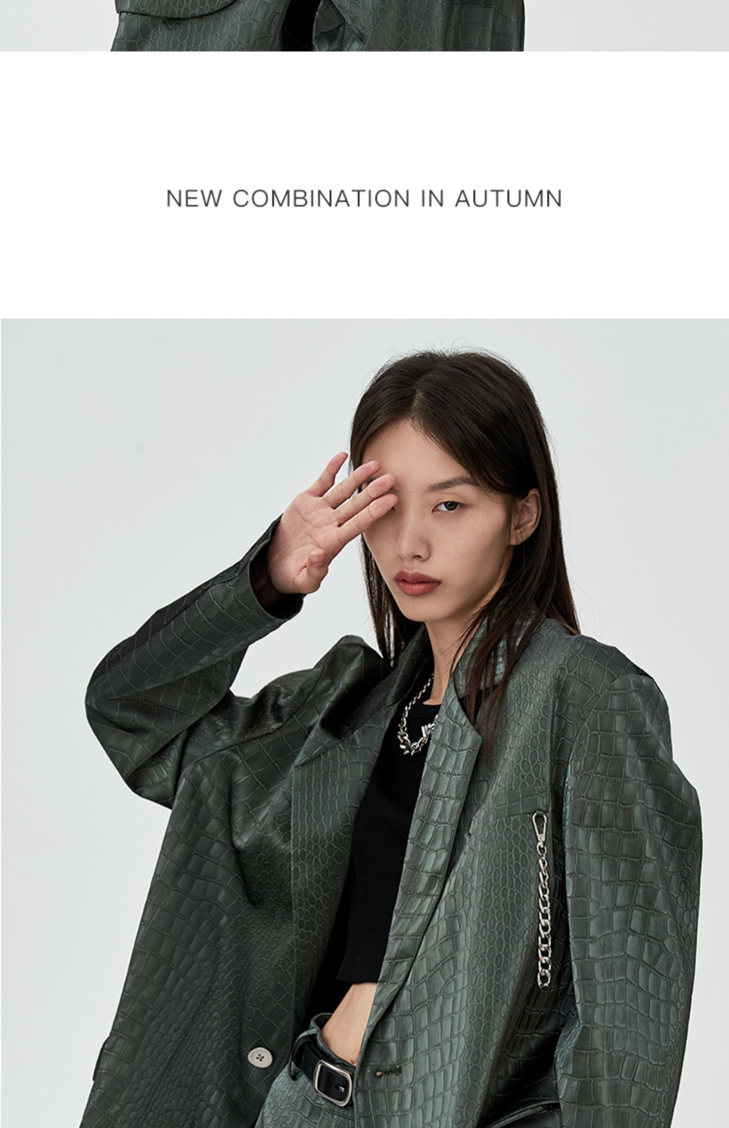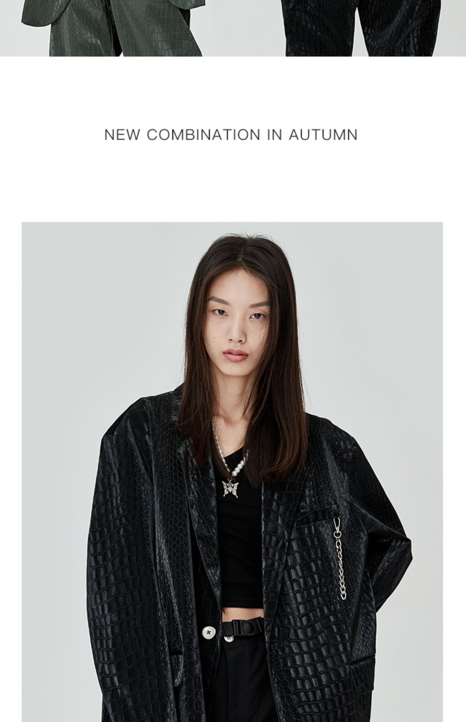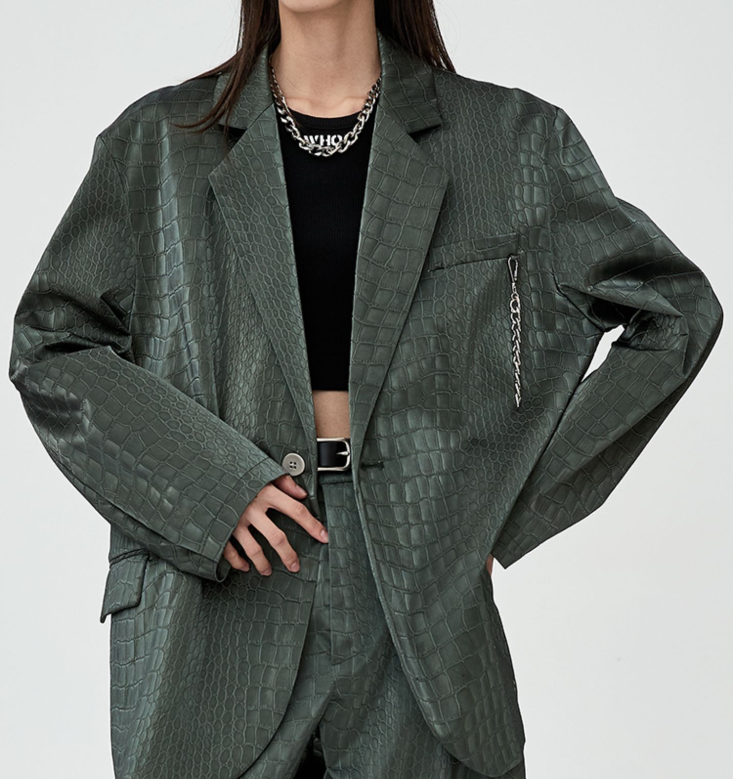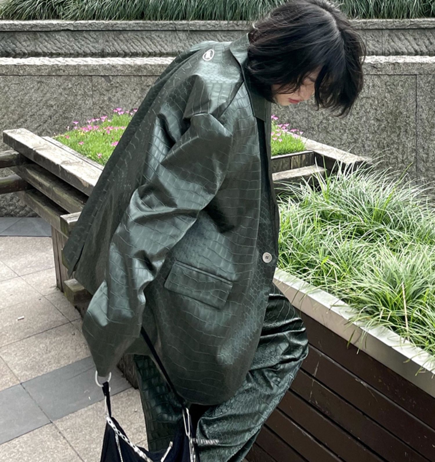 benmyshower国潮鳄鱼纹皮衣夹克潮牌宽松炸街廓形皮西装外套男女