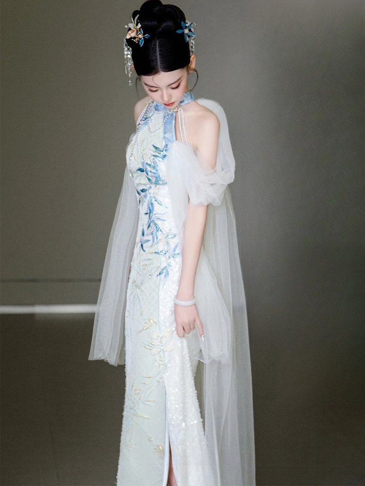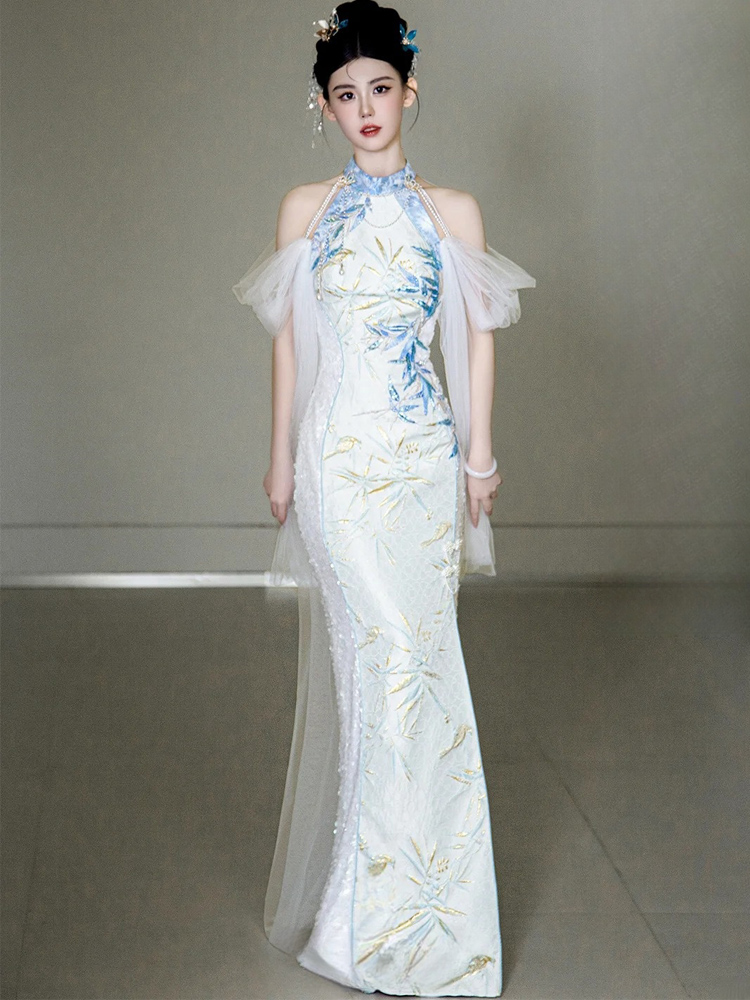 新中式国风晨袍新娘女订婚宴改良小众挂脖重工旗袍高端轻奢晚礼服