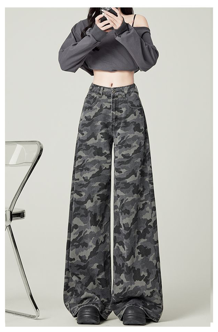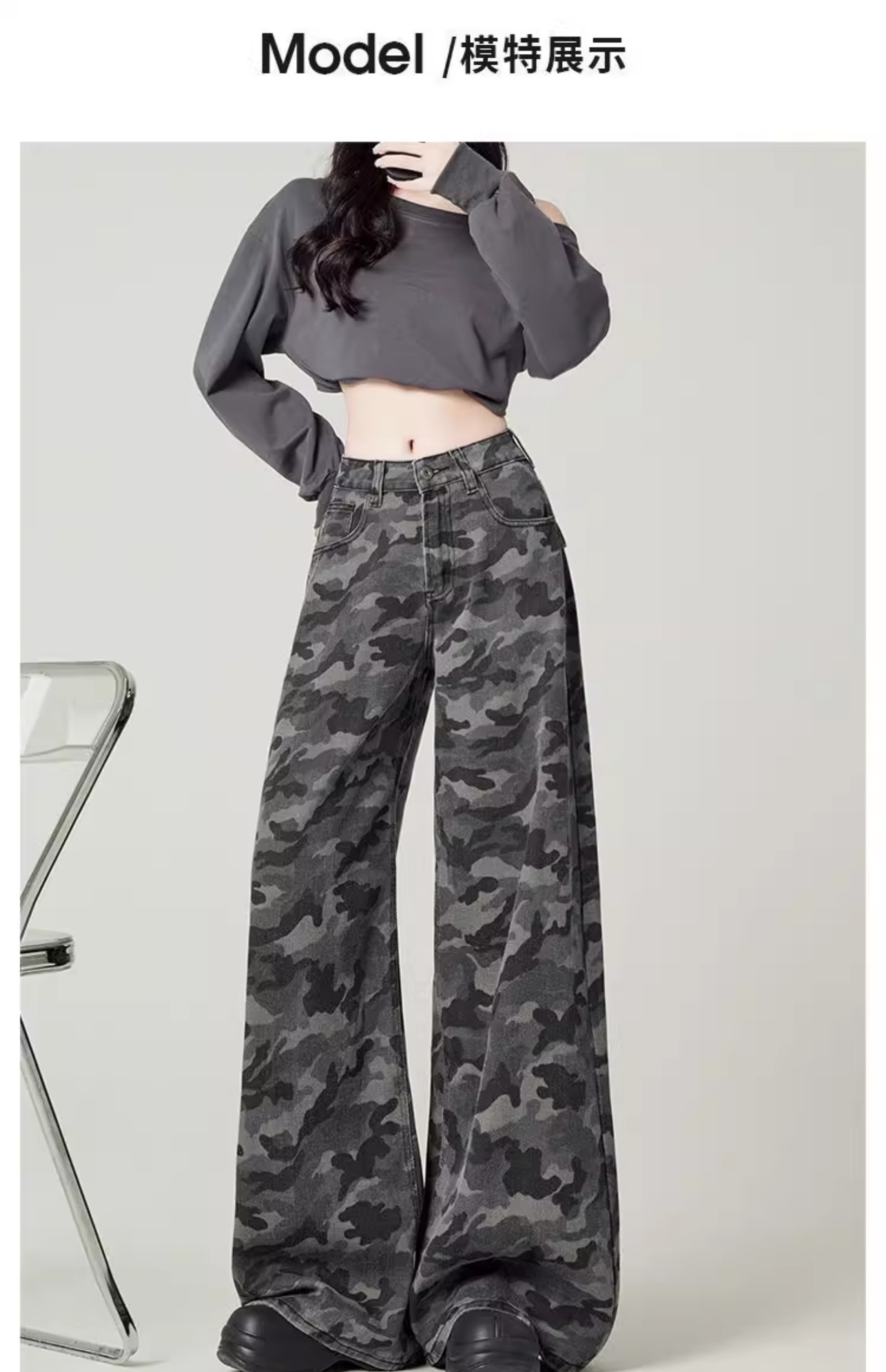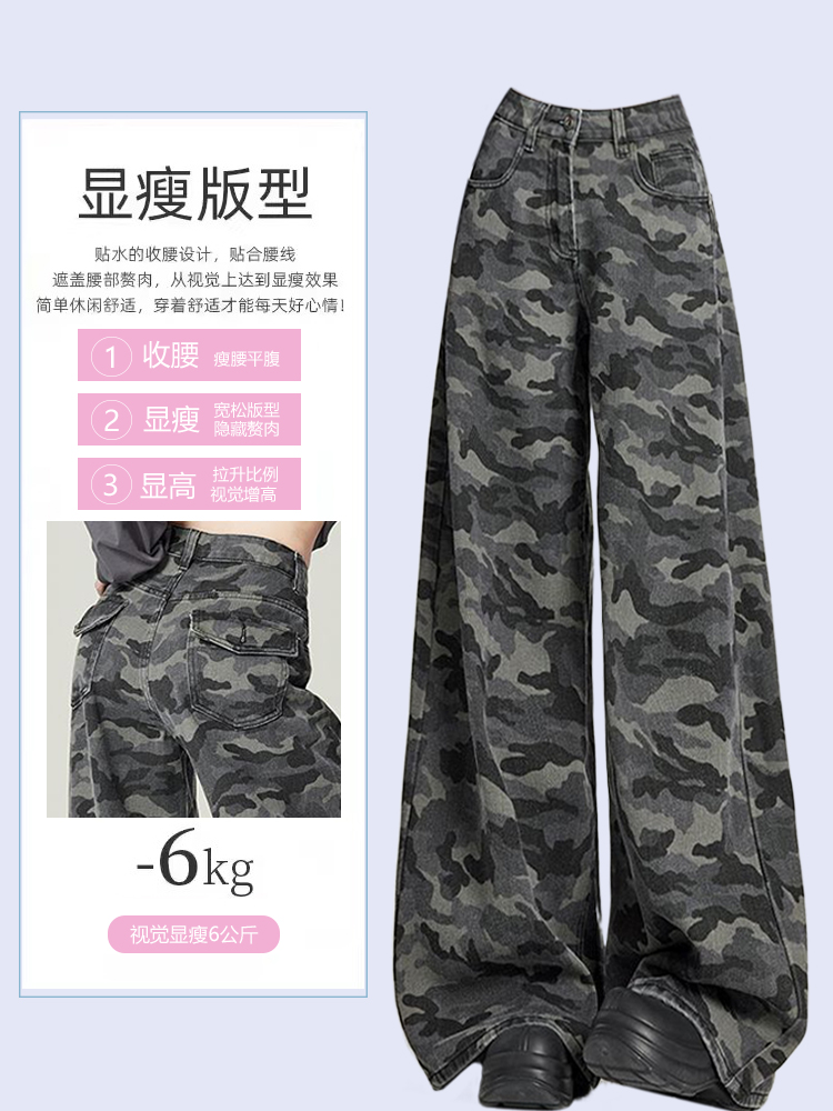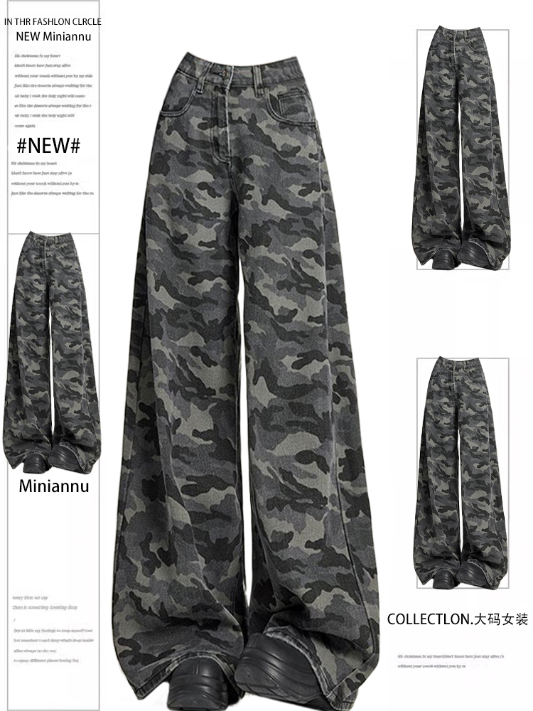 300斤特大码女装灰色迷彩工装牛仔裤女胖mm美式复古高腰阔腿裤子