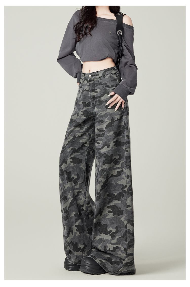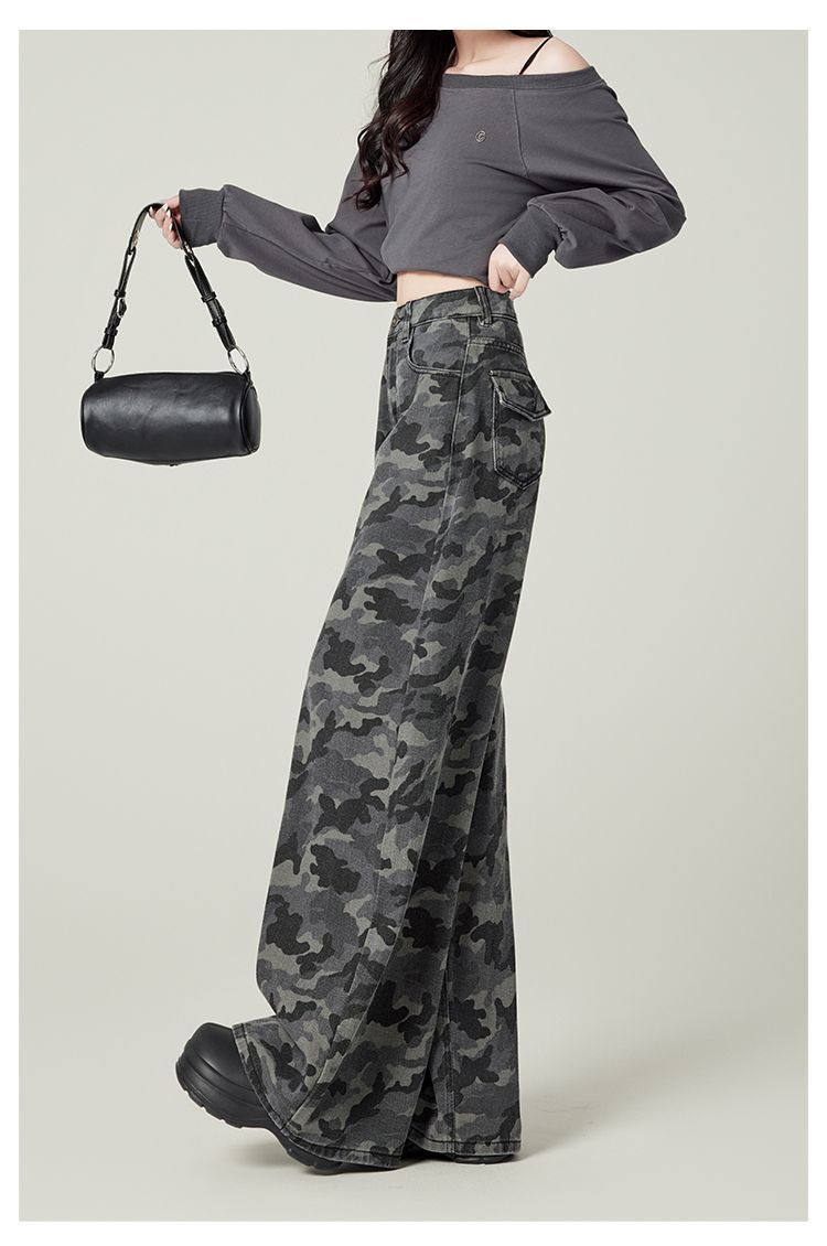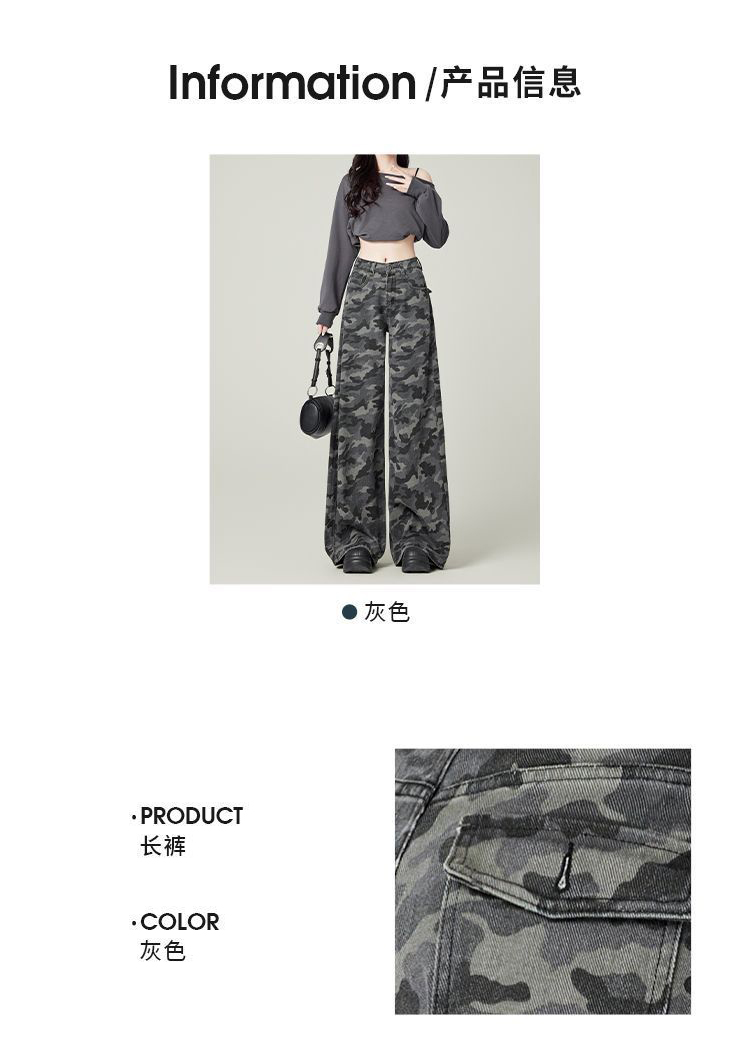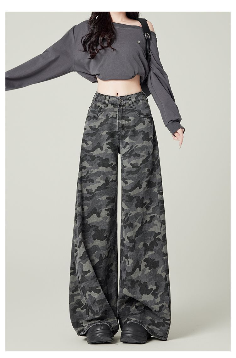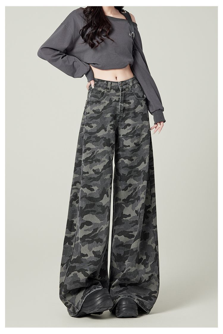 300斤特大码女装灰色迷彩工装牛仔裤女胖mm美式复古高腰阔腿裤子