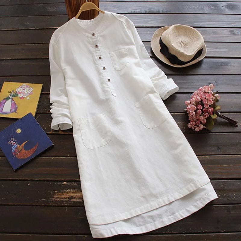 清仓特价~200斤大码女装春秋白色立领亚麻衬衫裙长袖棉麻连衣裙夏