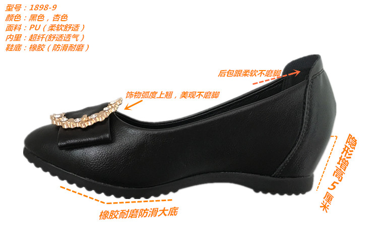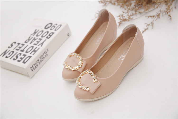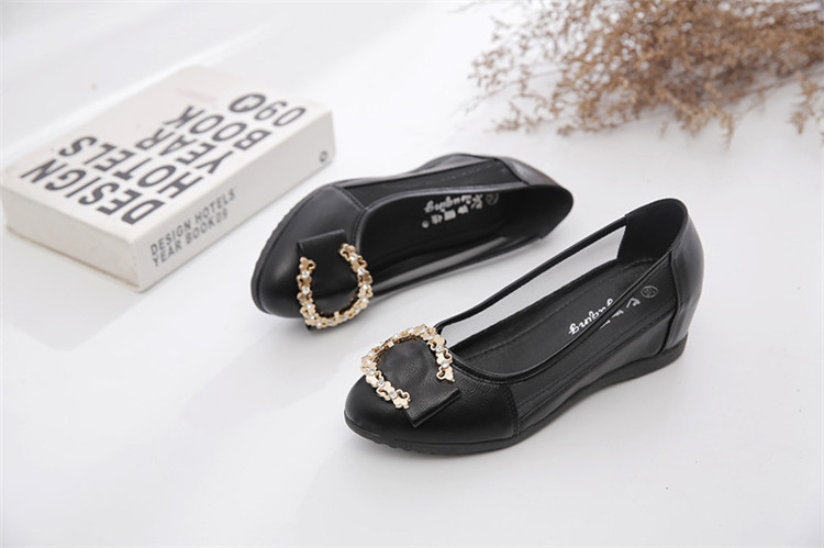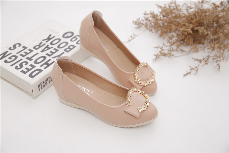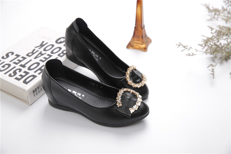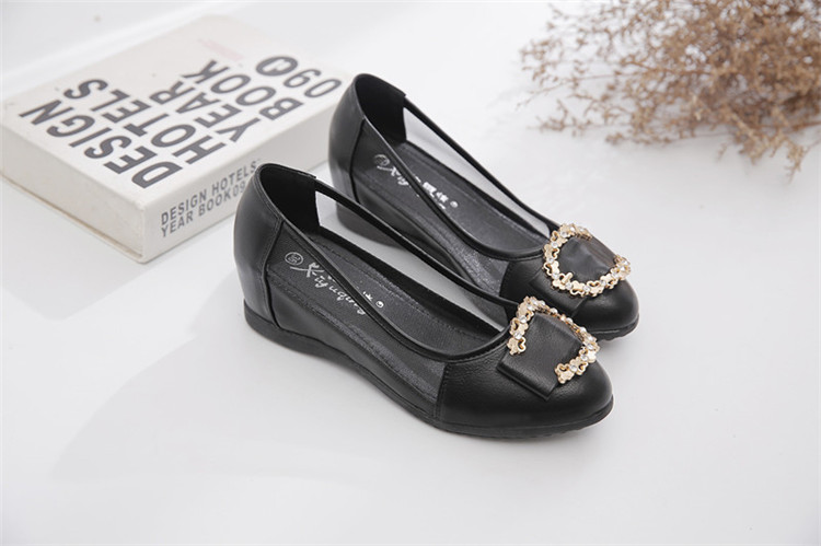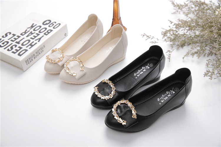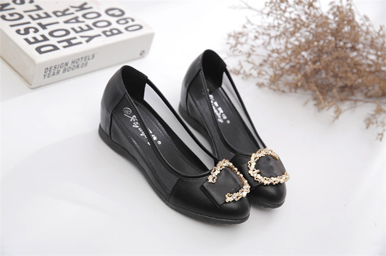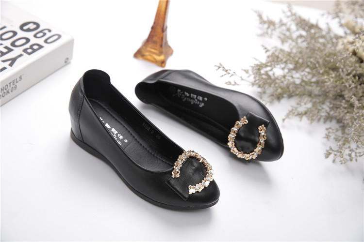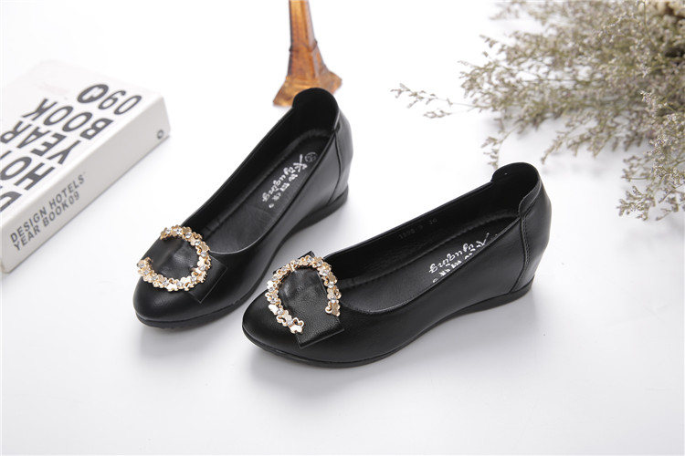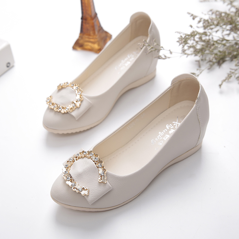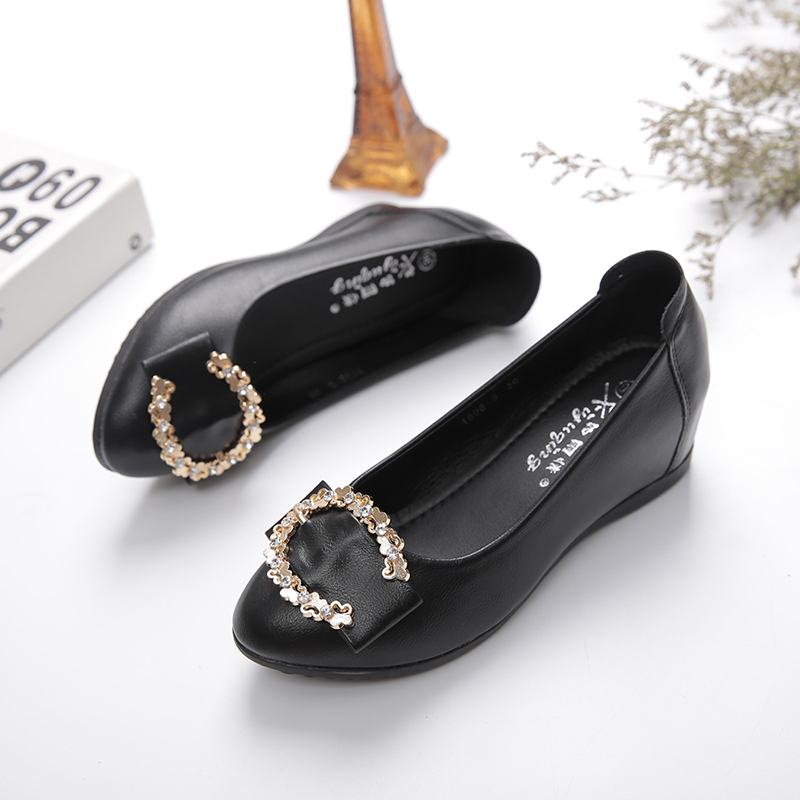 内增高单鞋女2025春季新款圆头舒适软皮妈妈鞋百搭水钻坡跟豆豆鞋