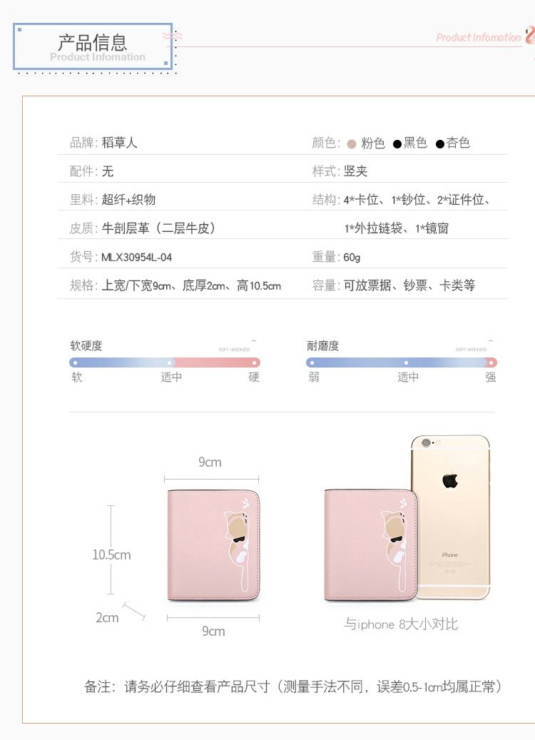 稻草人钱包女短款薄韩版两折叠学生小清新个性可爱多功能简约牛皮