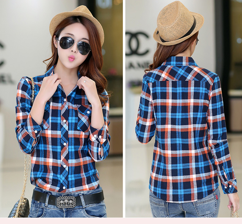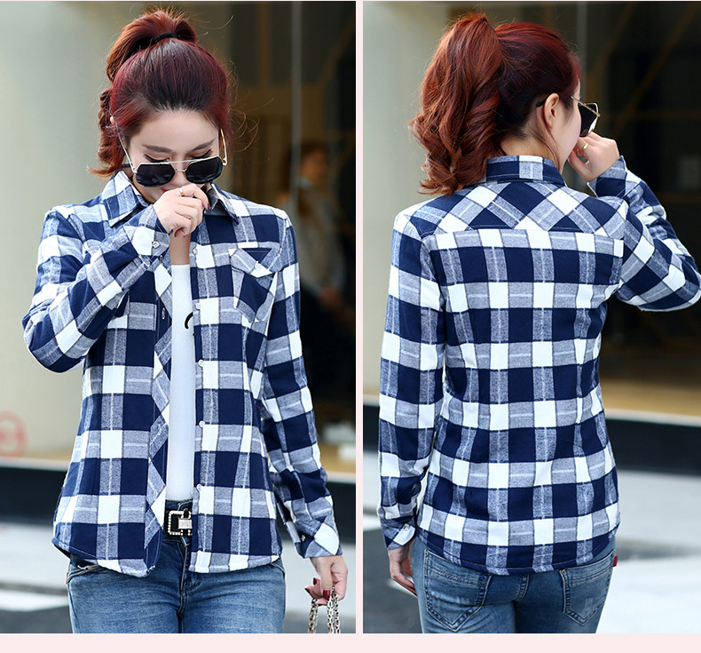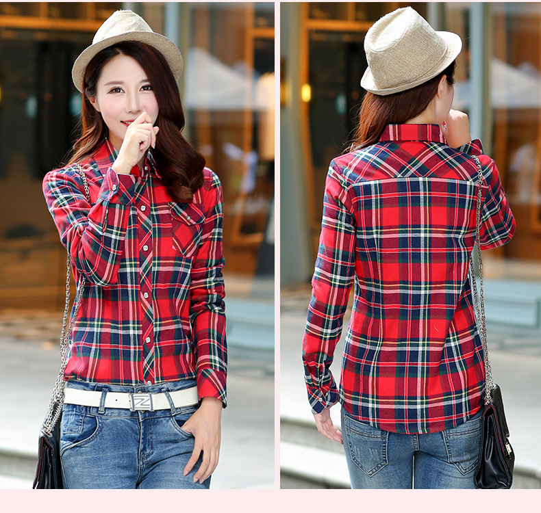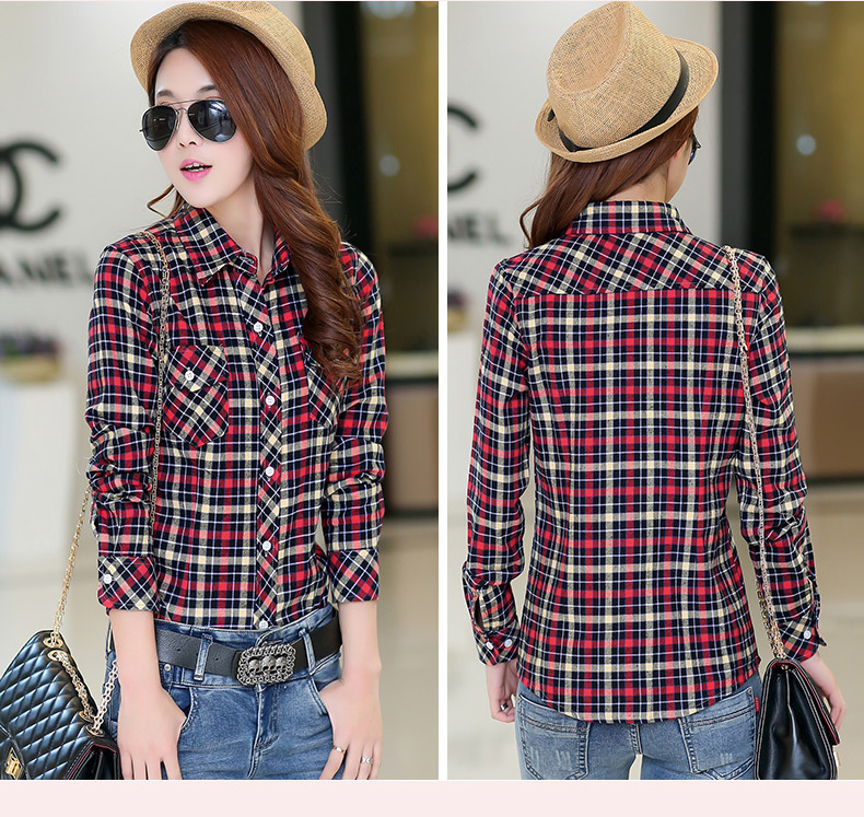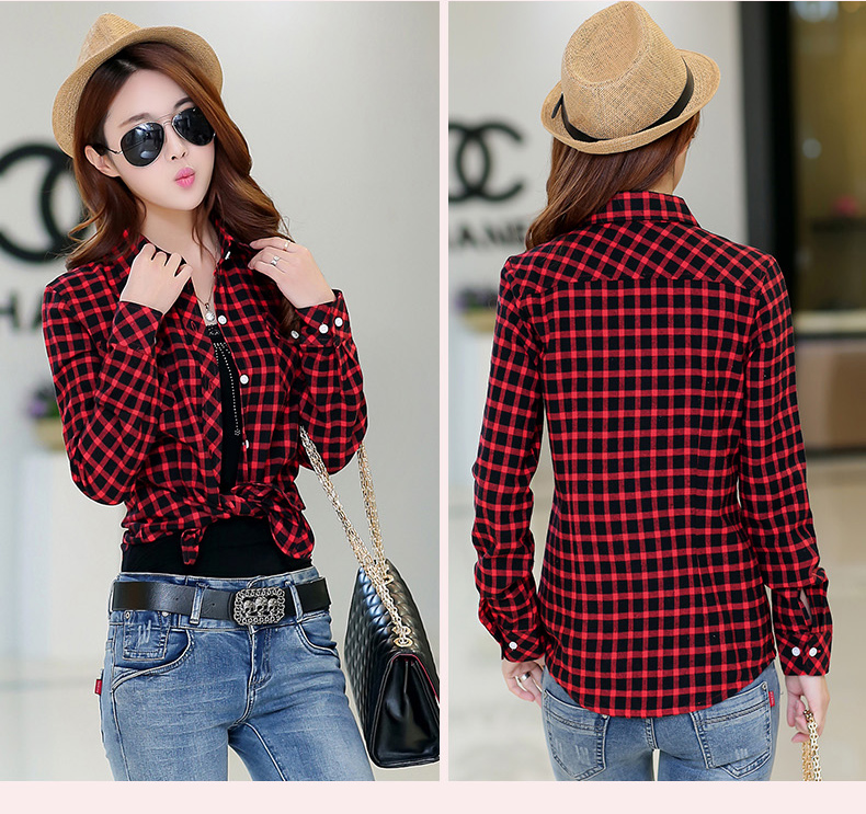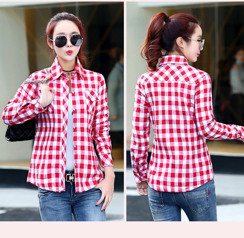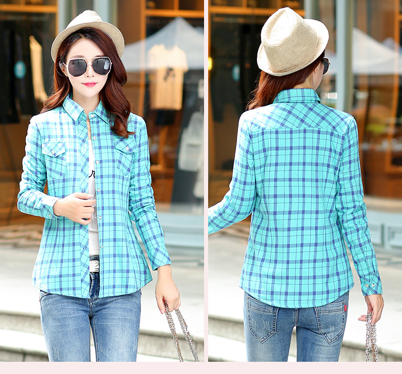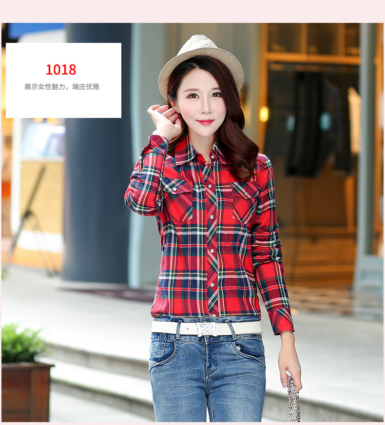 格子衬衫女长袖韩范学院风春秋新款女装 大码百搭打底衬衣女