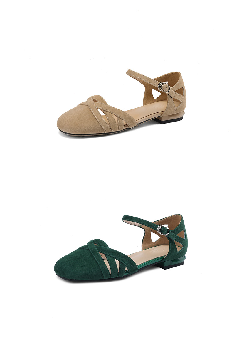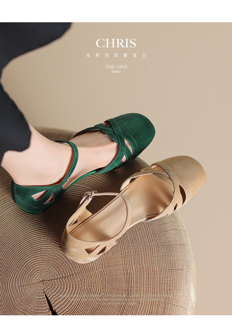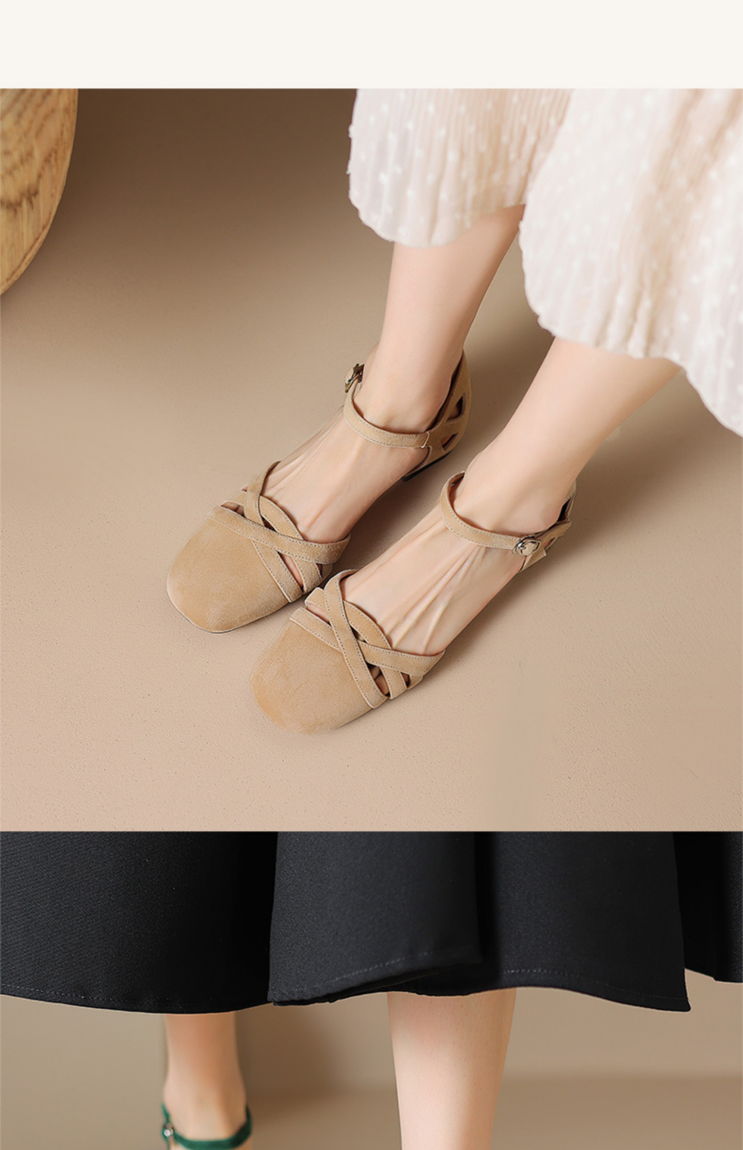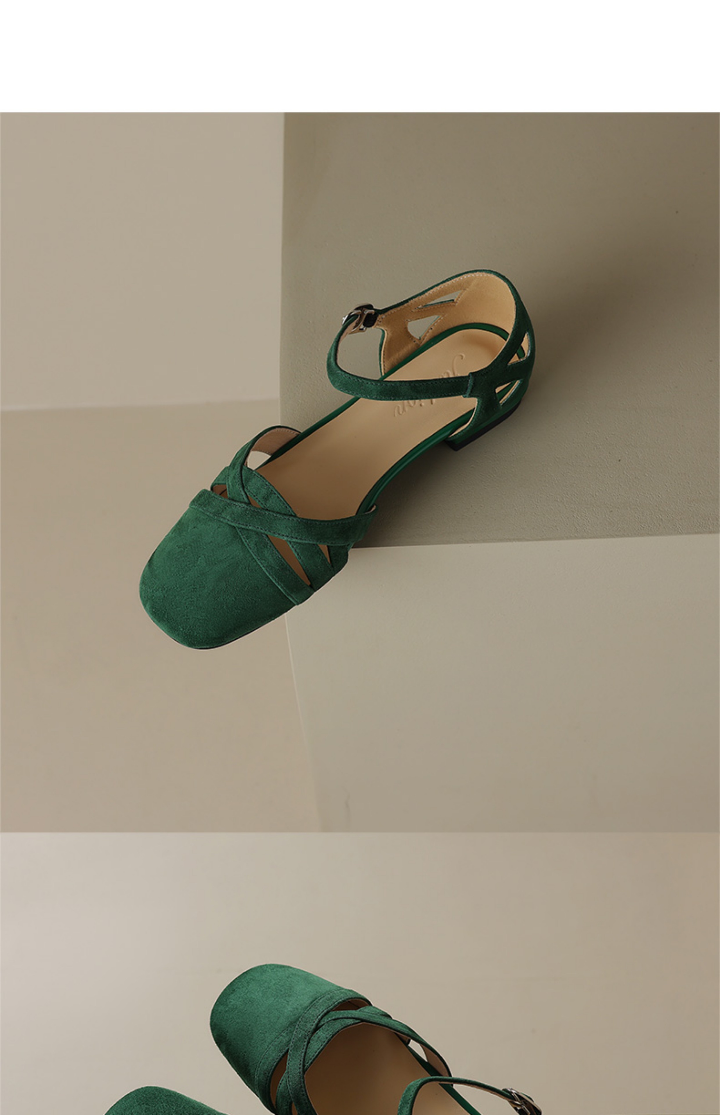 罗马复古包头凉鞋女夏真皮平底粗跟软皮磨砂绿色软底猪笼编织凉鞋