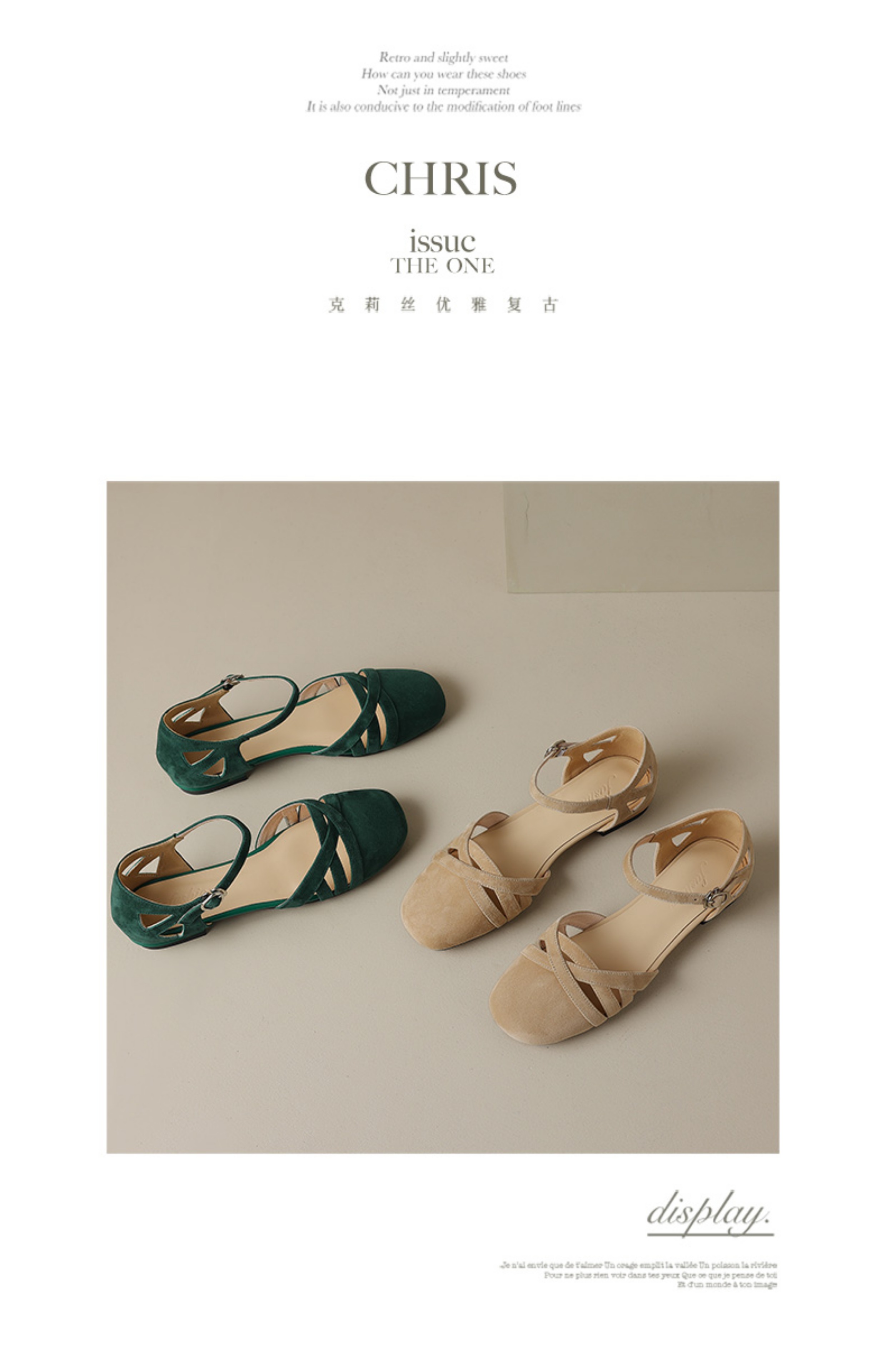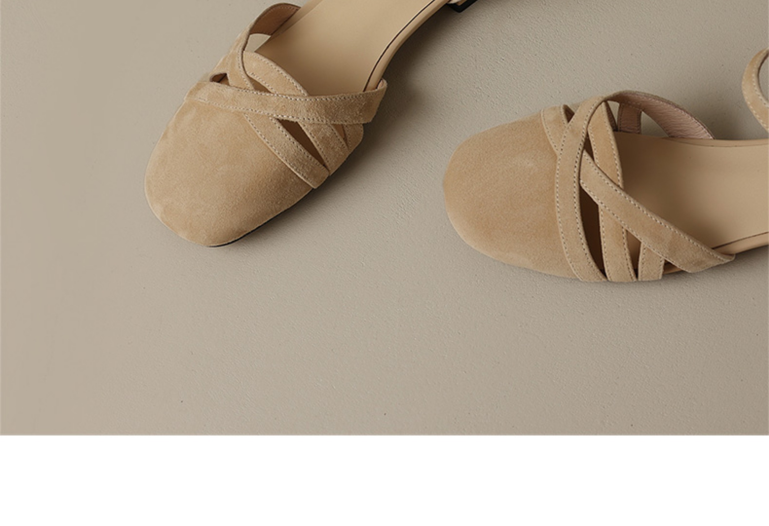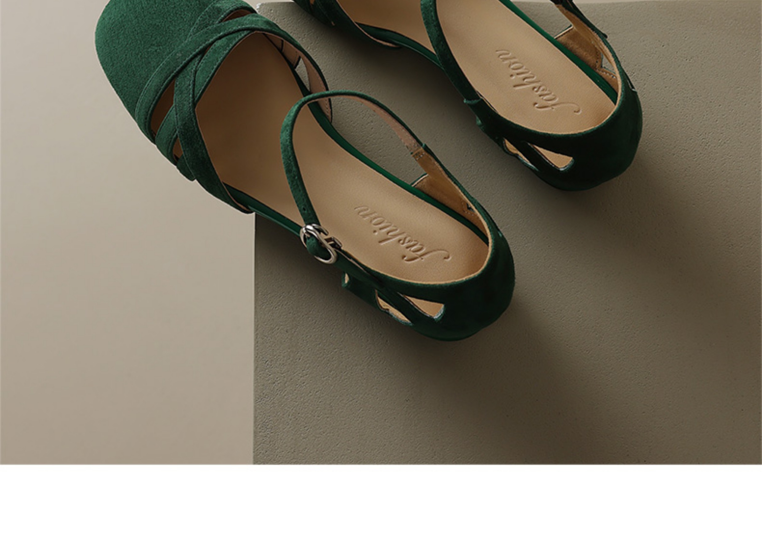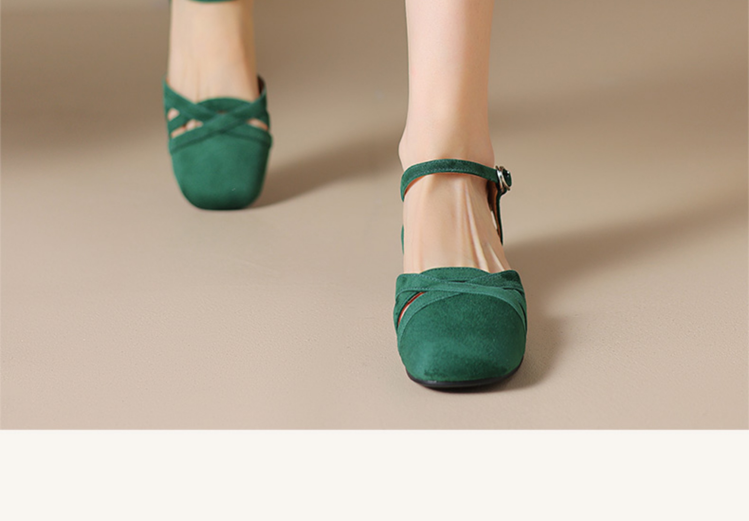 罗马复古包头凉鞋女夏真皮平底粗跟软皮磨砂绿色软底猪笼编织凉鞋