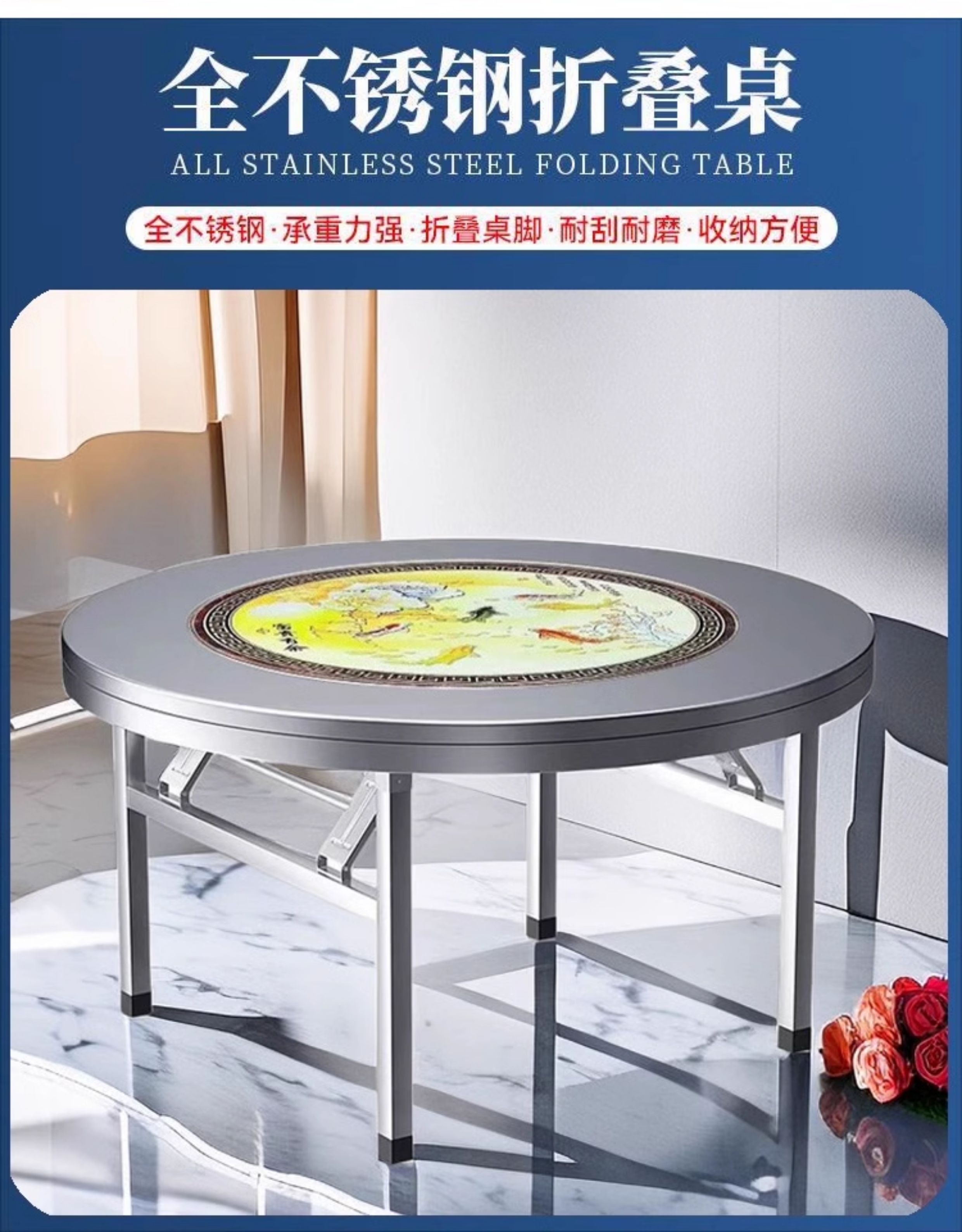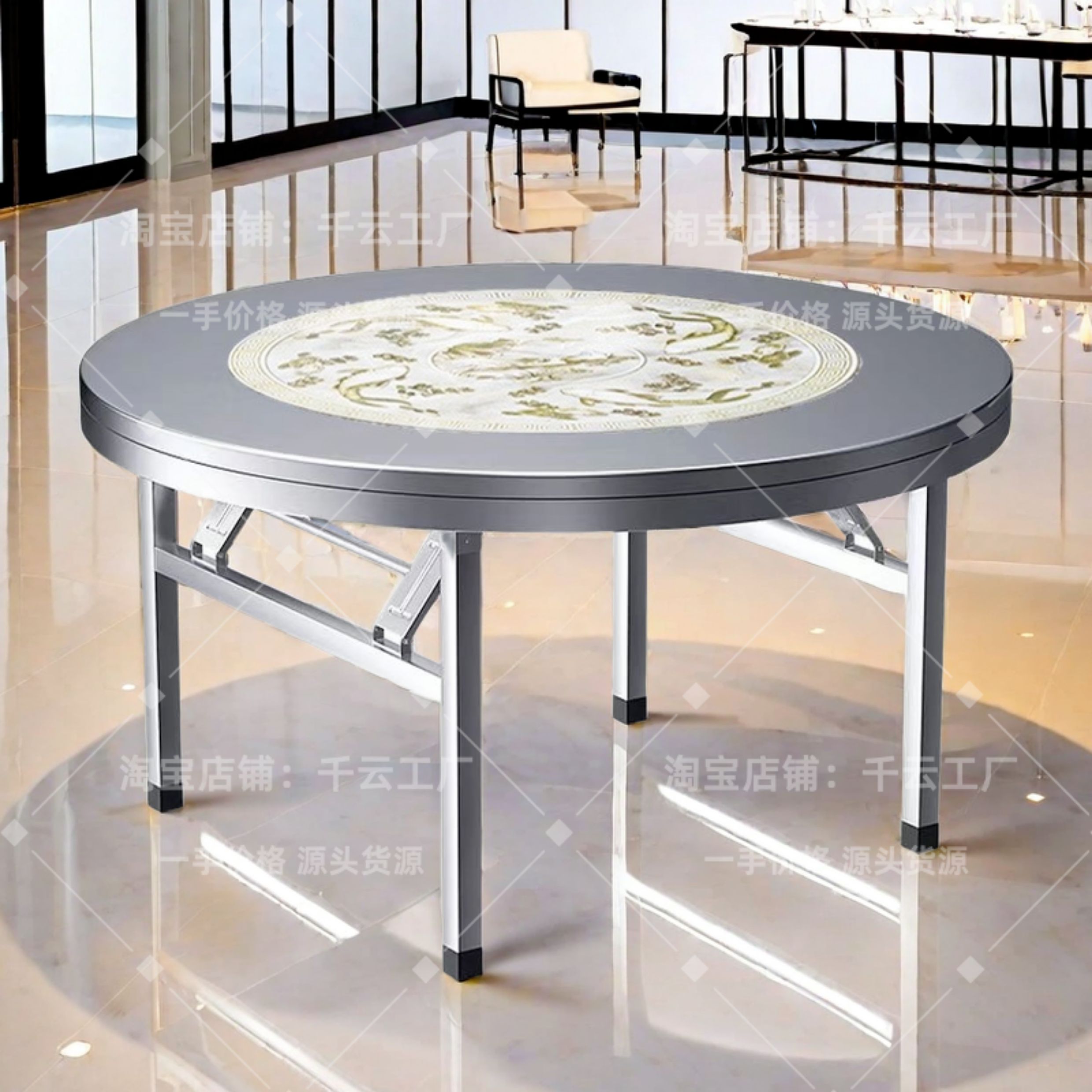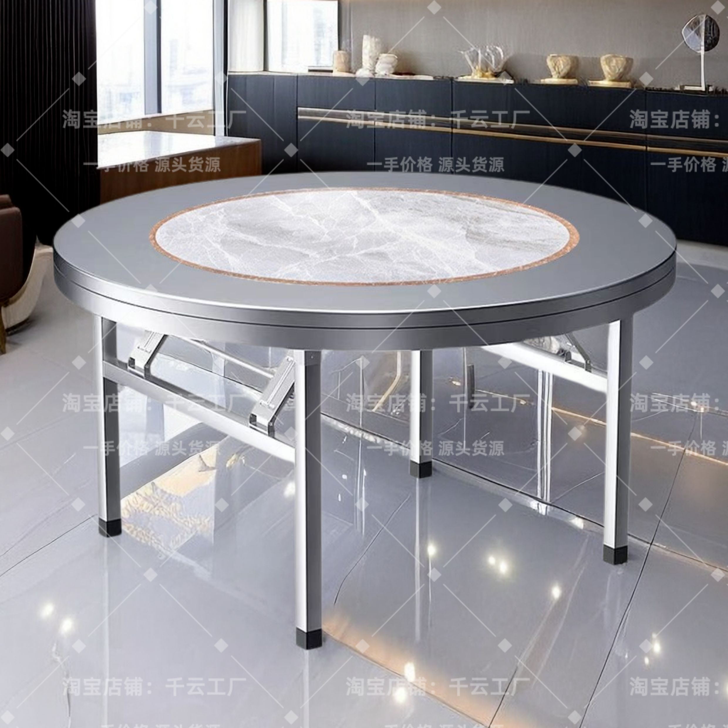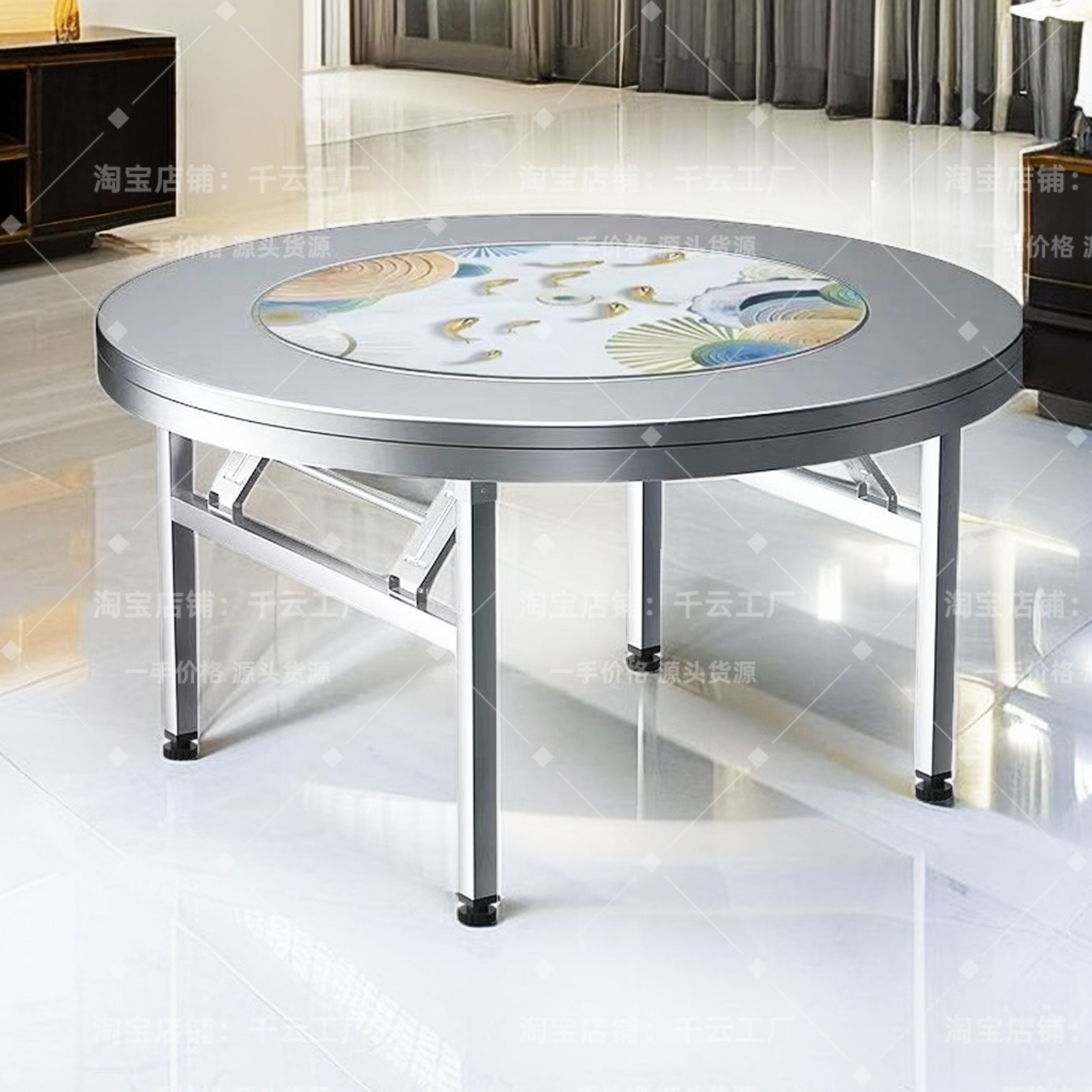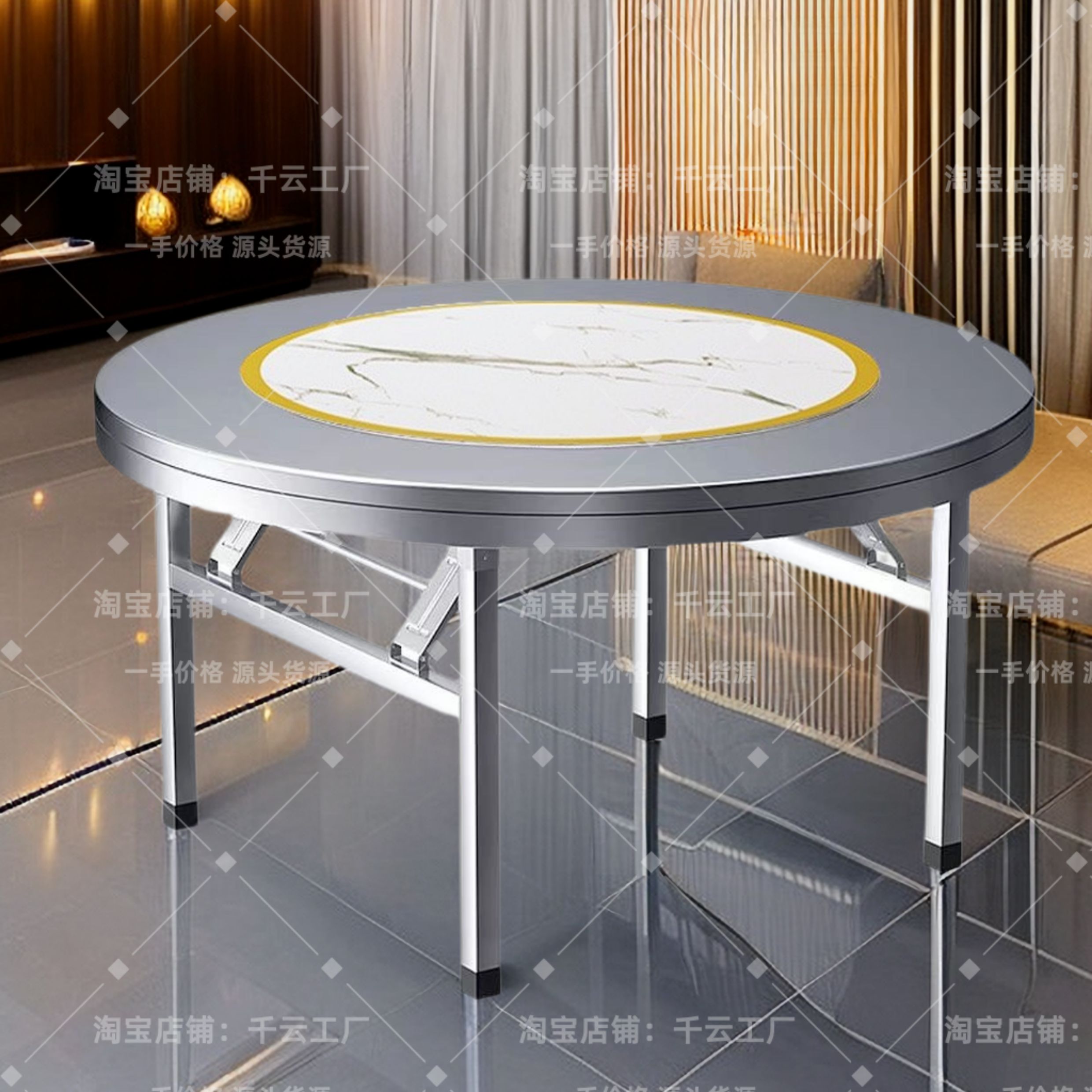 不锈钢转盘圆桌子内置彩图可折叠家用餐桌饭桌商用酒席圆台免安装
