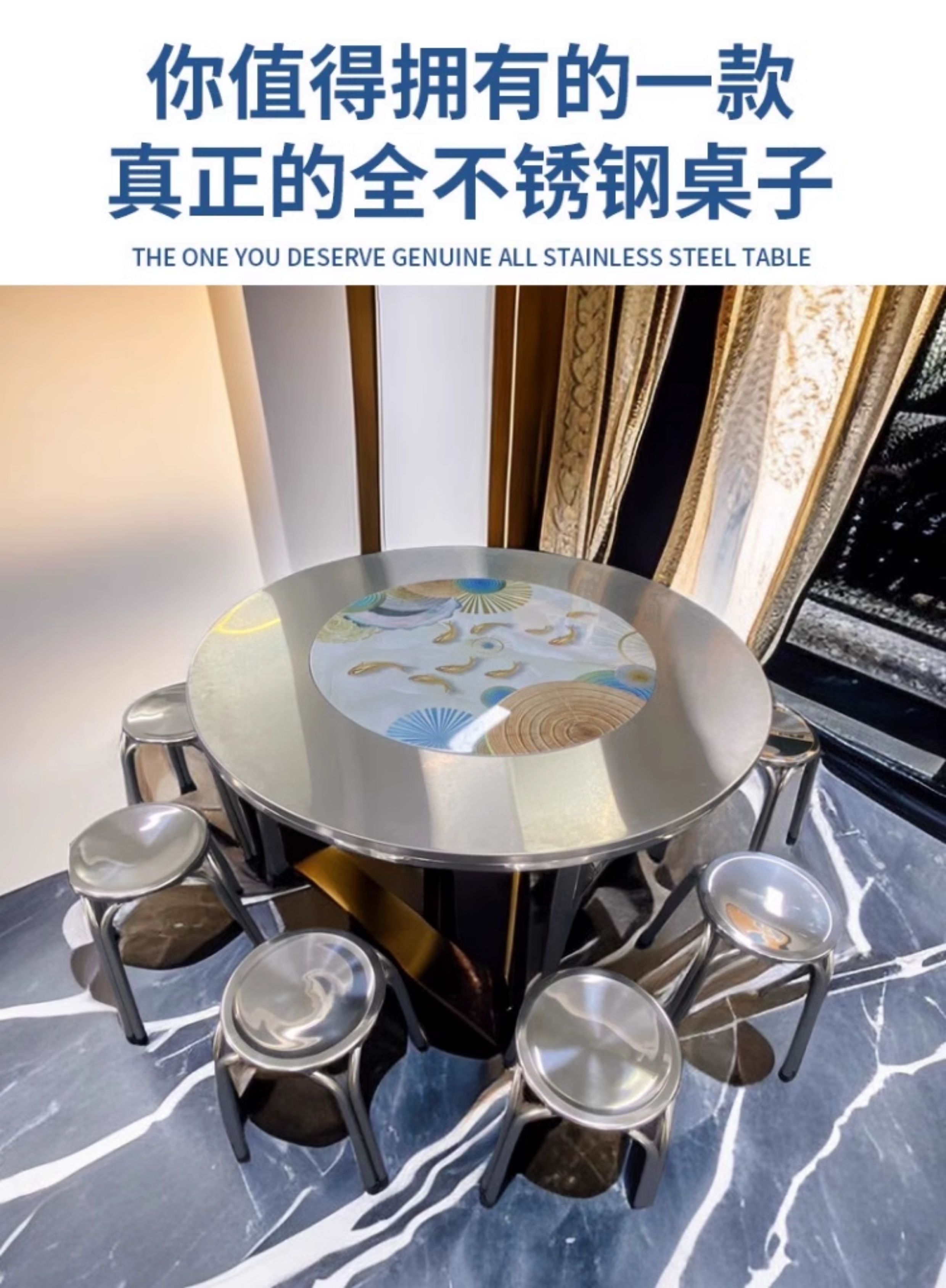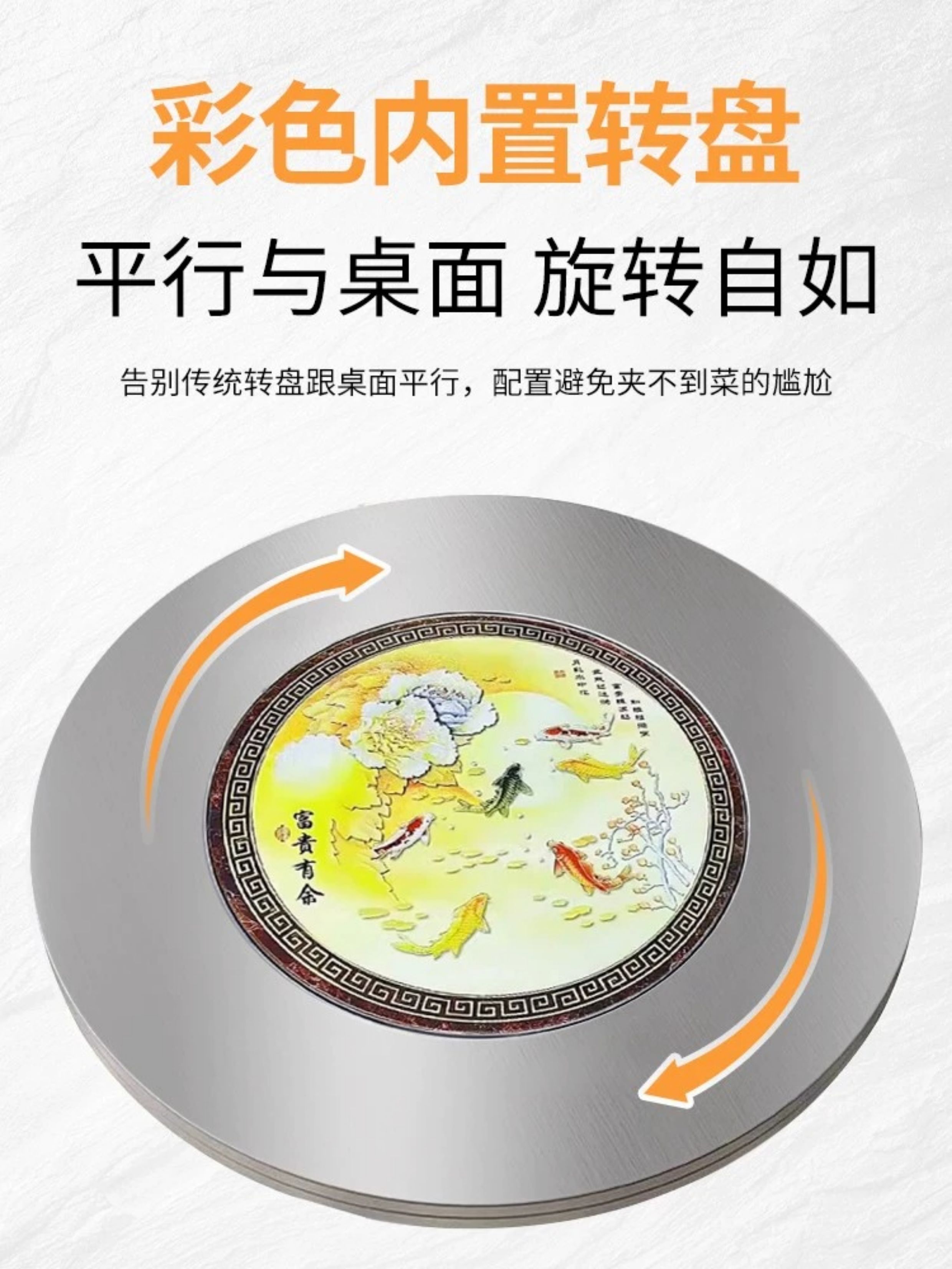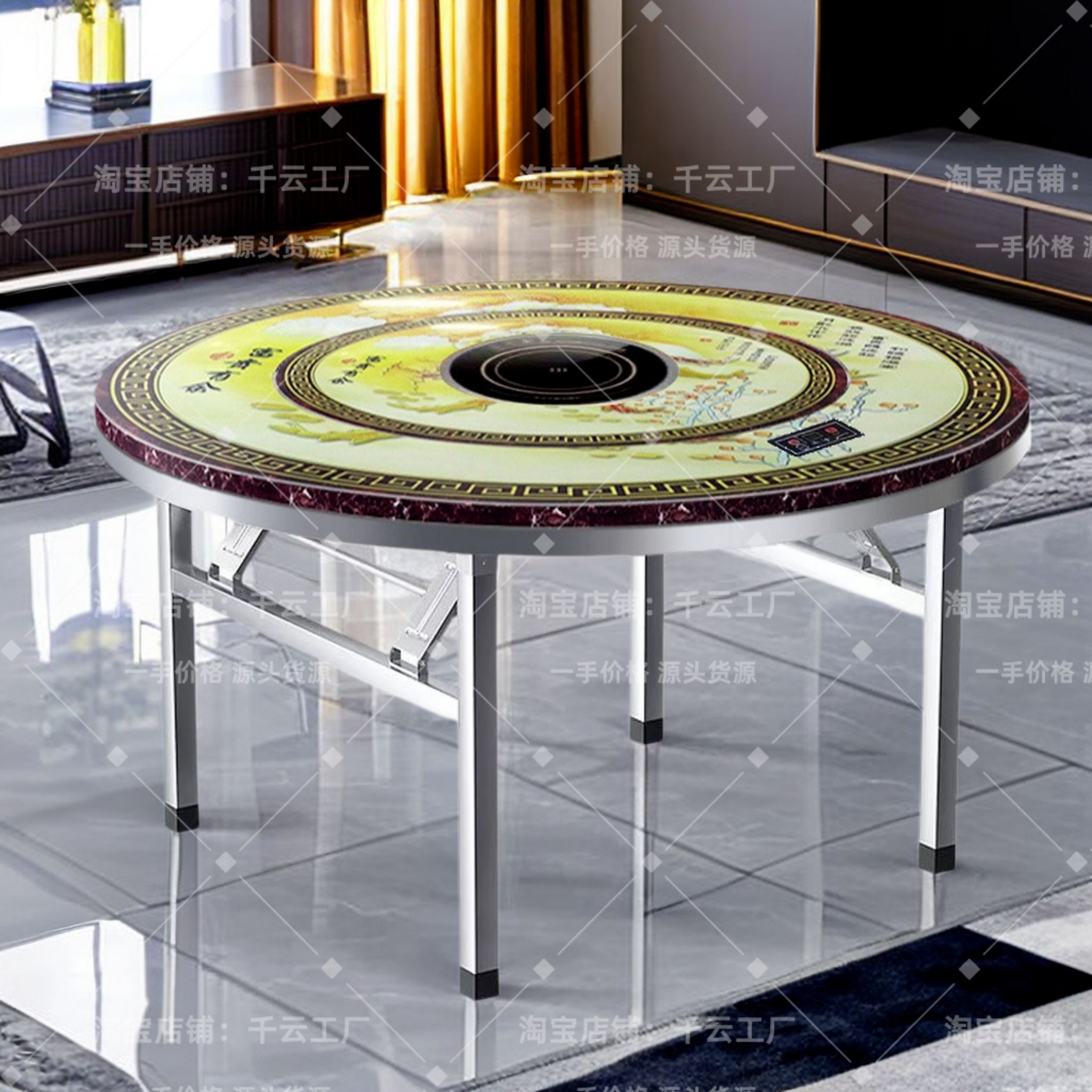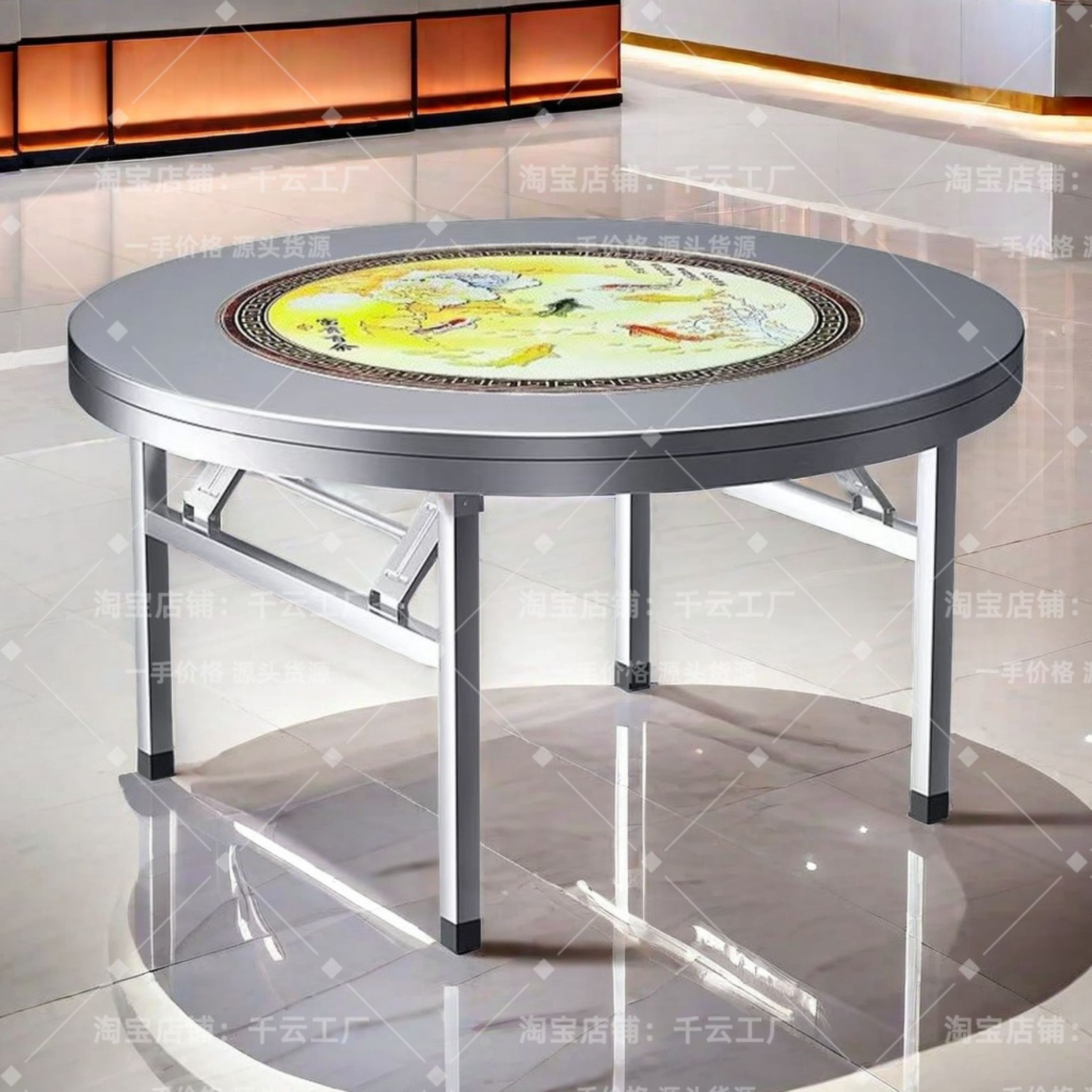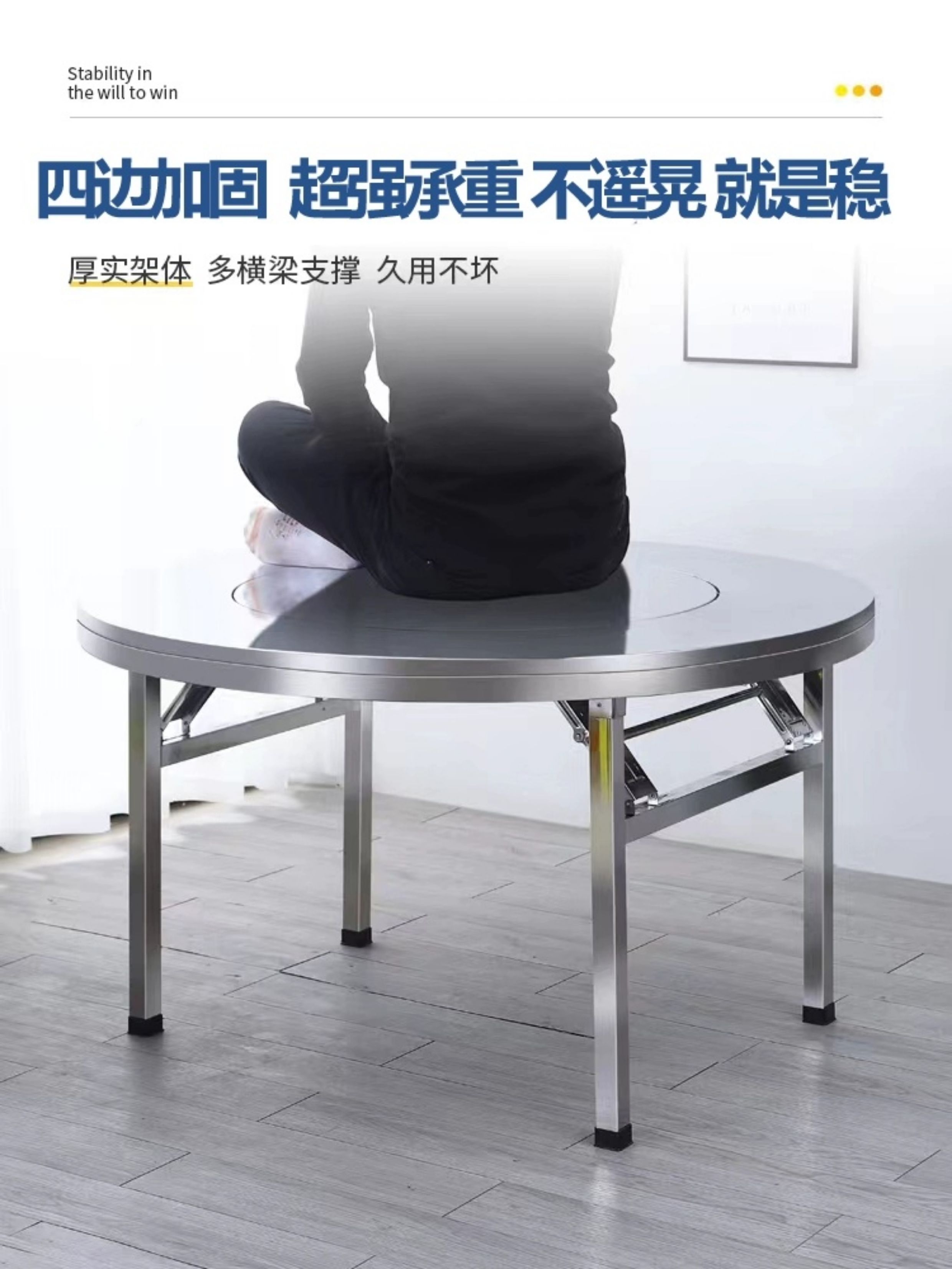 不锈钢转盘圆桌子内置彩图可折叠家用餐桌饭桌商用酒席圆台免安装