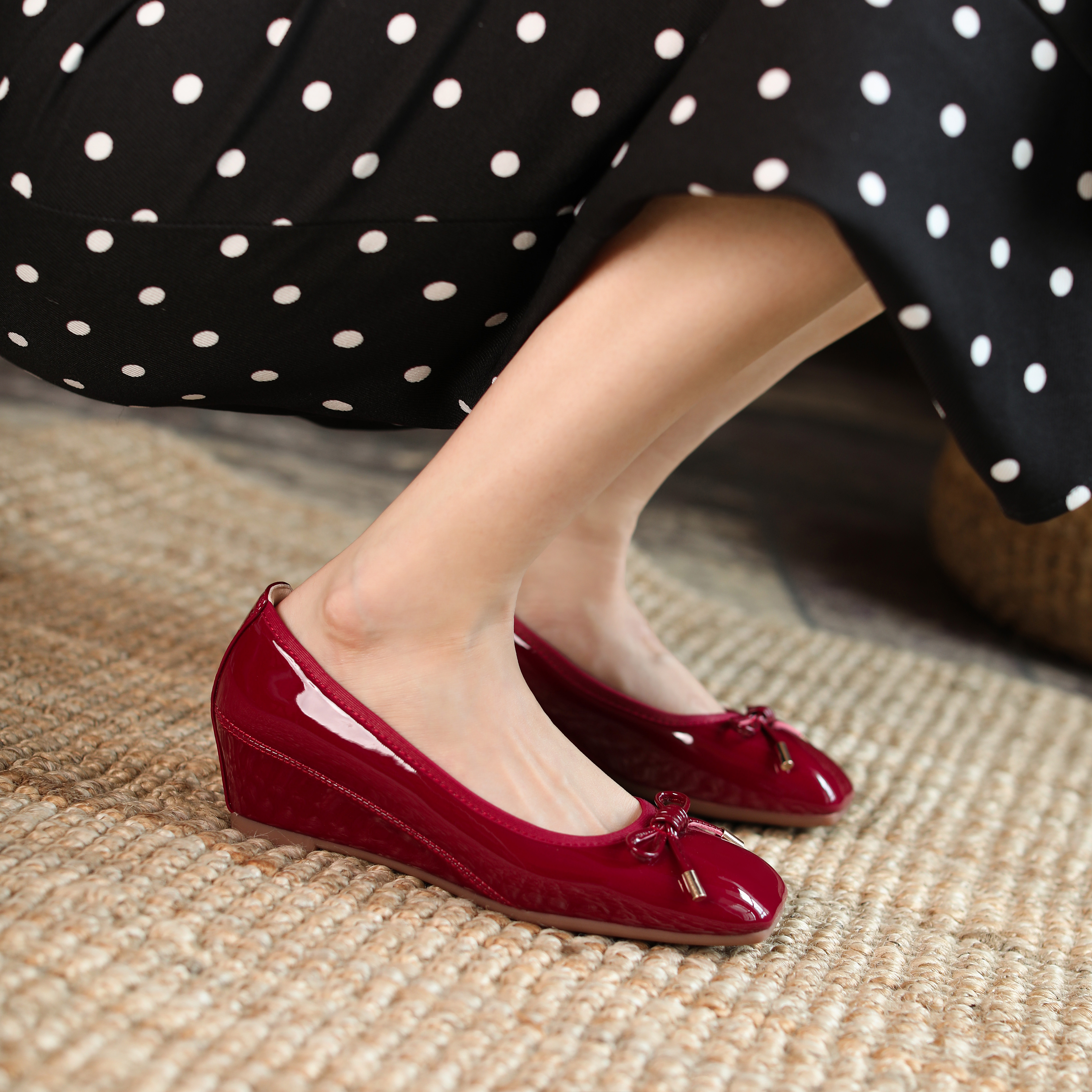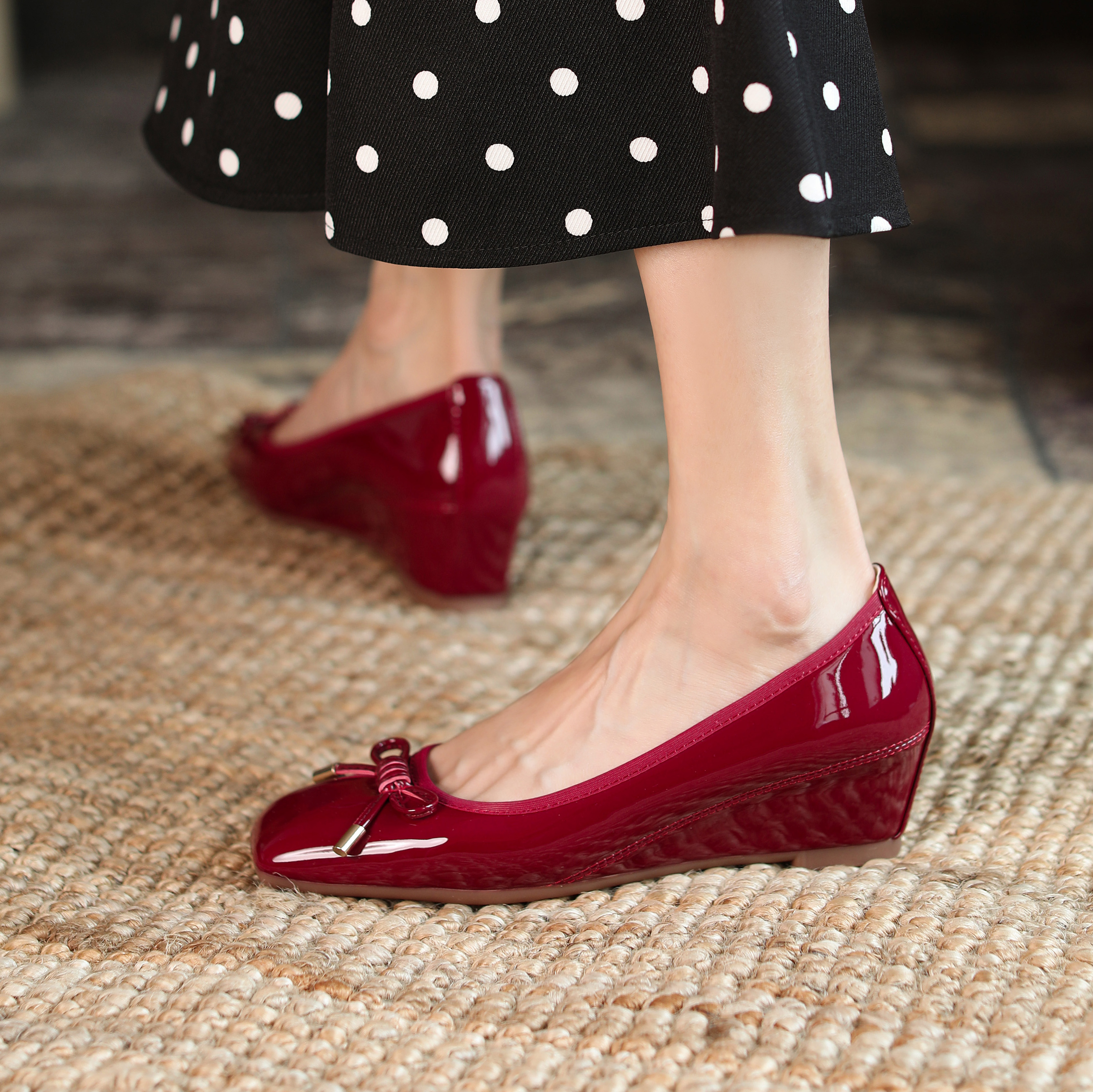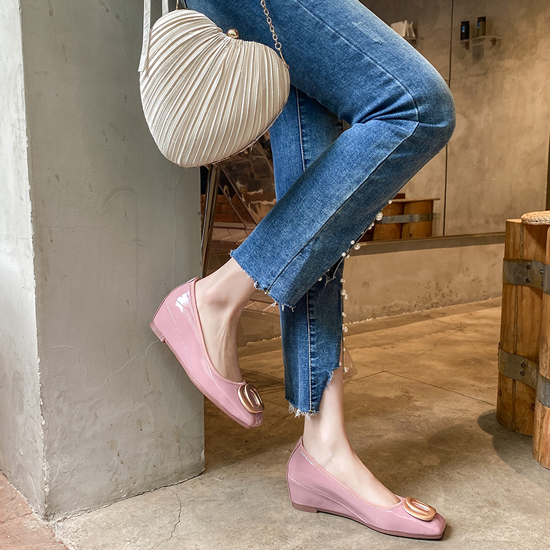 方头内增高藕粉色豆豆鞋女蝴蝶结坡跟软底女鞋34小码中跟蛋卷单鞋