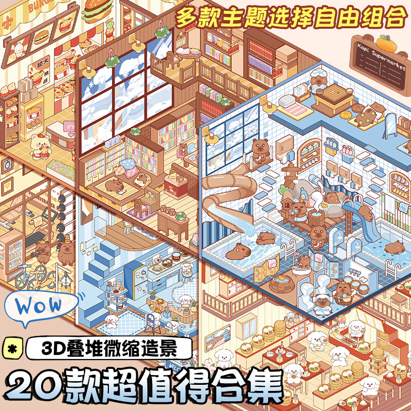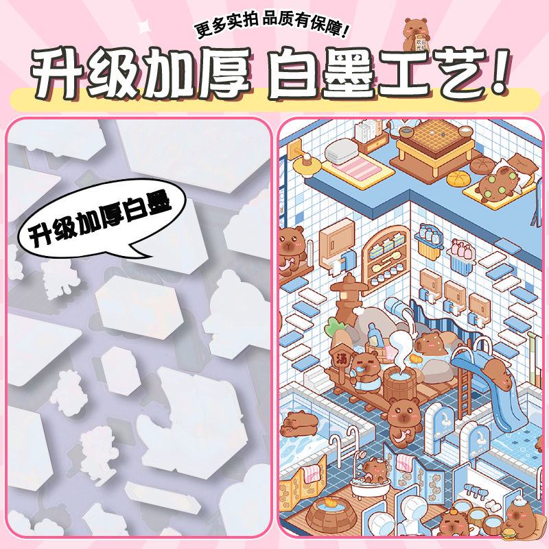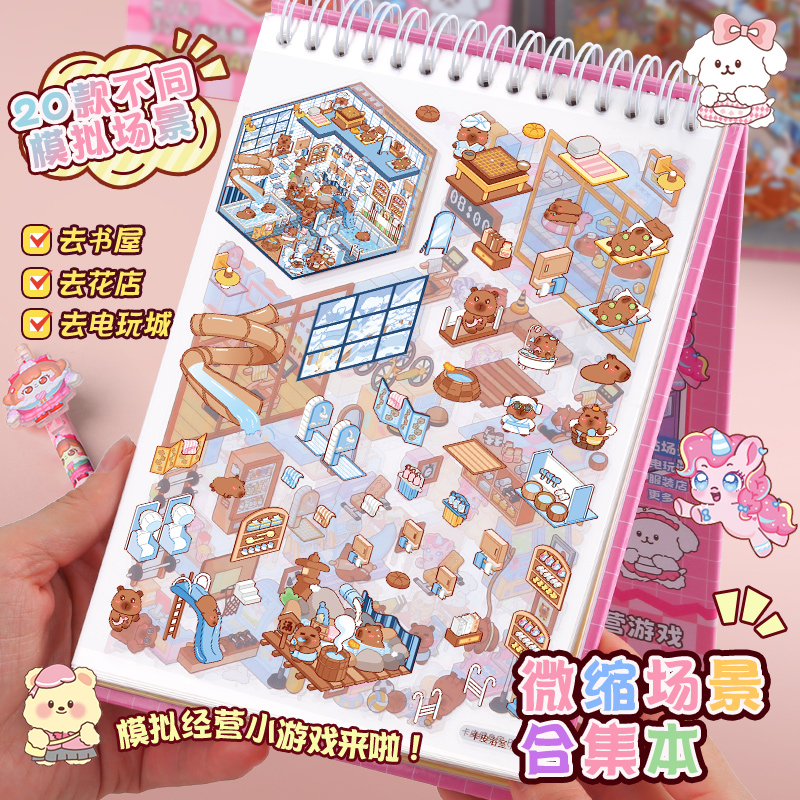 卡皮巴拉微缩场景合集本套装安静书造景场景贴纸贴画3D立体视觉微缩小屋儿童女孩童益智玩具diy手帐贴纸装饰