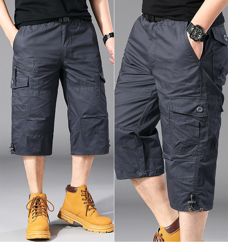 夏季纯棉七分裤男宽松大码工装裤纯色西裤男多口袋马裤男八分中裤