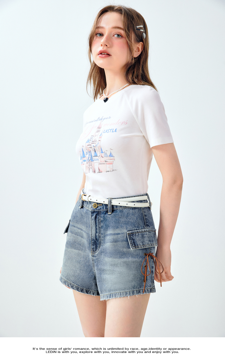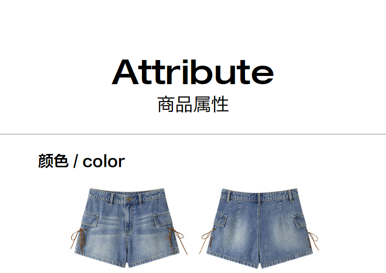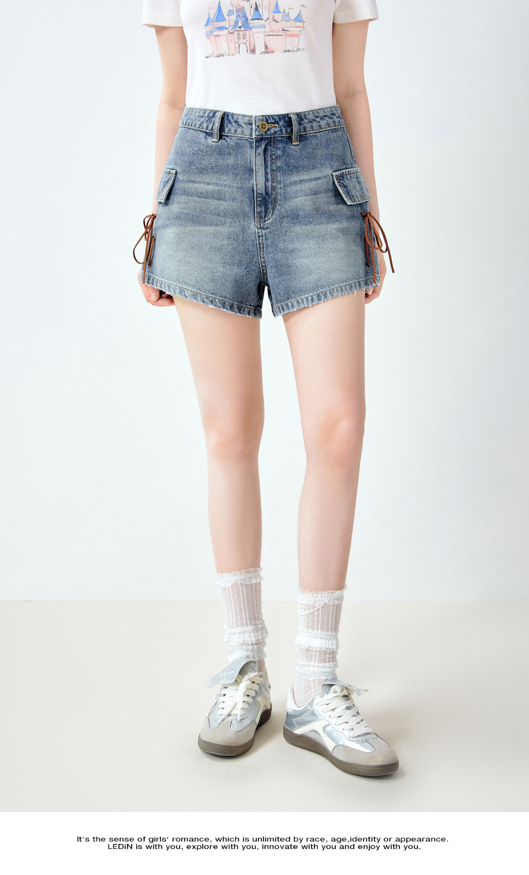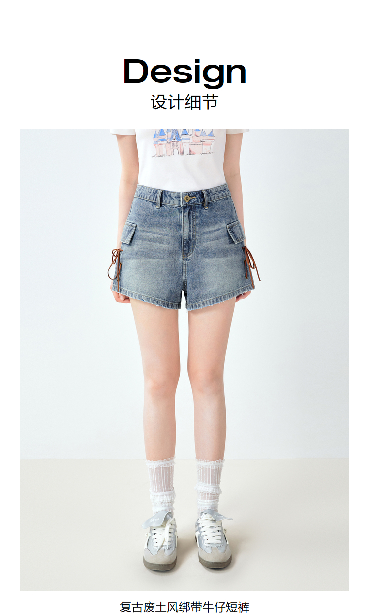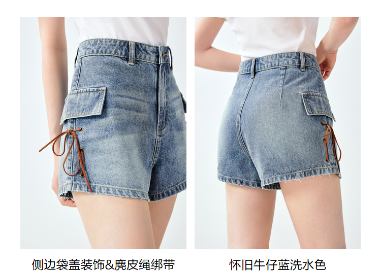 乐町绑带设计牛仔短裤夏季新款怀旧套色洗水色性感辣妹休闲裤子