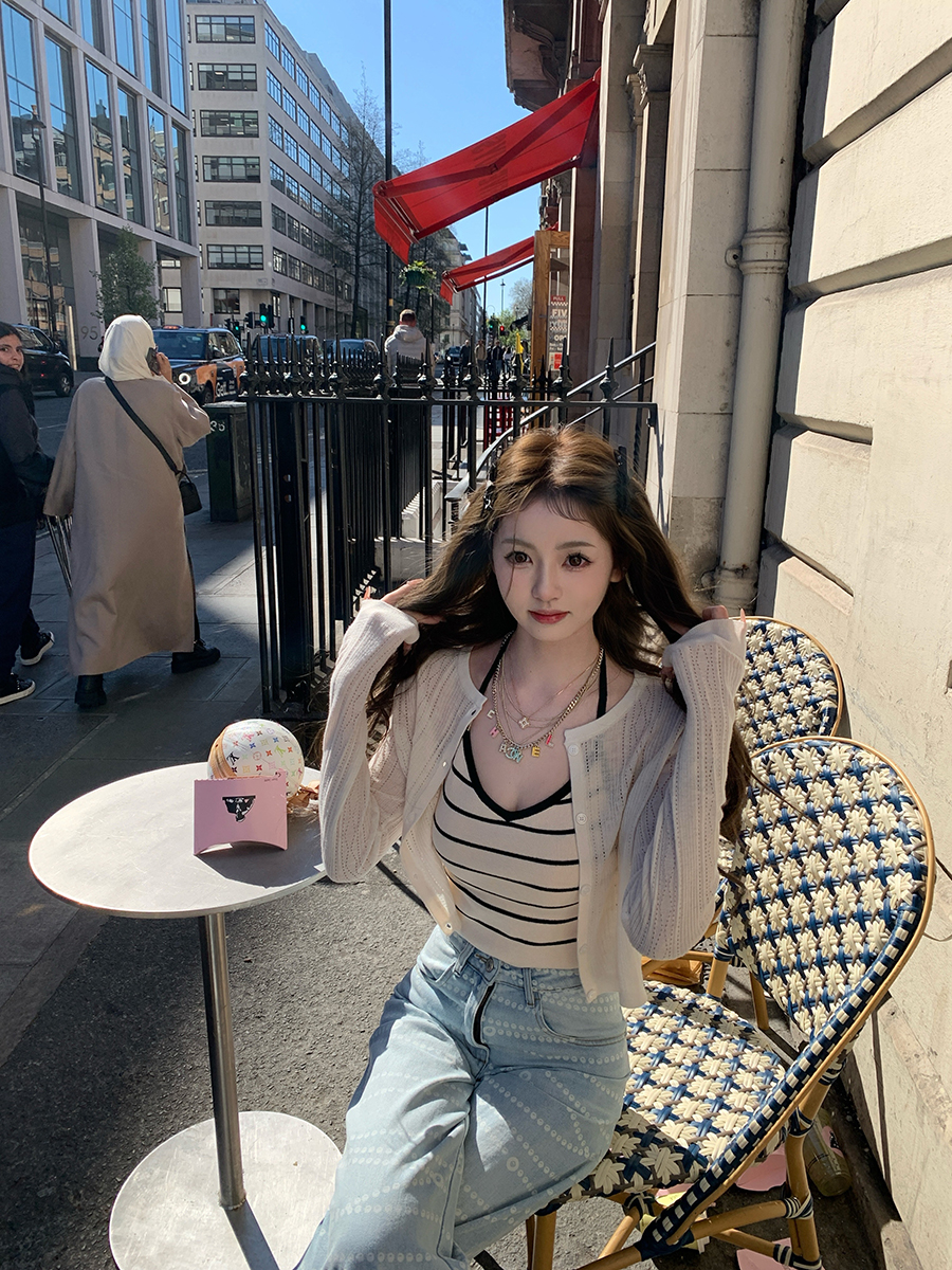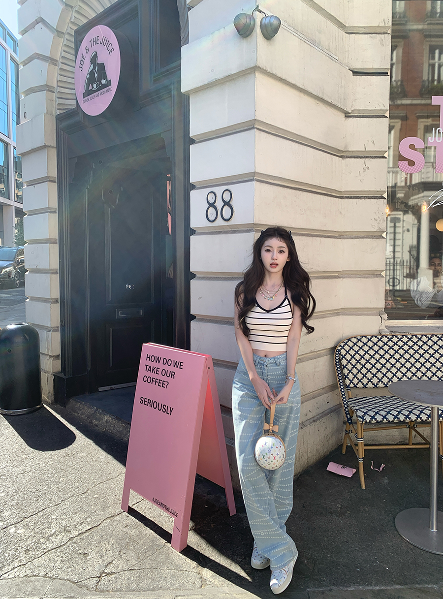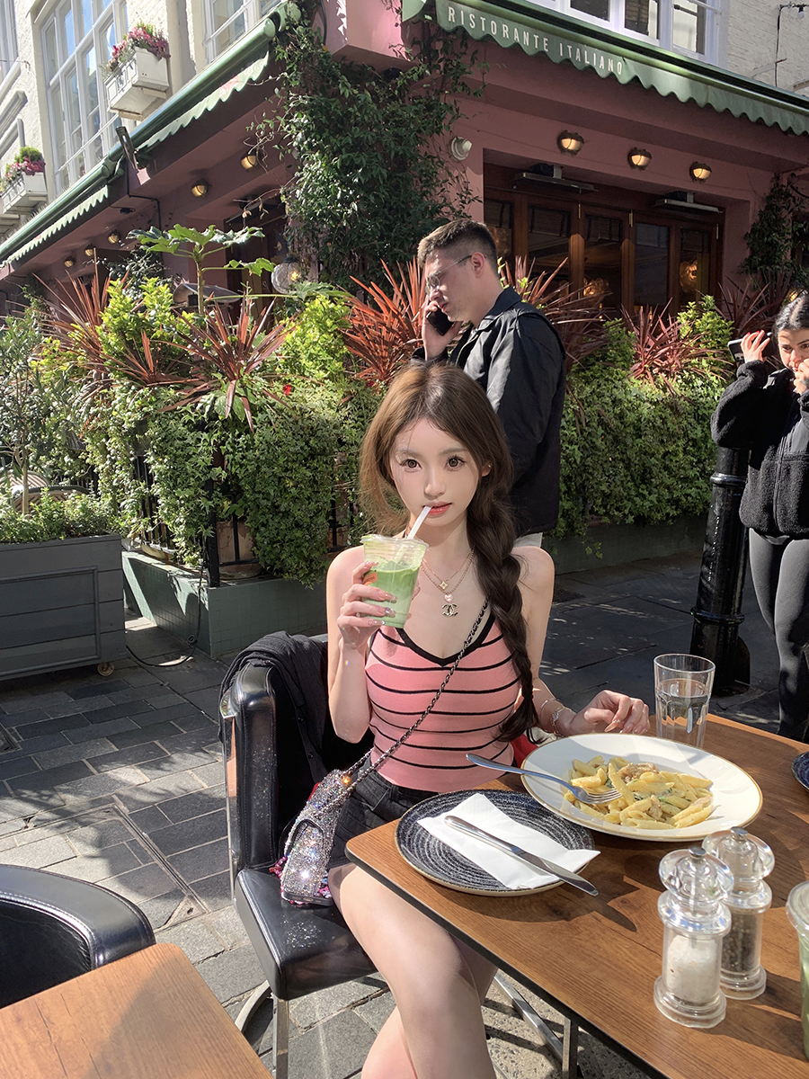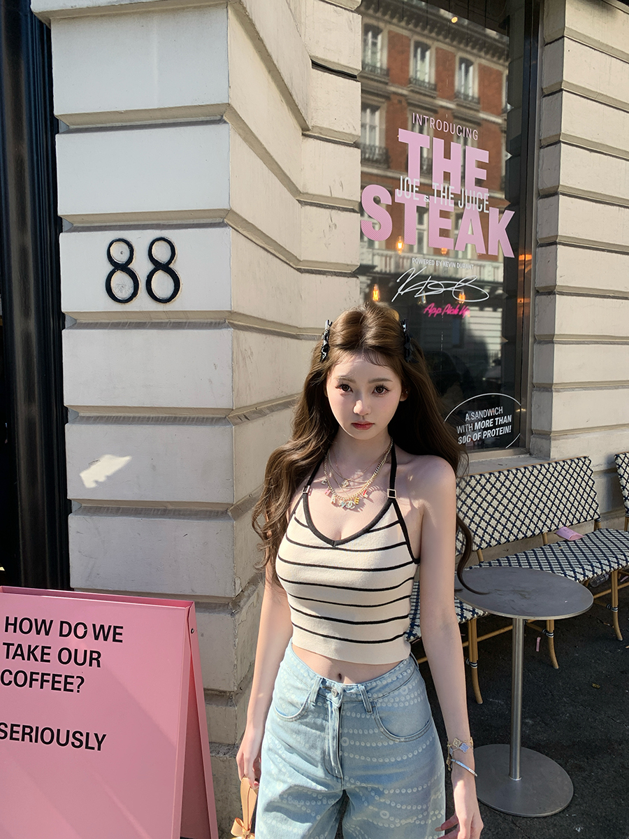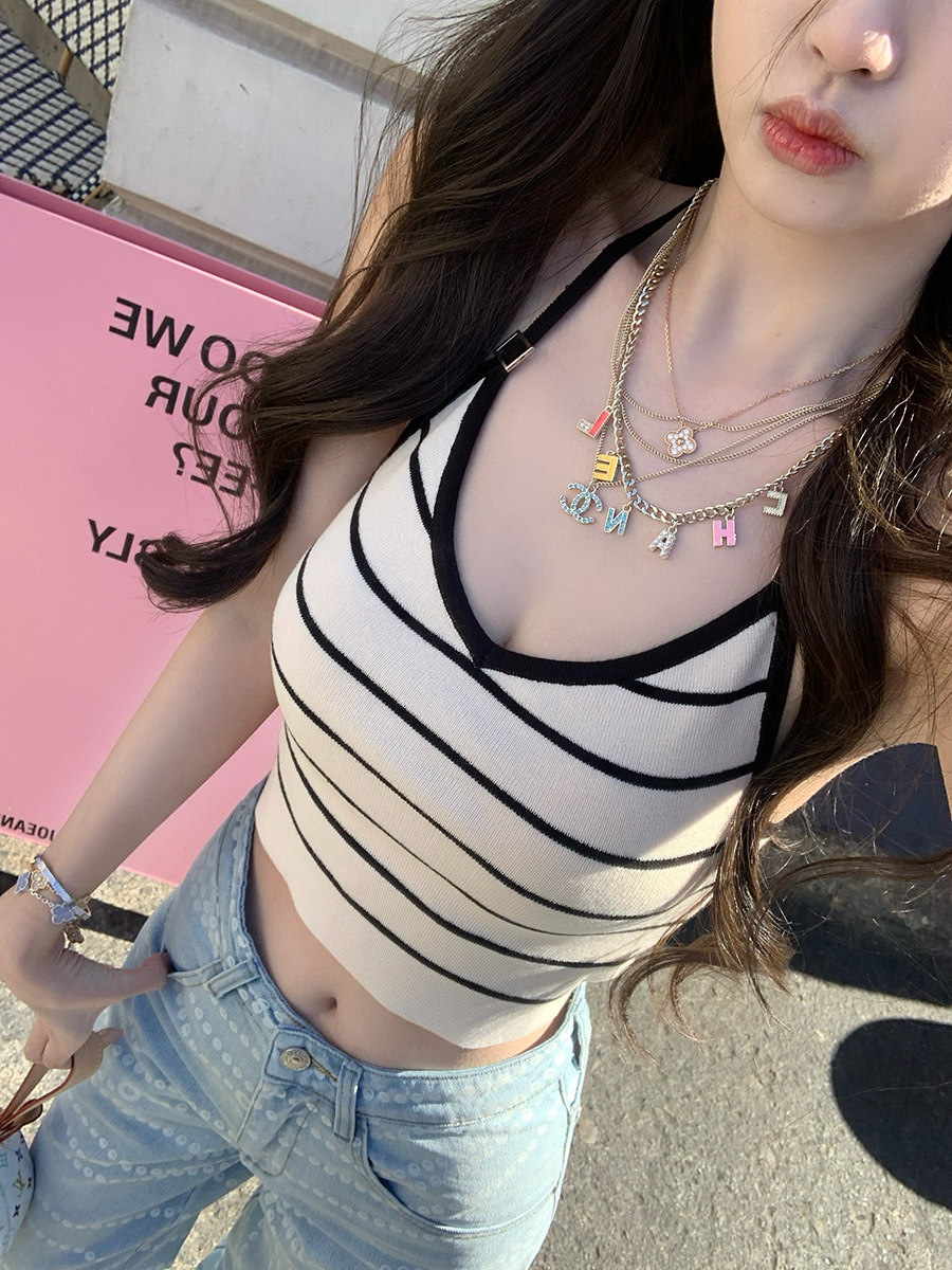你的懒懒llan甜美性感两色条纹挂脖针织吊带上衣女