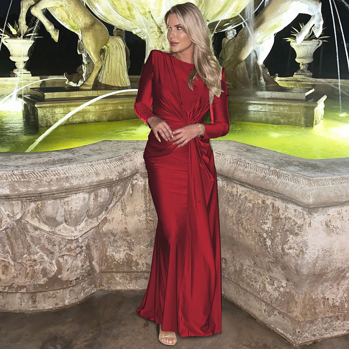 cngirl 欧美女装晚礼服新品时尚气质褶皱修身圆领长袖连衣裙