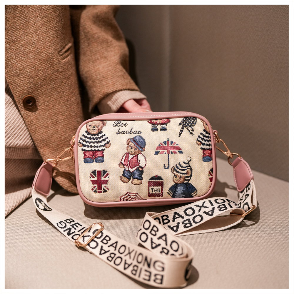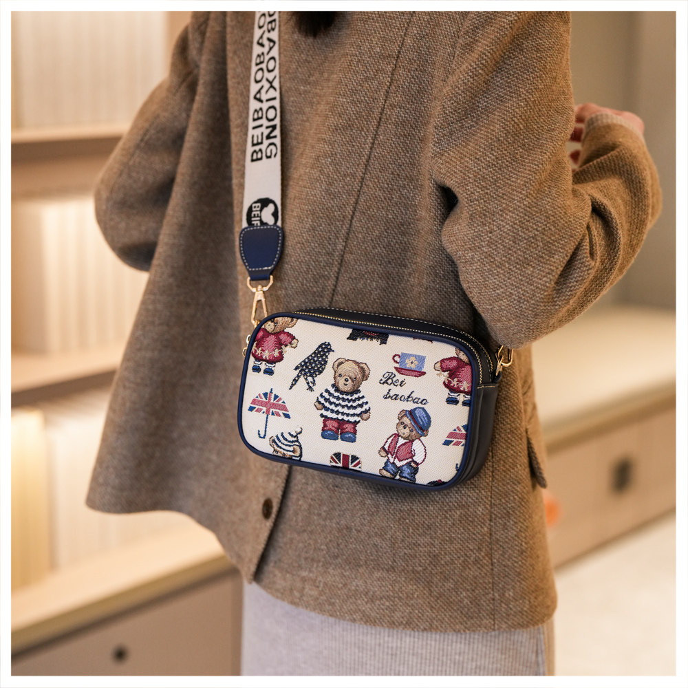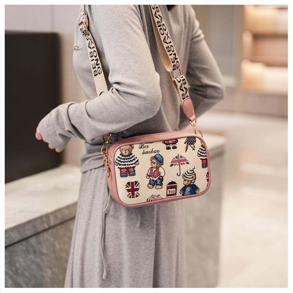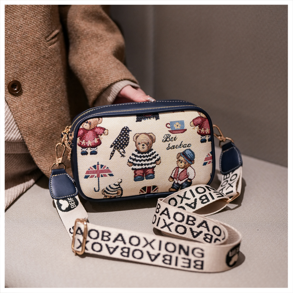 2025新款时尚百搭宽肩带斜挎包女大容量手机包卡通小熊单肩小方包