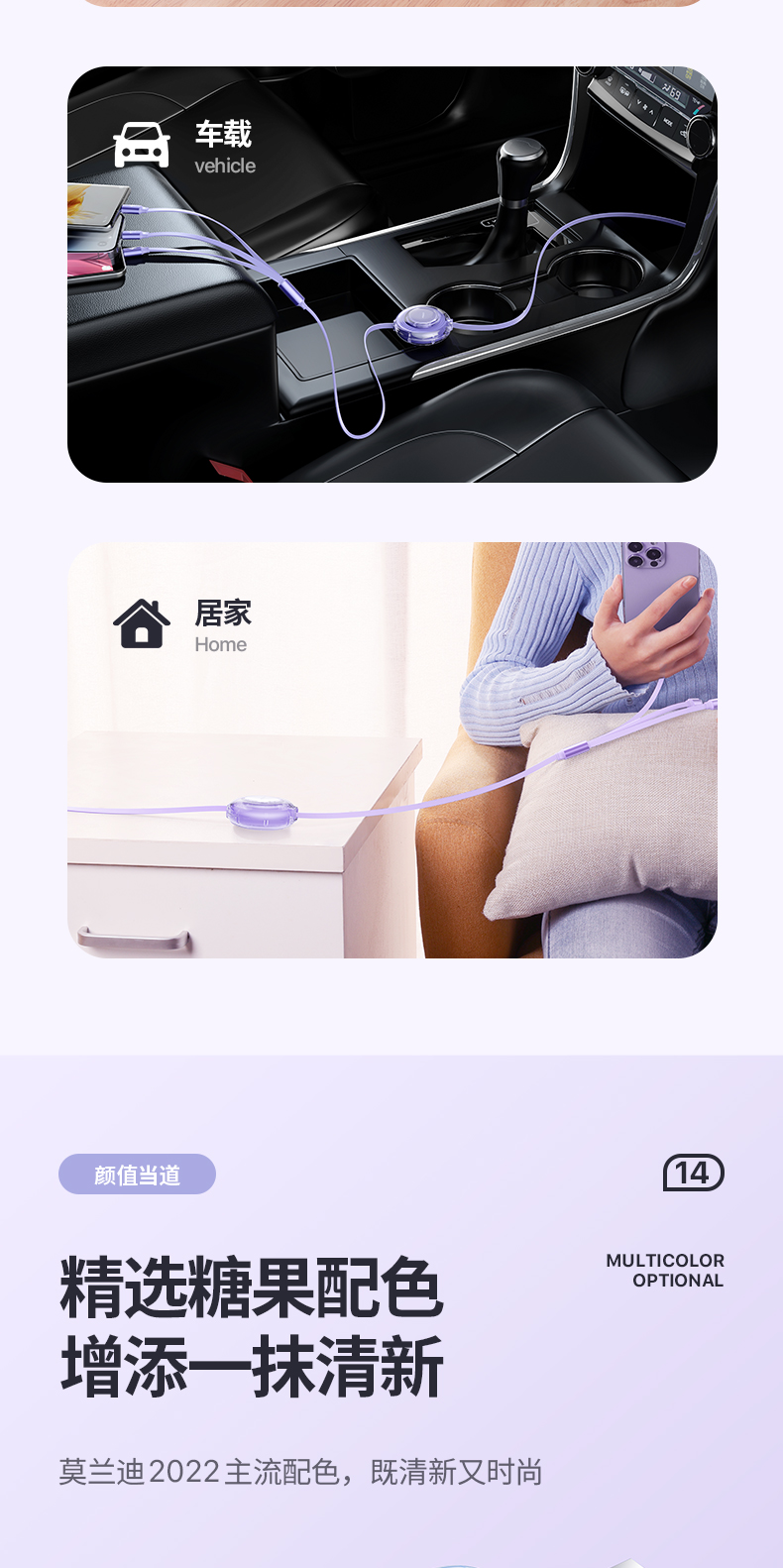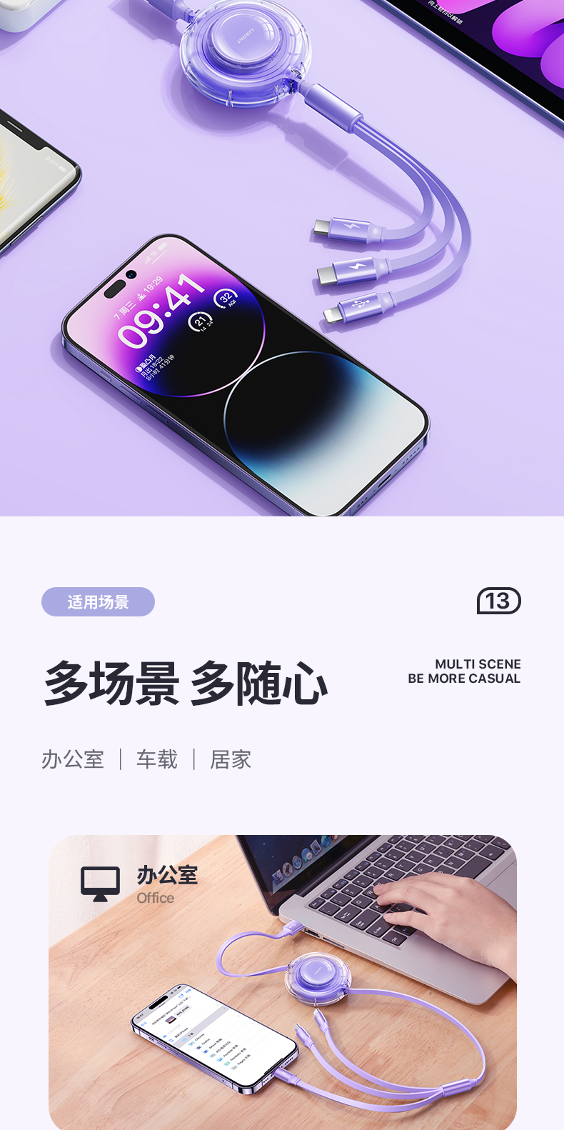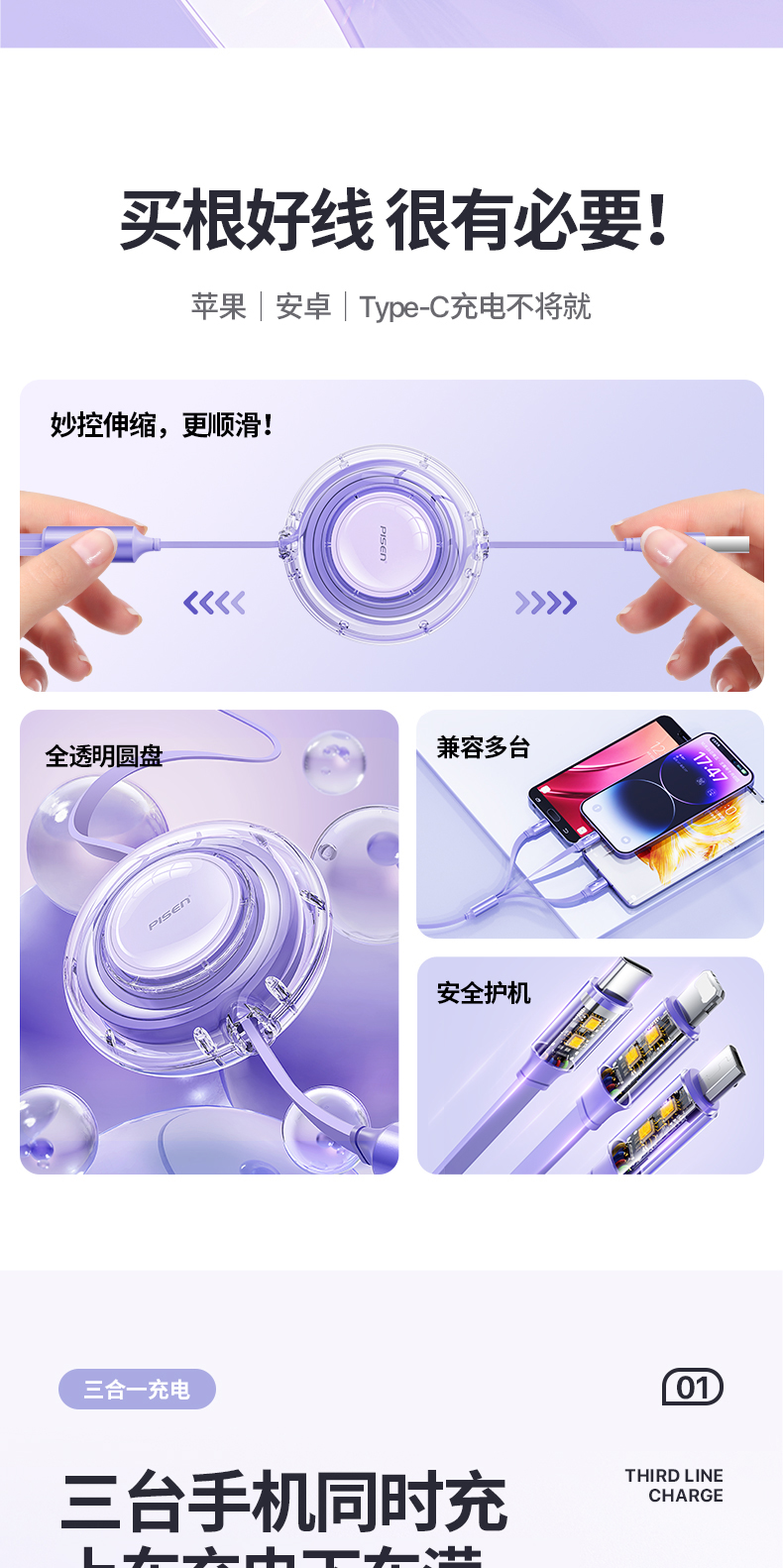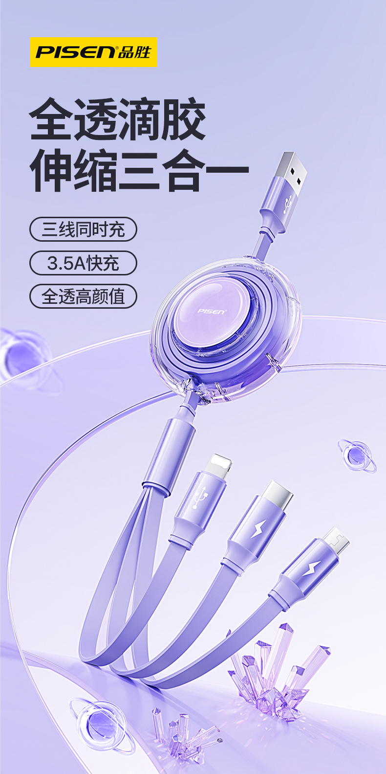 品胜充电线三合一数据线快充一拖三车载100W伸缩多功能三头适用苹果iPhone16安卓typec手机平板ipad多头66W
