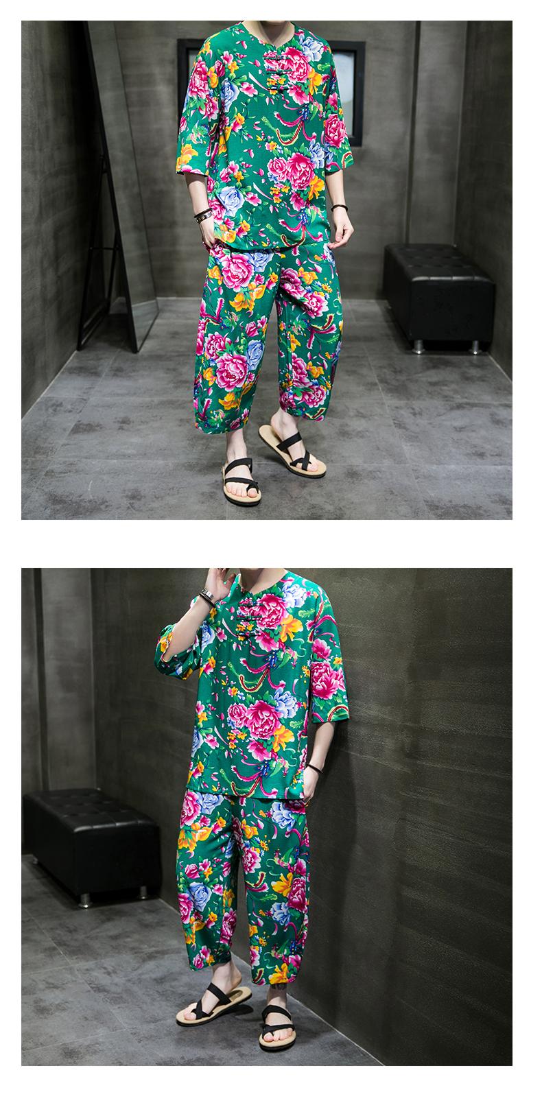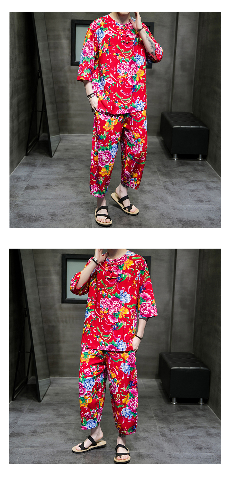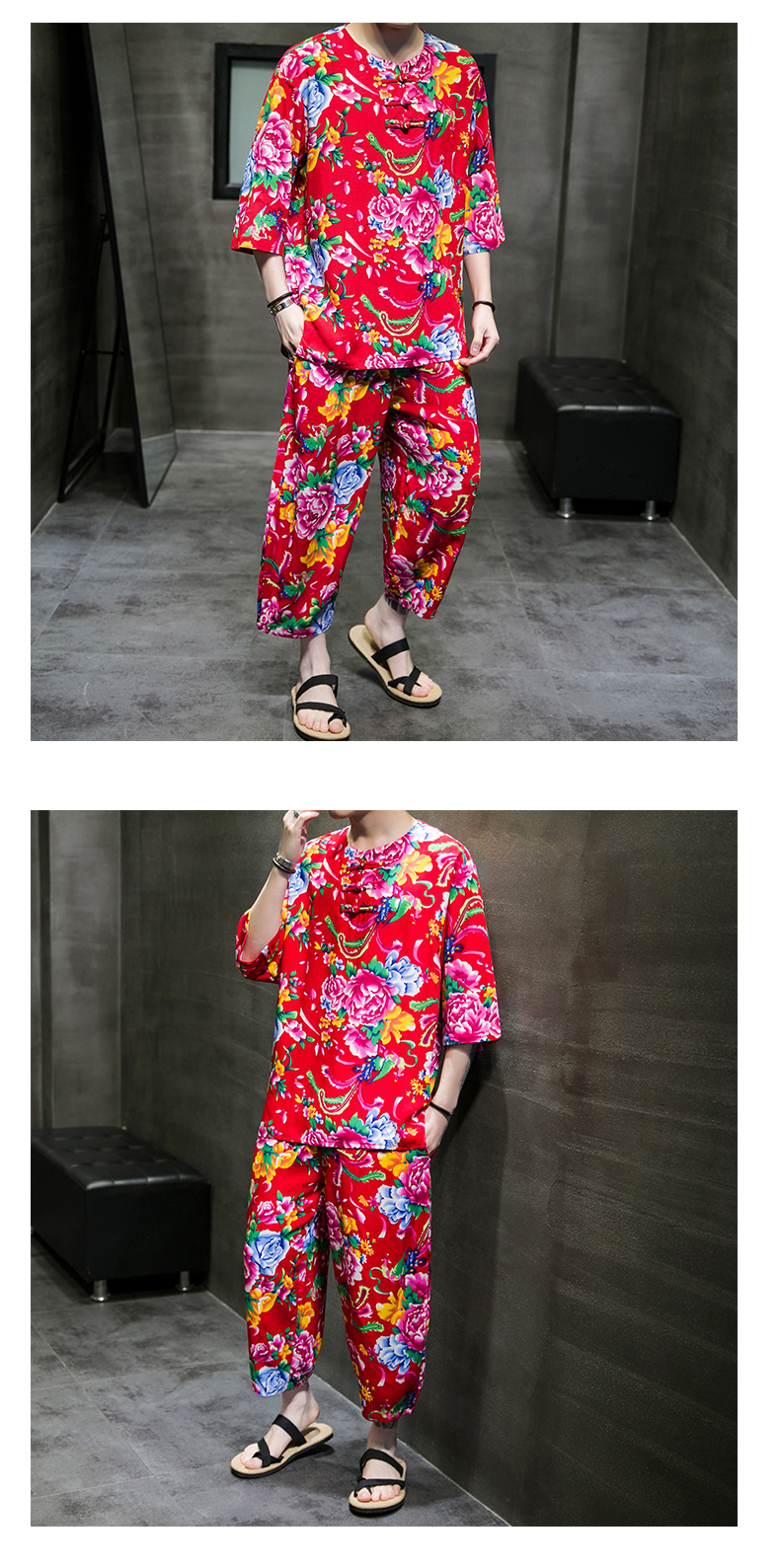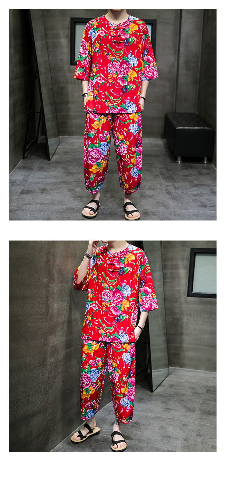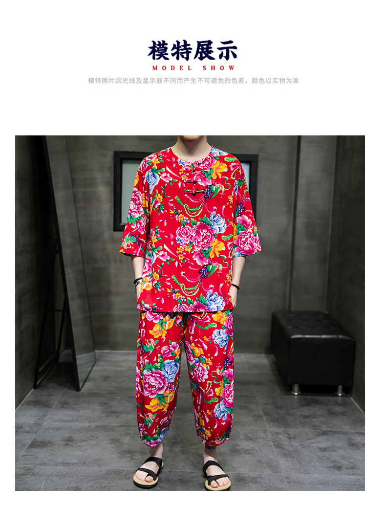东北大花布民族风男士短袖睡衣网红同款洋气中国风家居服可外穿