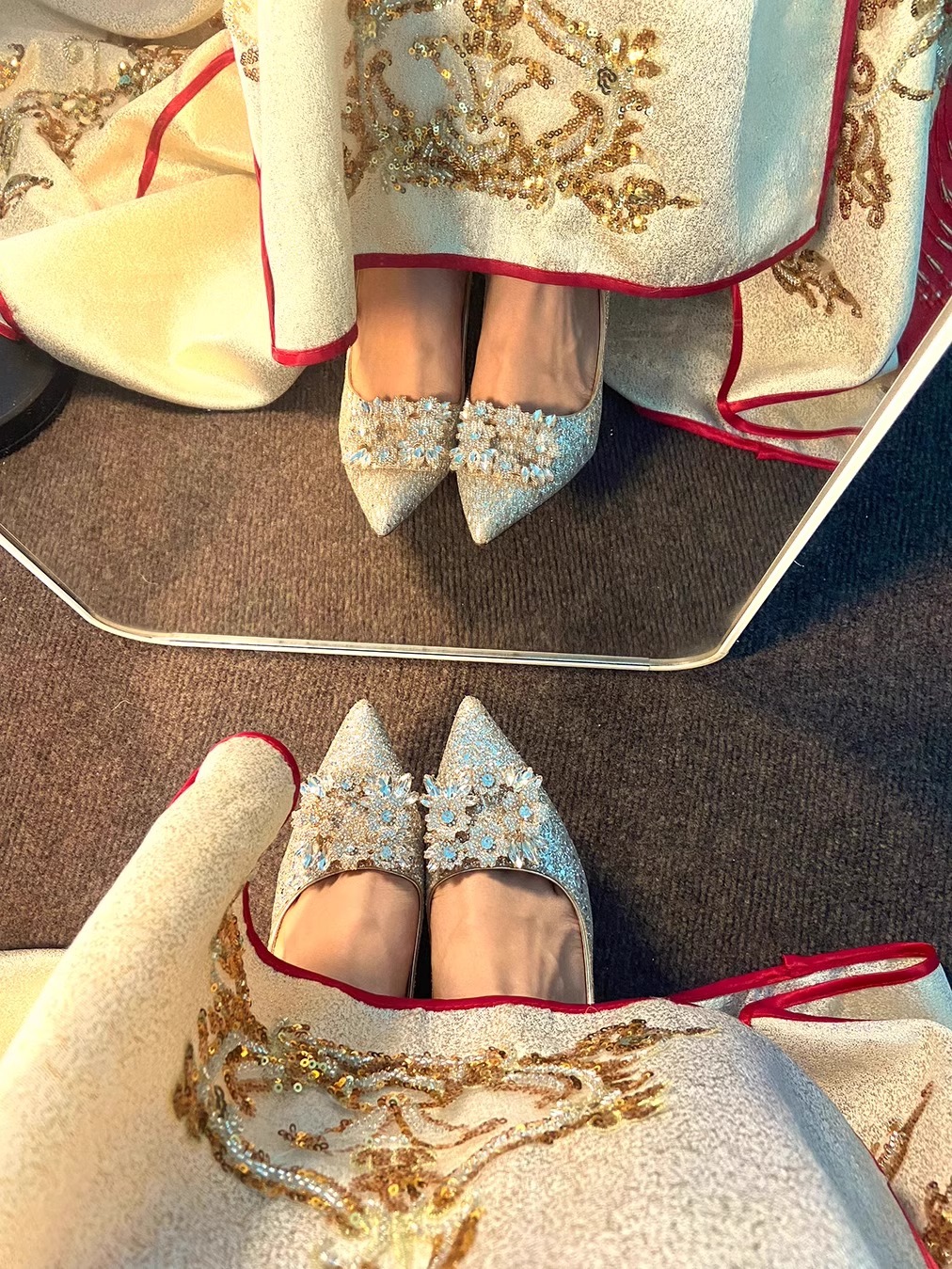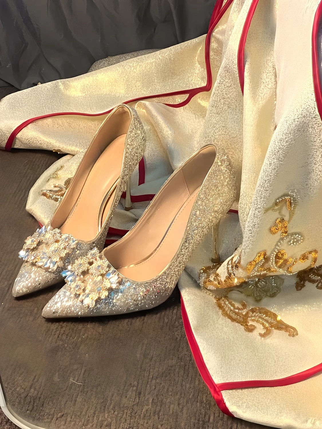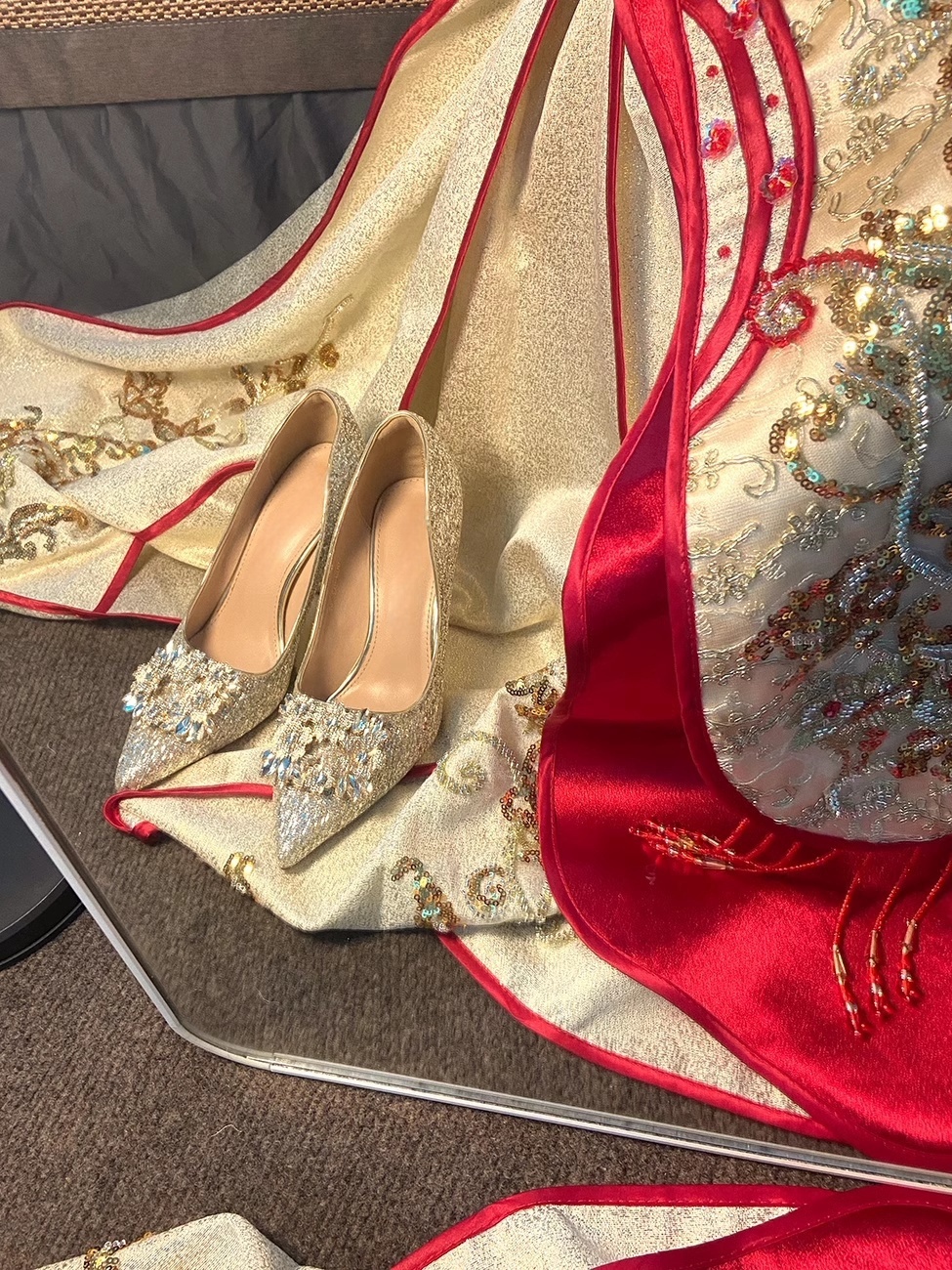 婚鞋秀禾婚纱两穿水晶鞋新娘鞋女香槟色高跟鞋不累脚尖头单鞋细跟