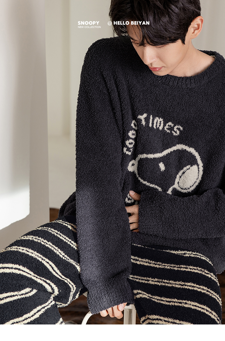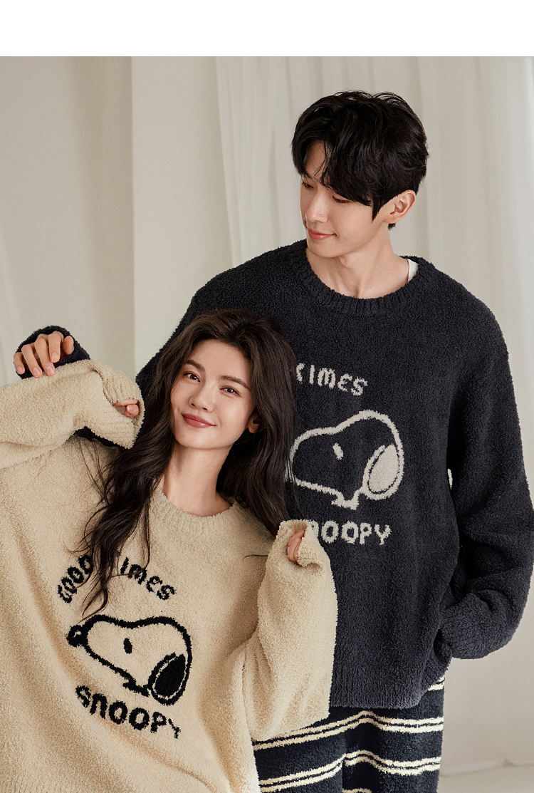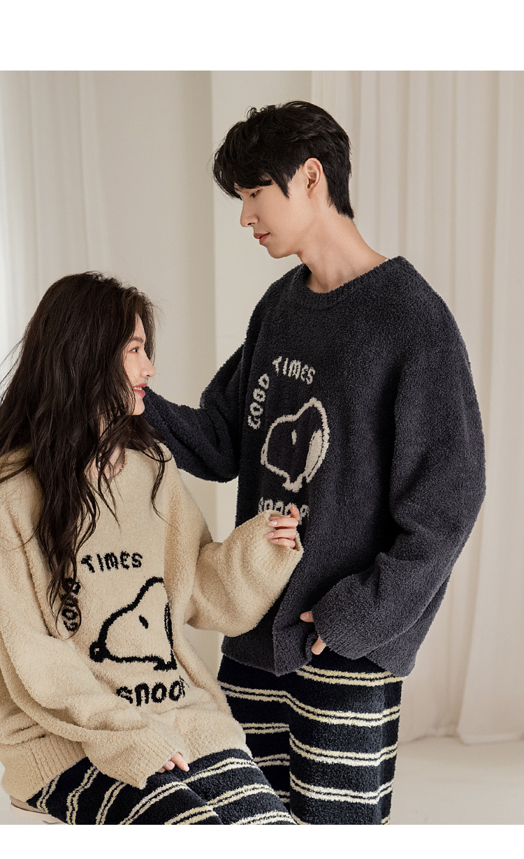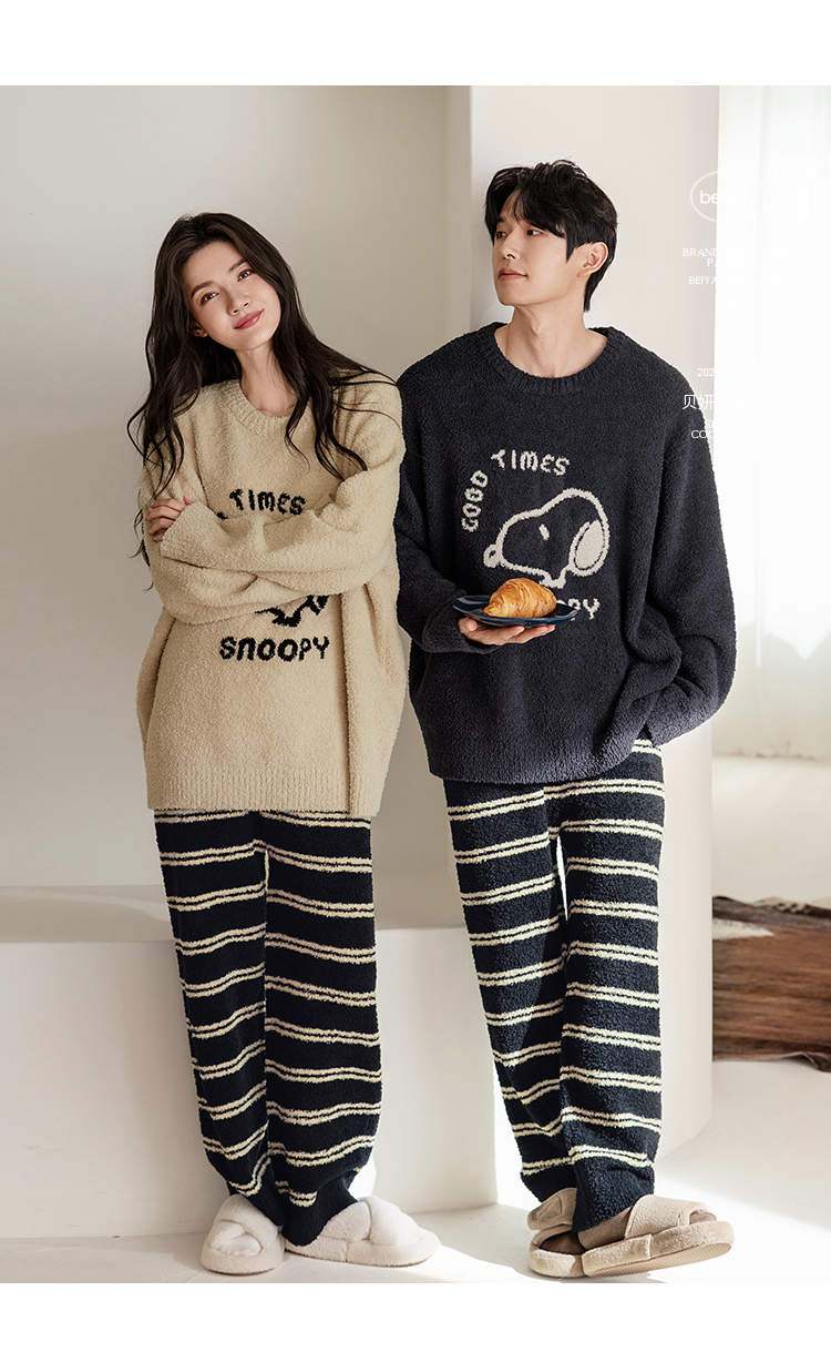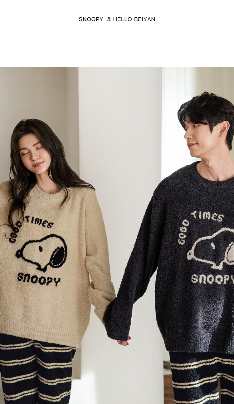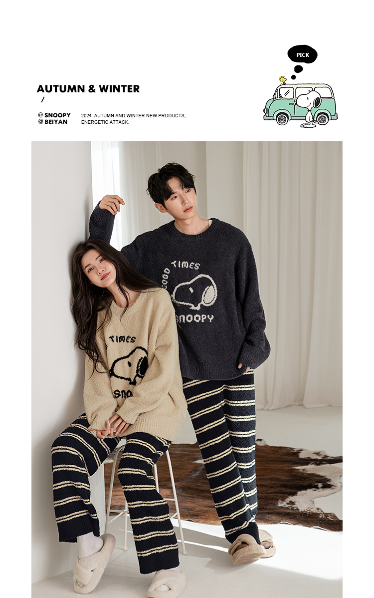 贝妍秋冬季珊瑚绒情侣睡衣女史努比保暖家居服宽松男士半边绒套装