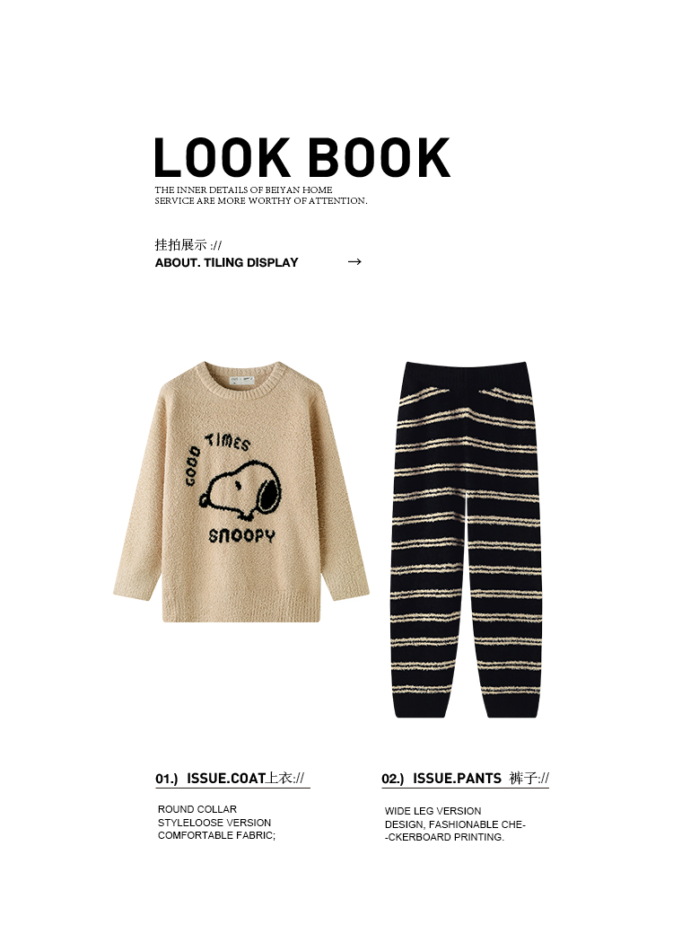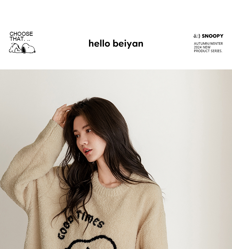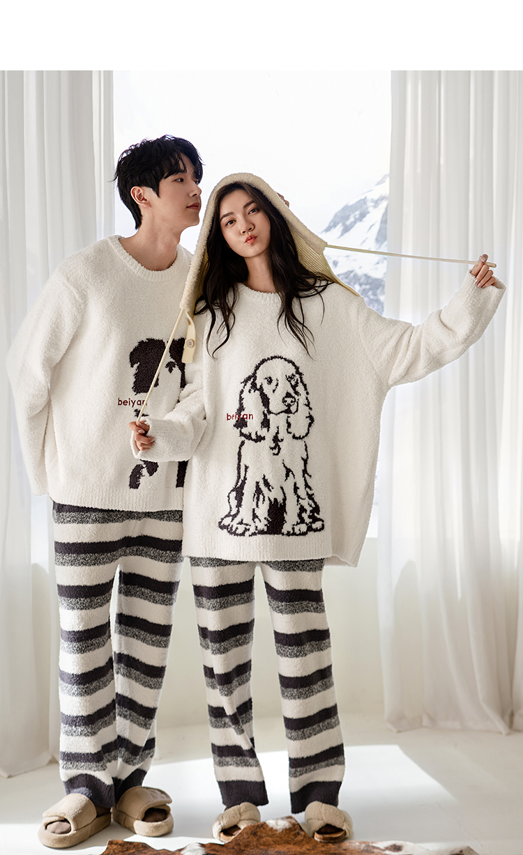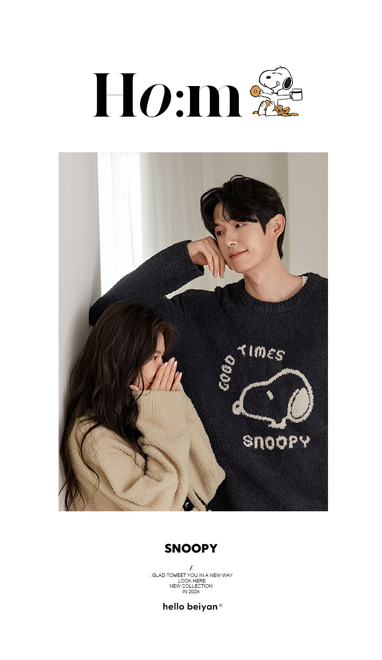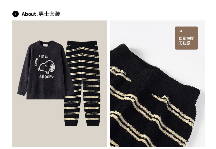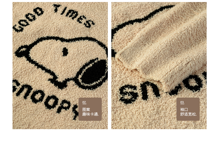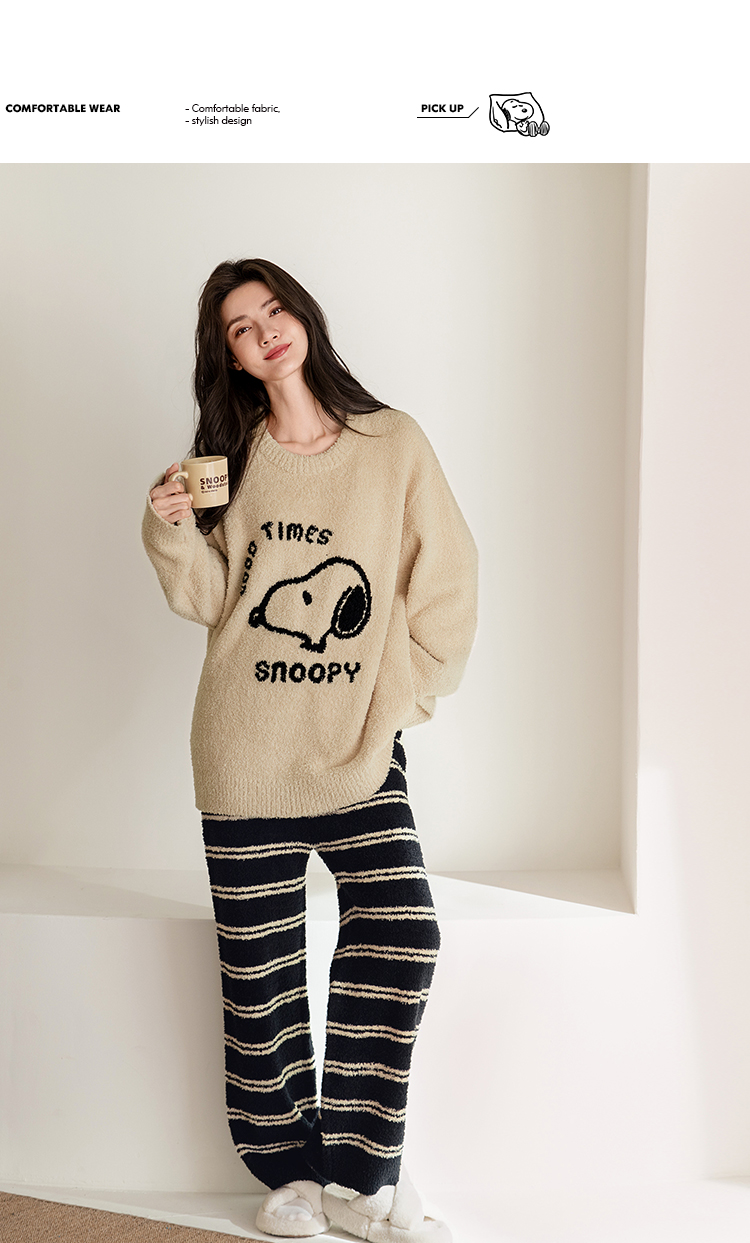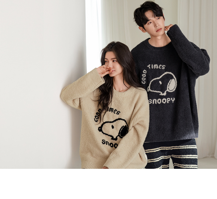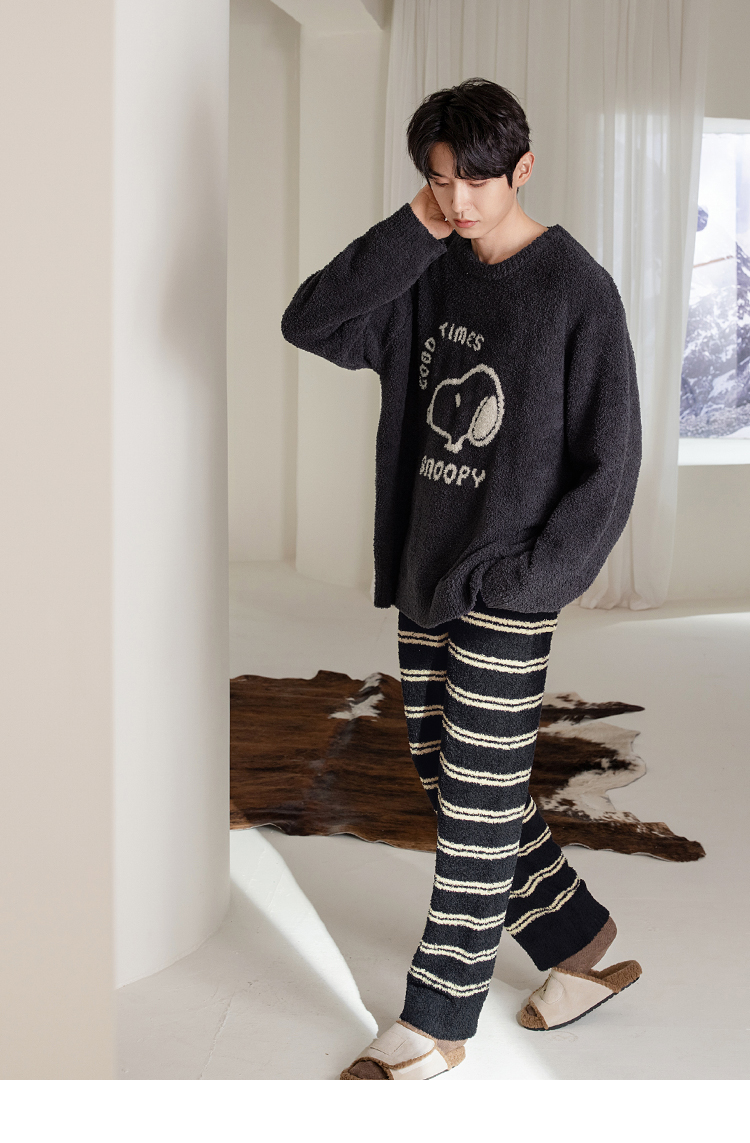 贝妍秋冬季珊瑚绒情侣睡衣女史努比保暖家居服宽松男士半边绒套装