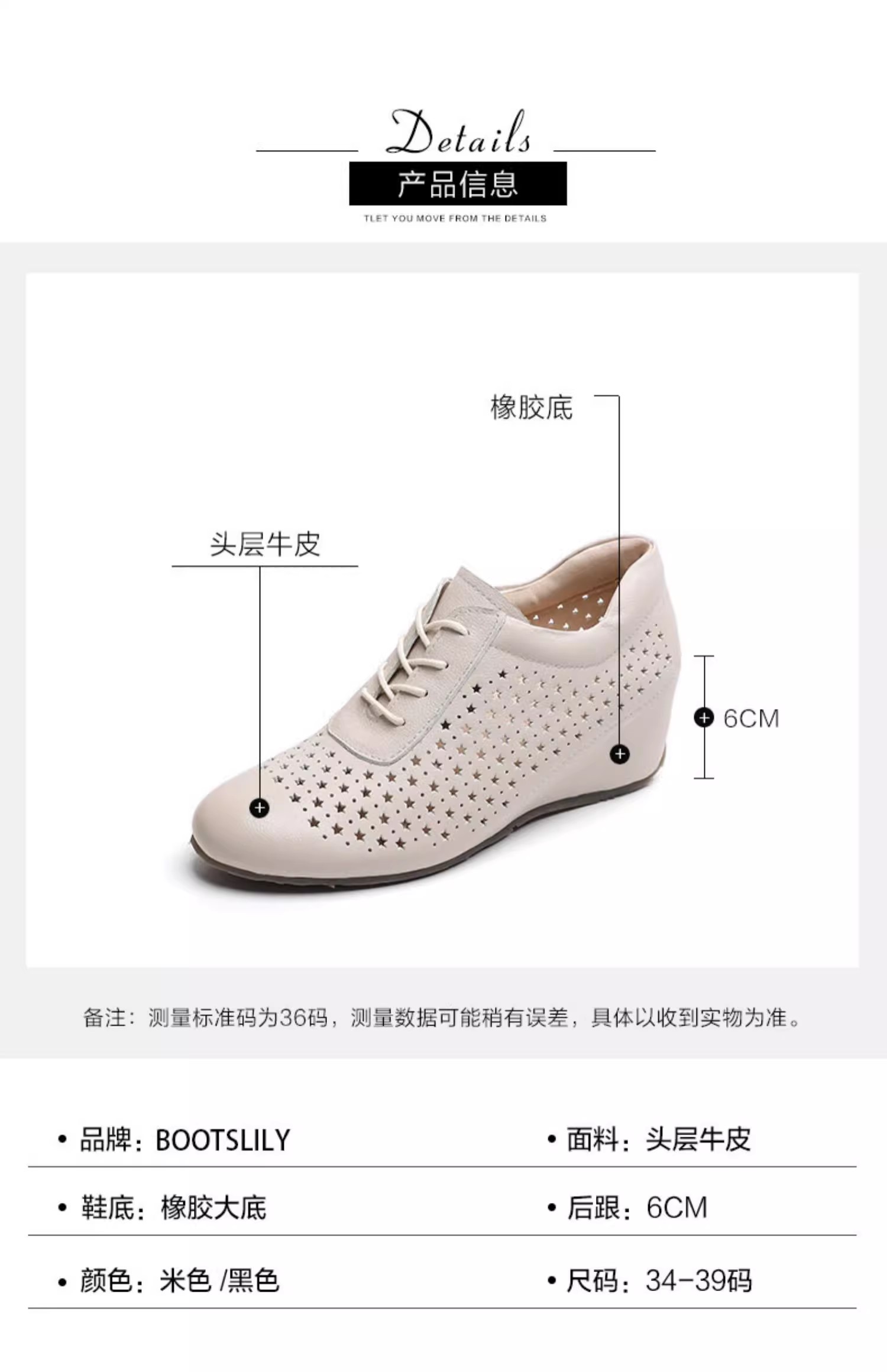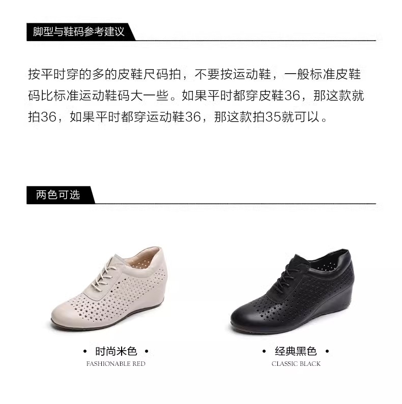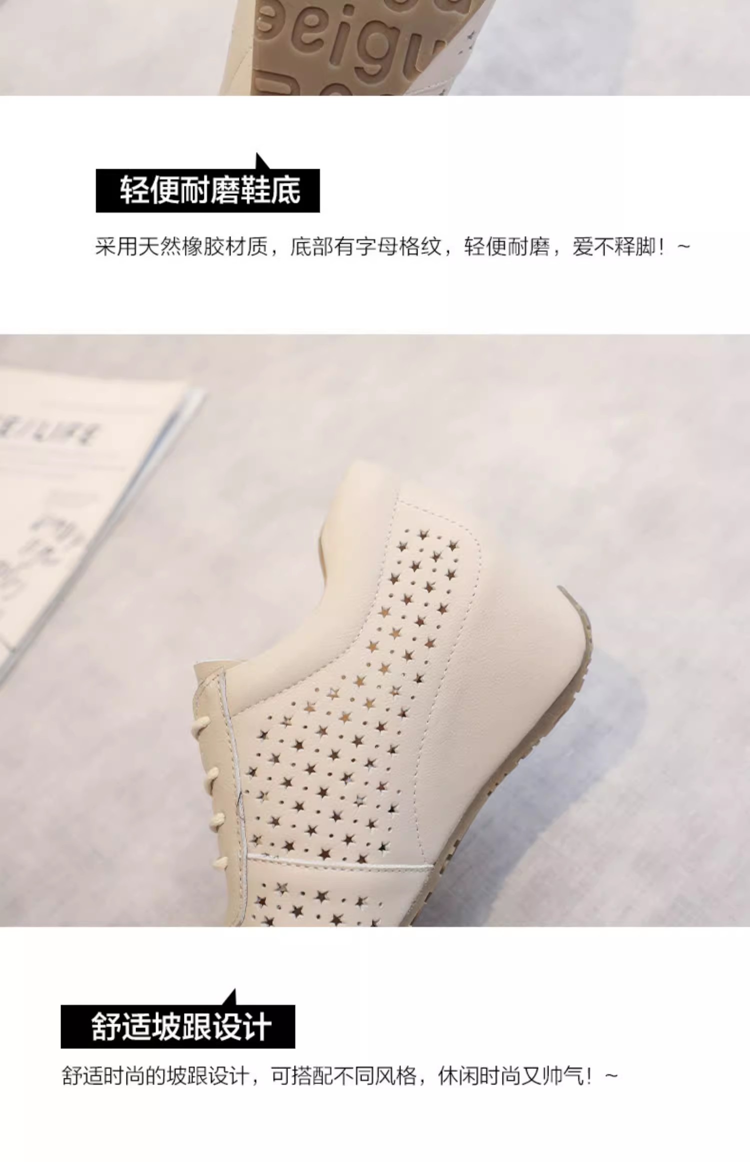坡跟单鞋女舒适软底高跟系带休闲鞋春夏季透气镂空真皮内增高女鞋