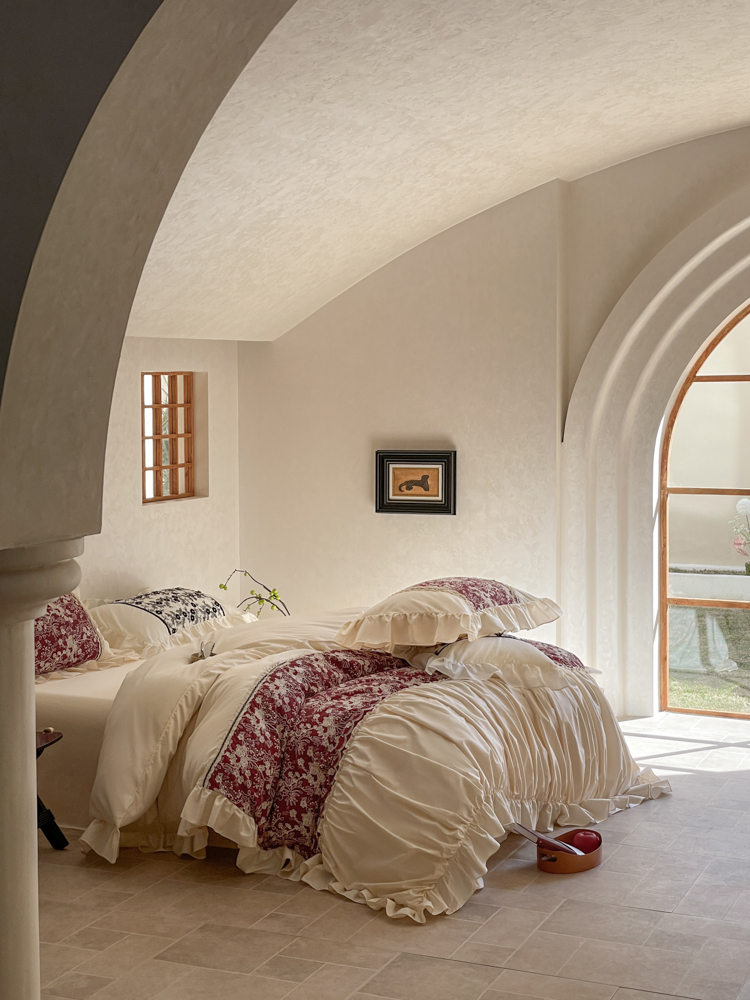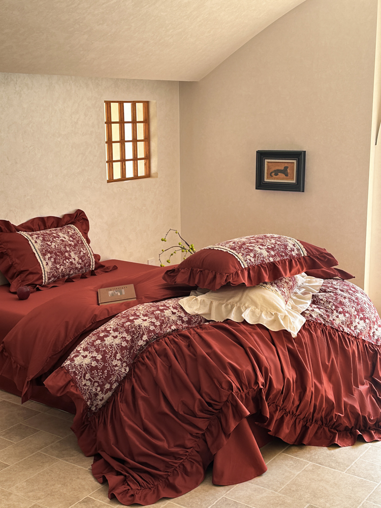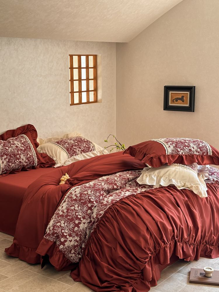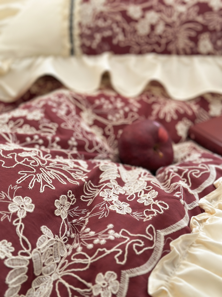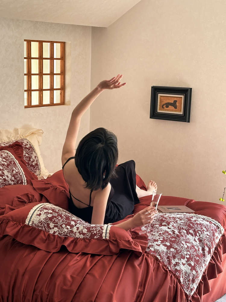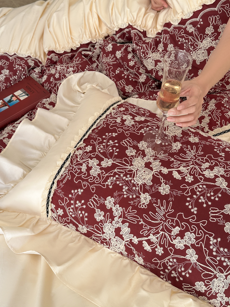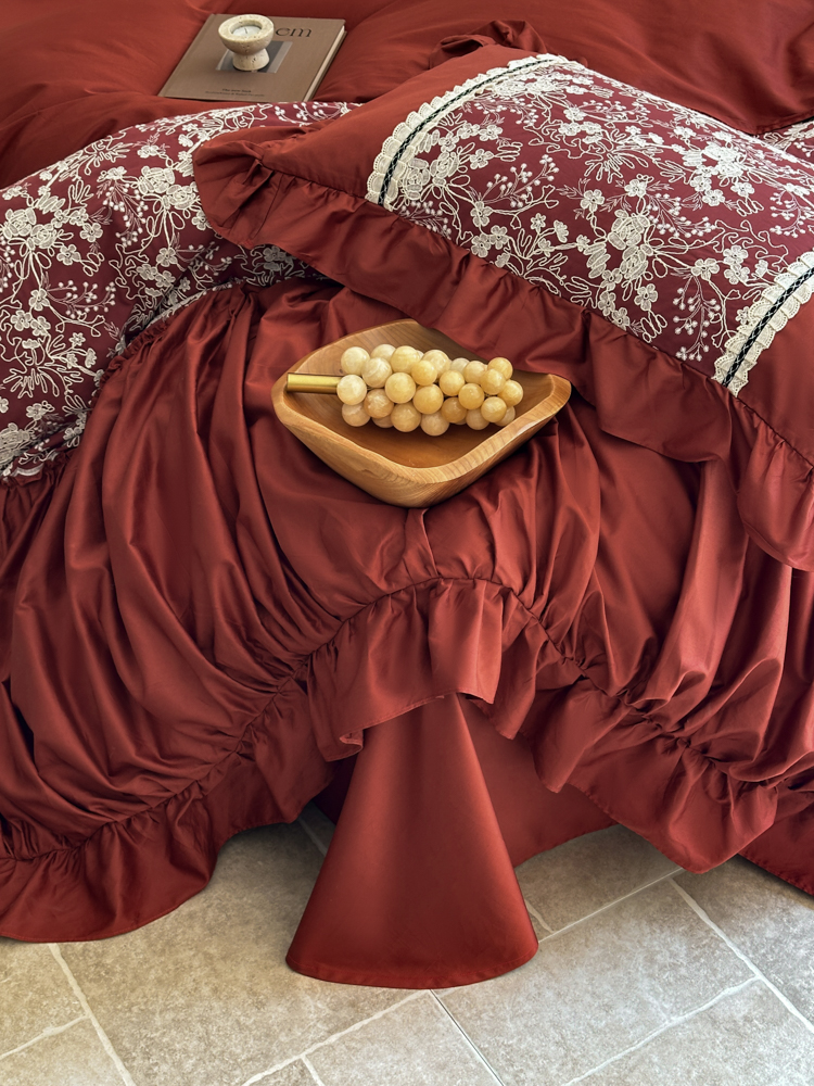法式浪漫婚礼床上用品100支长绒棉刺绣花红色婚庆被套床单四件套