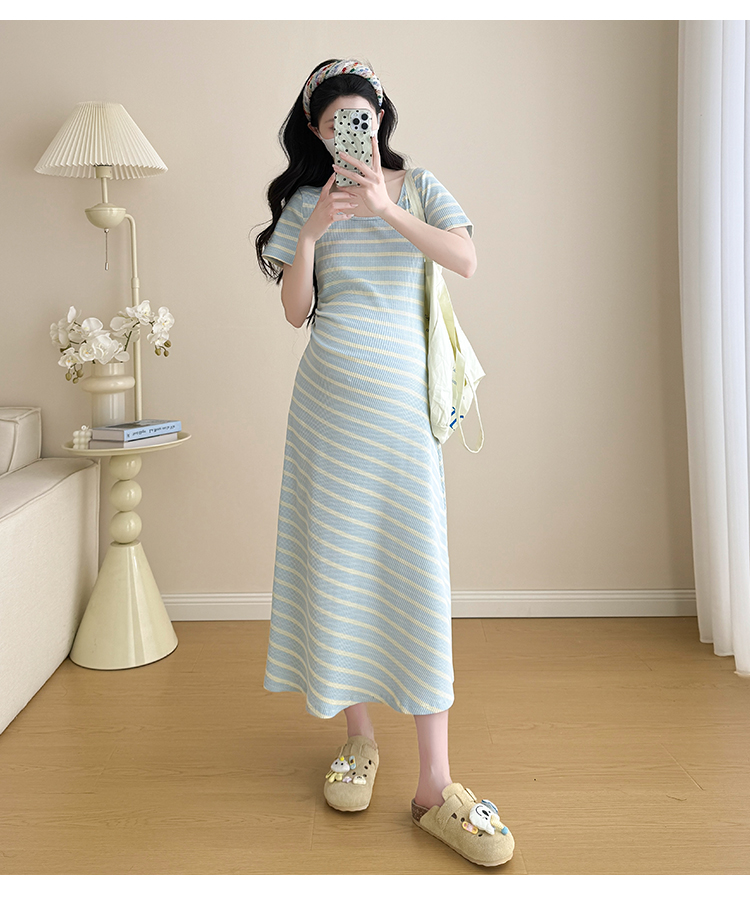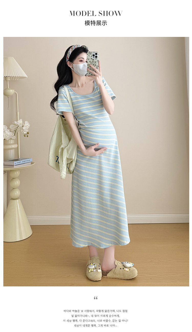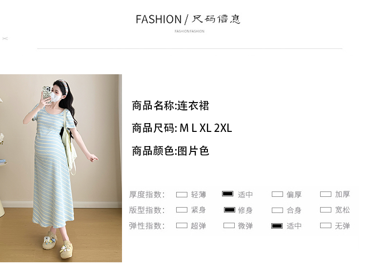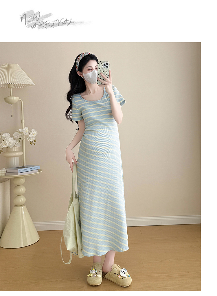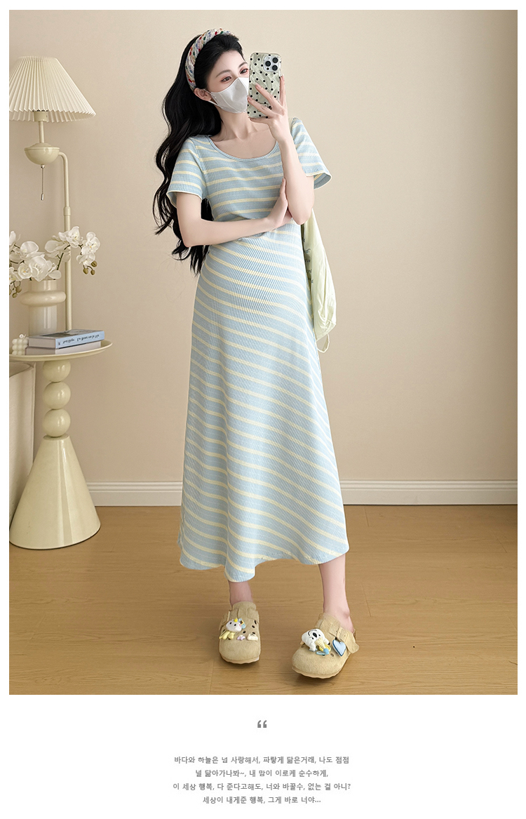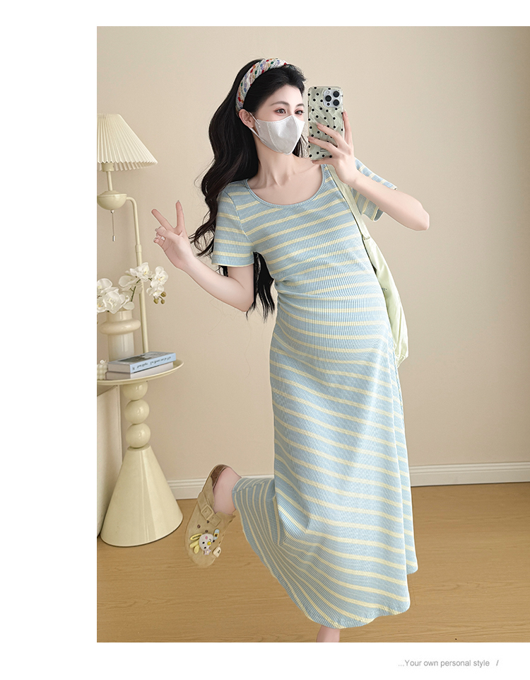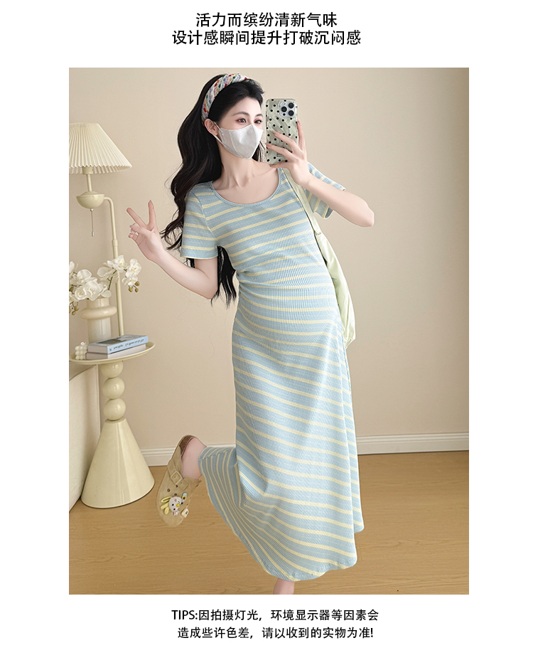 2025孕妇装夏装新款短袖条纹针织长裙百搭孕妇连衣裙潮