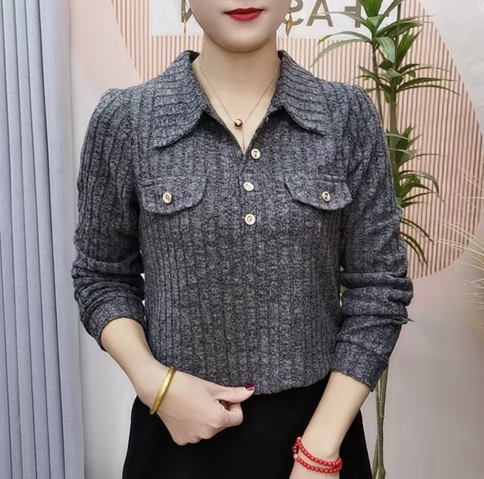 春秋新款时尚长袖衬衫女气质大码显瘦polo领百搭纯色衬衣外套上衣